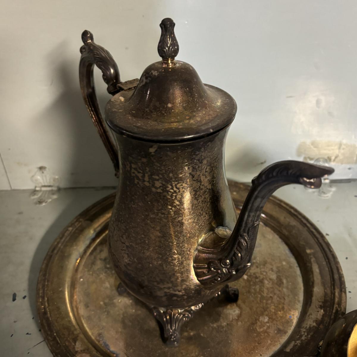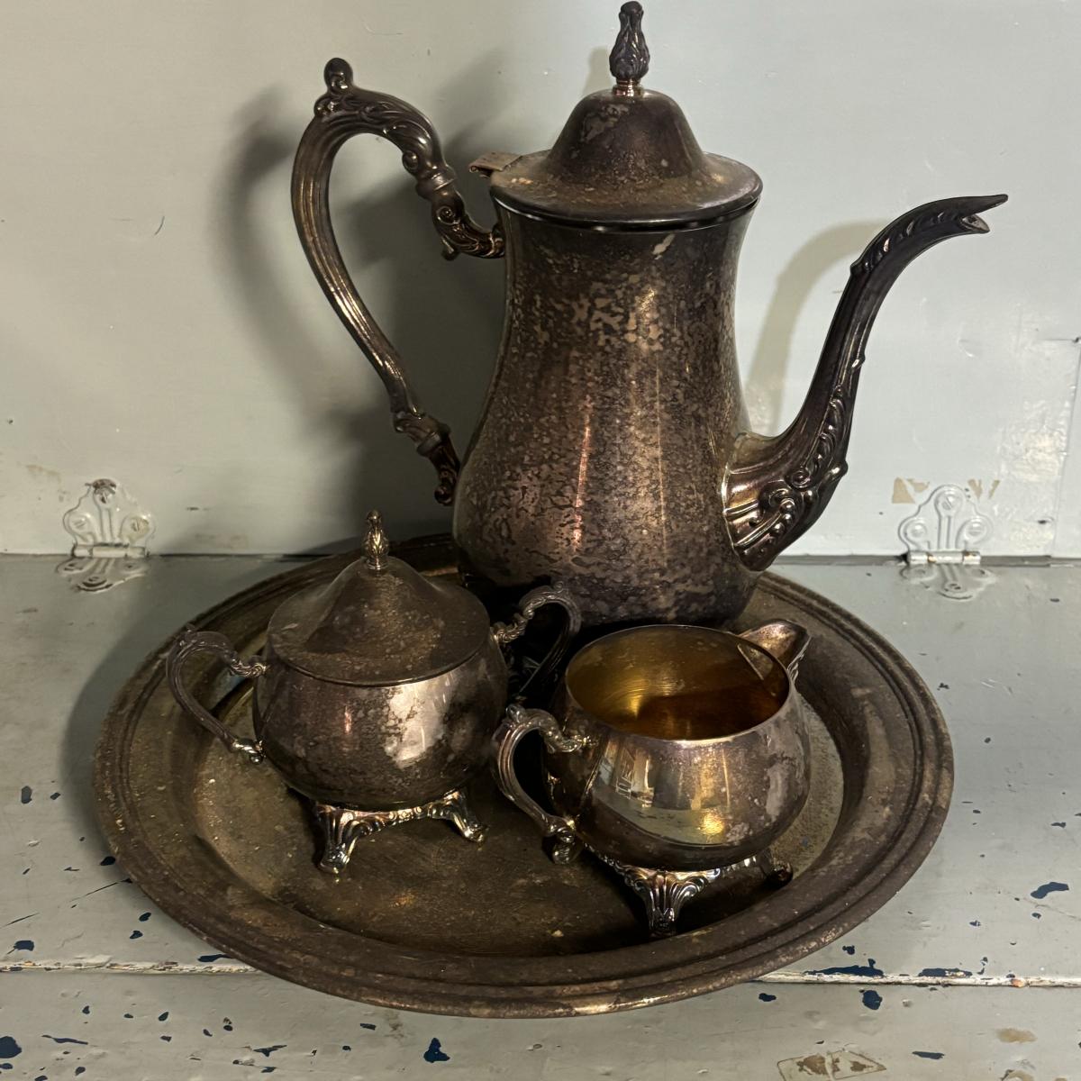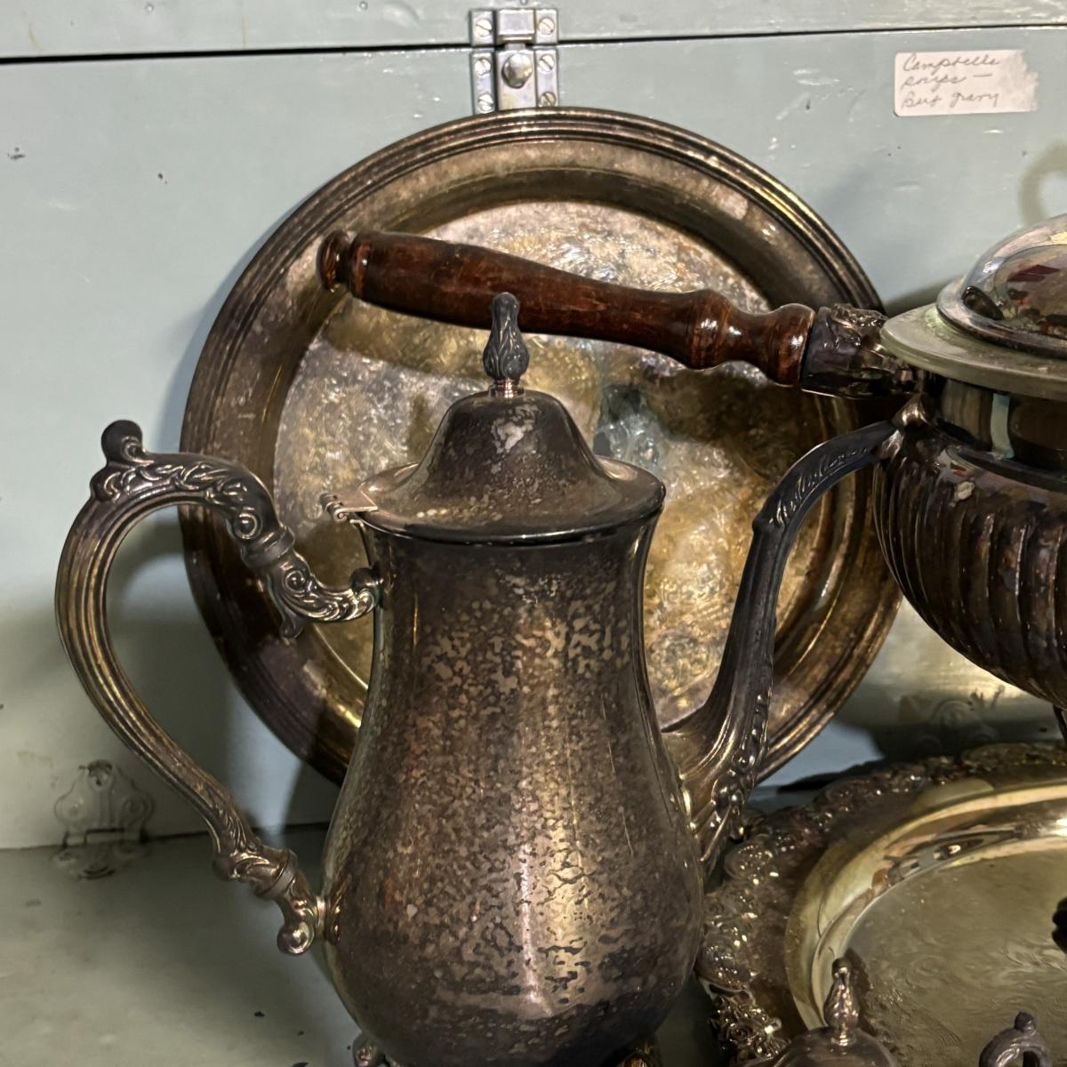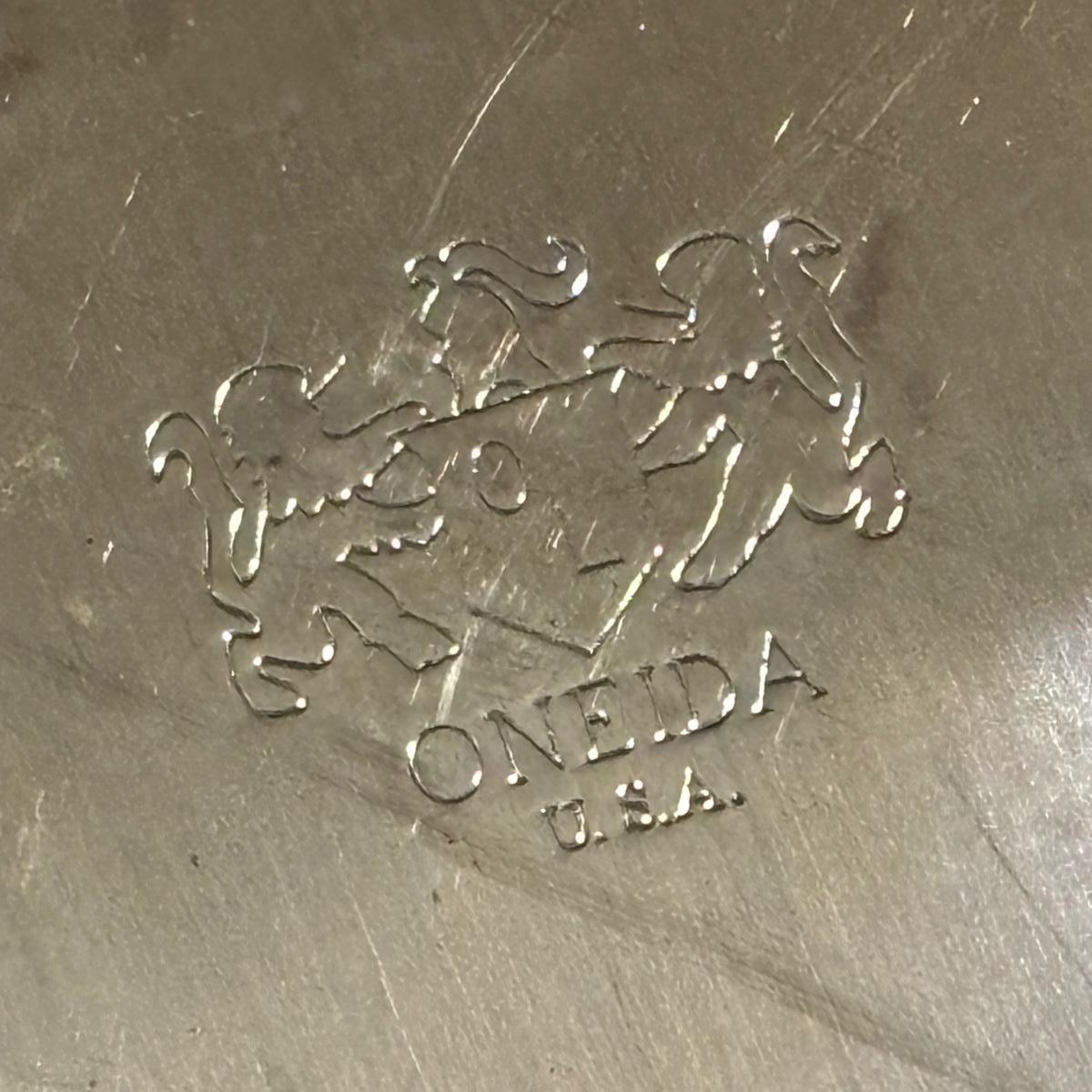 LOT 114: Vintage Oneida Silverplate Chafing Dish with Lid & Liner, Sheridan Silverplate Stand & Burner, Oneida Silverplate Teapot, Sugar Bowl, Creamer & Serving Tray