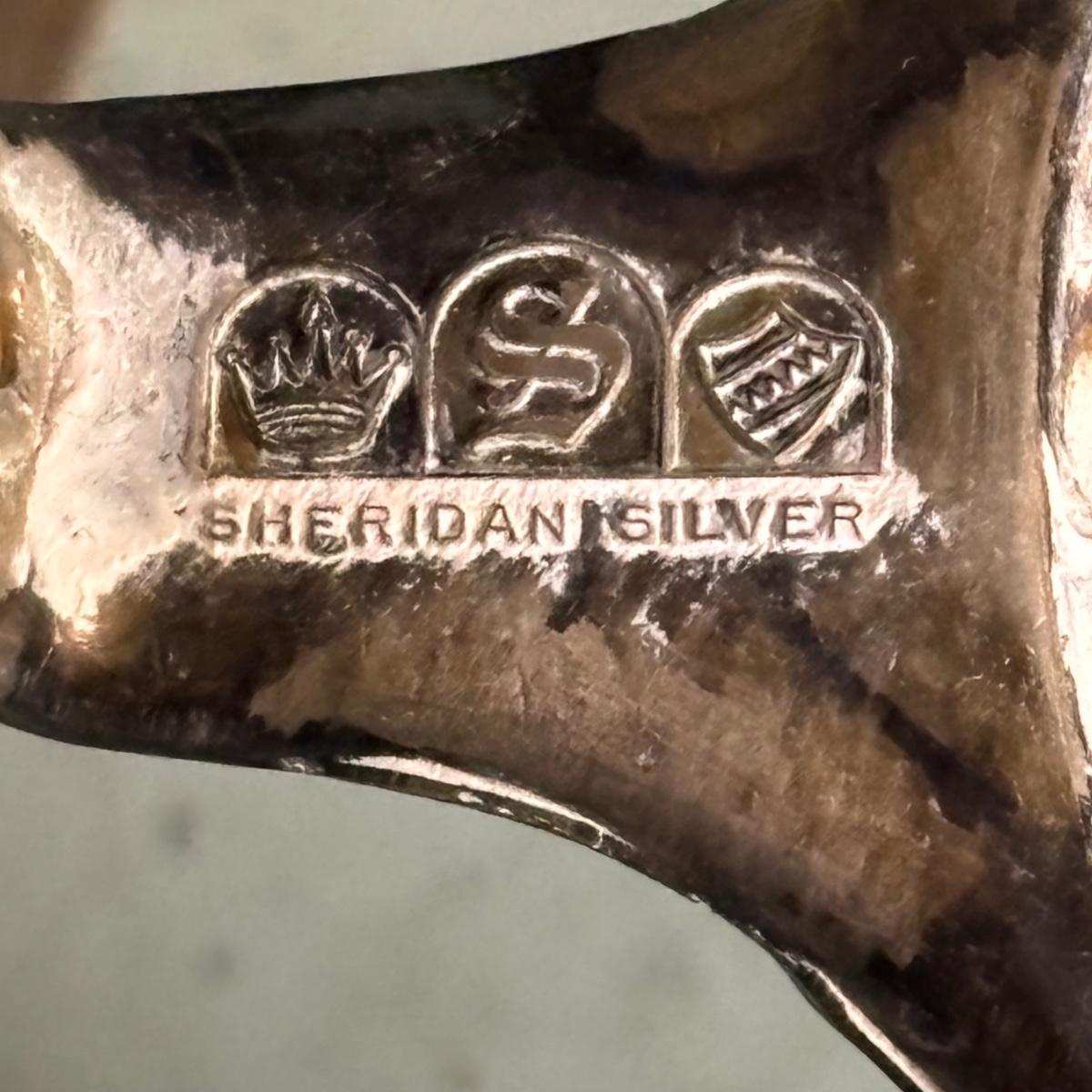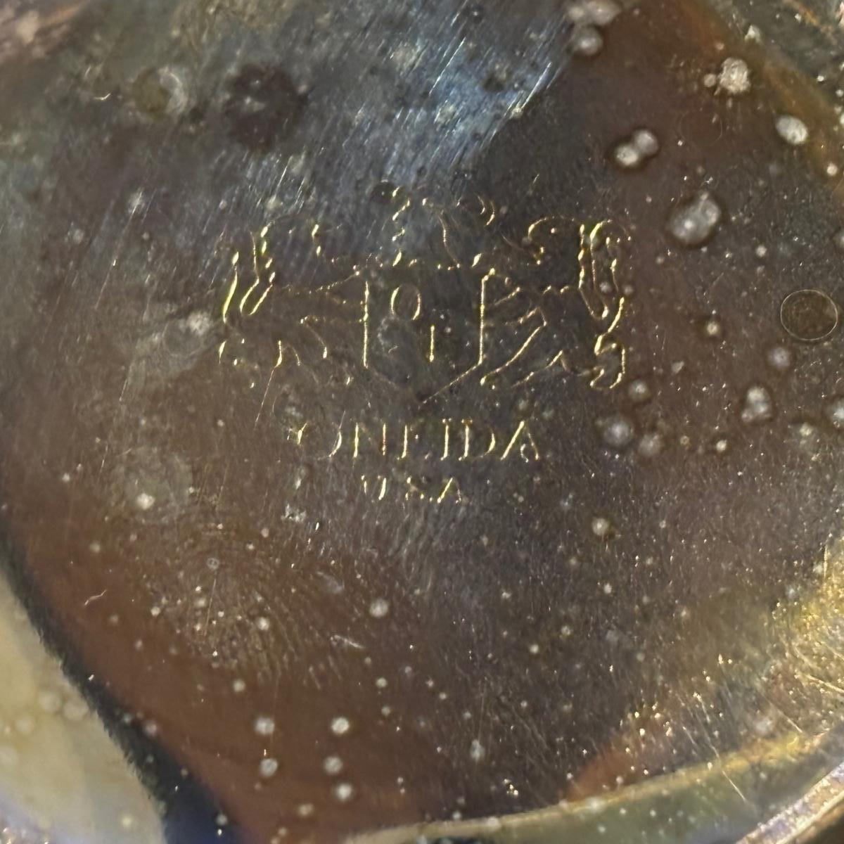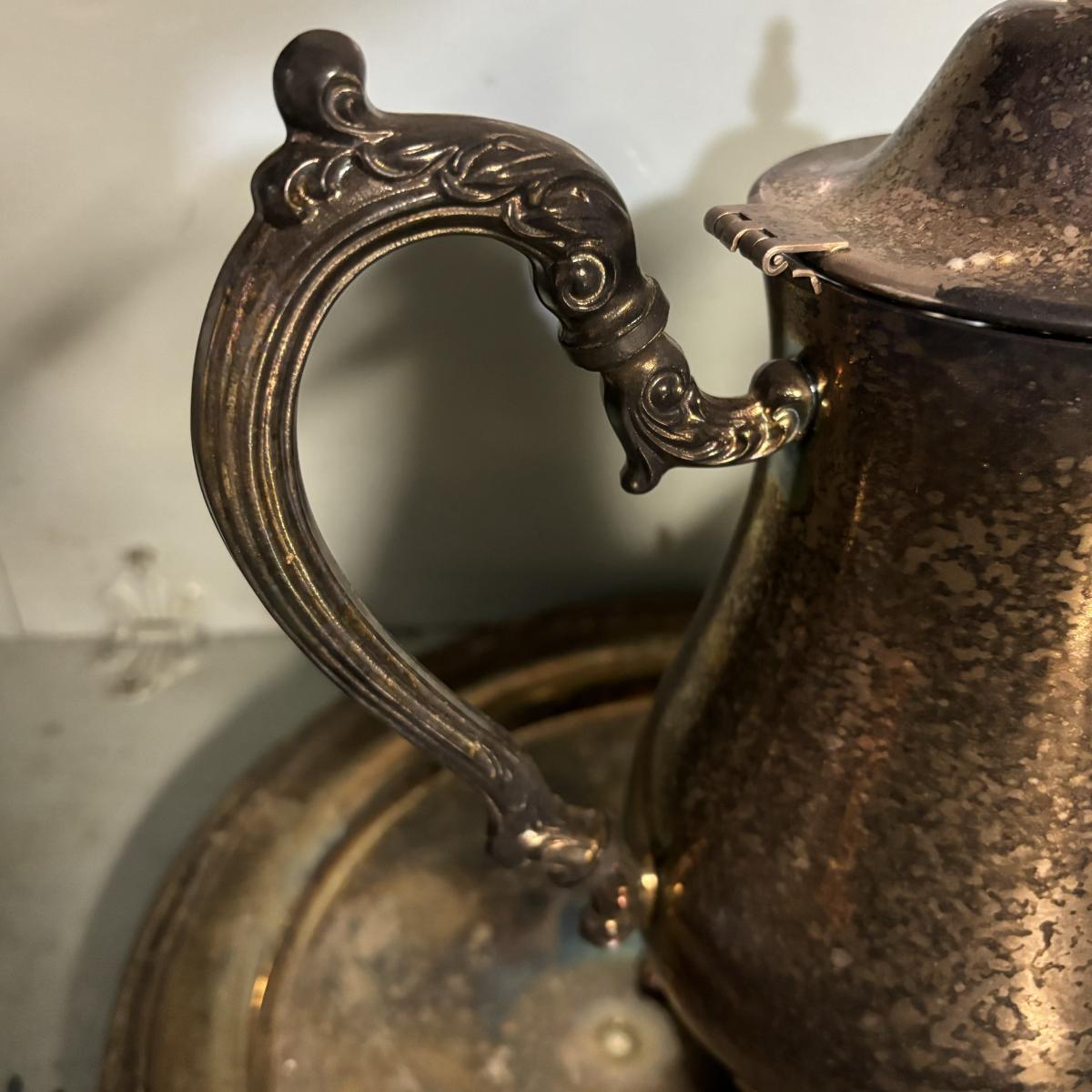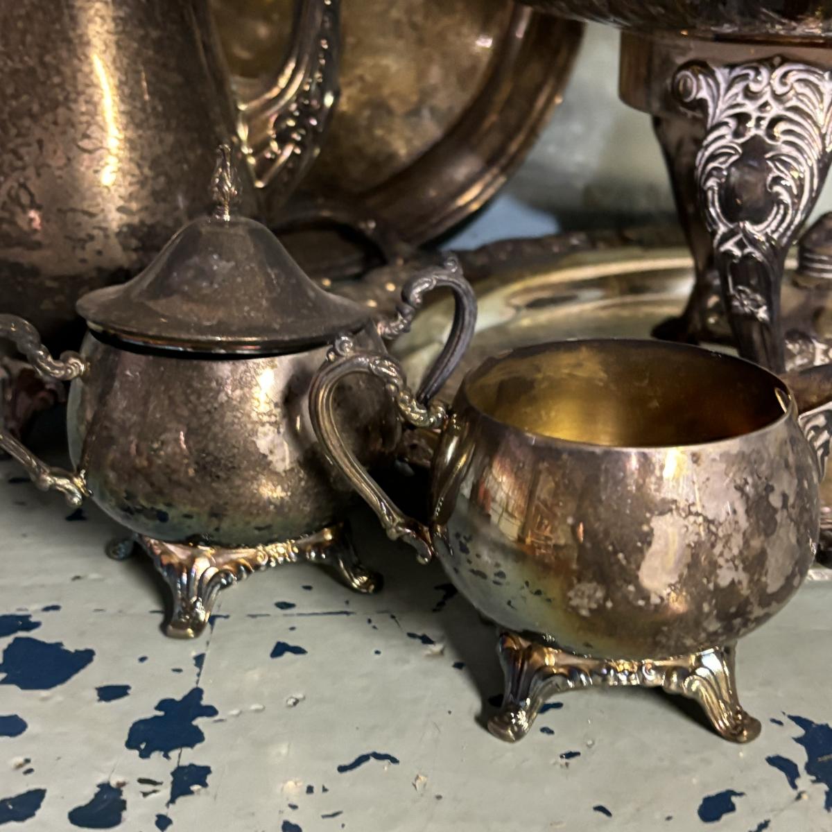 LOT 114: Vintage Oneida Silverplate Chafing Dish with Lid & Liner, Sheridan Silverplate Stand & Burner, Oneida Silverplate Teapot, Sugar Bowl, Creamer & Serving Tray