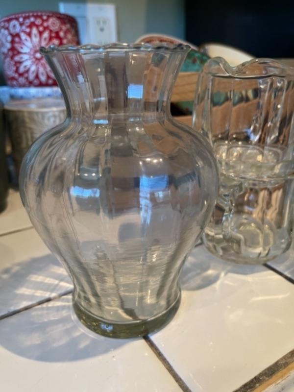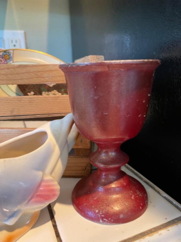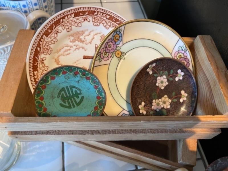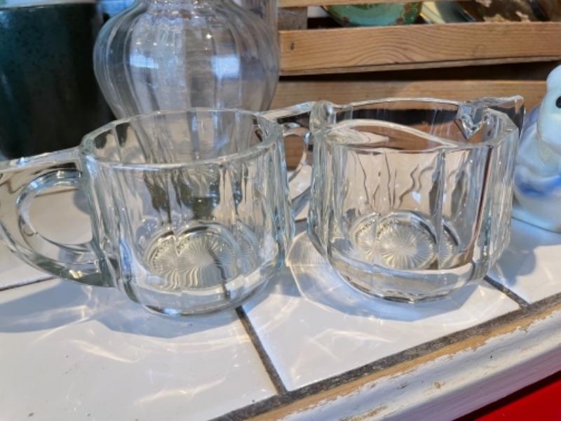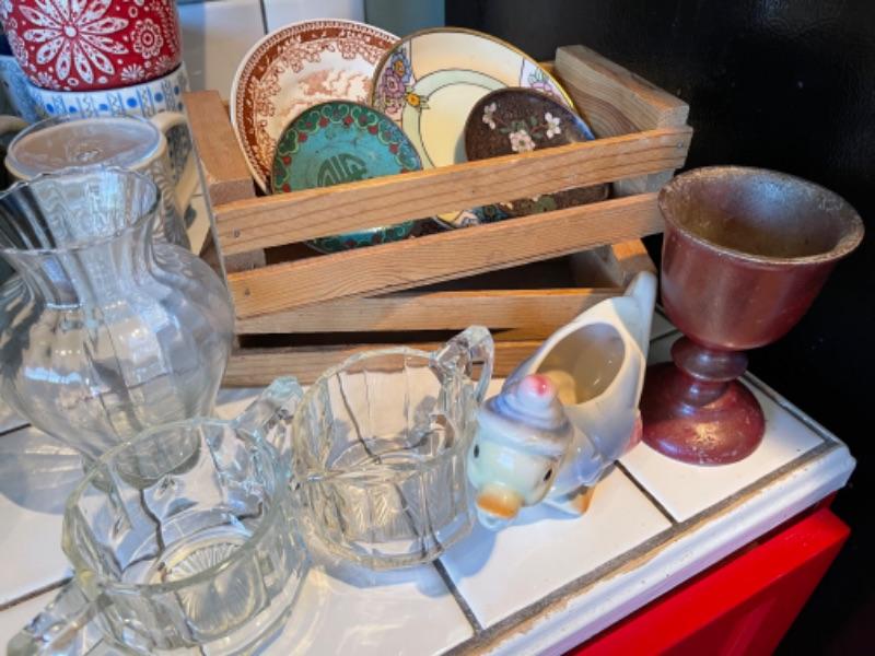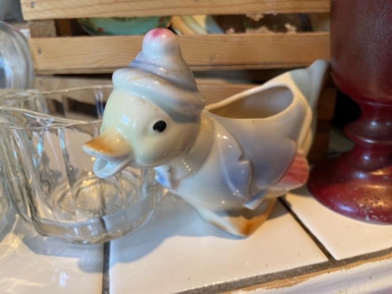 Lot 106K. Glass vase, creamer/sugar, pewter goblet, duck creamer, saucers (one cloisonné)--$35