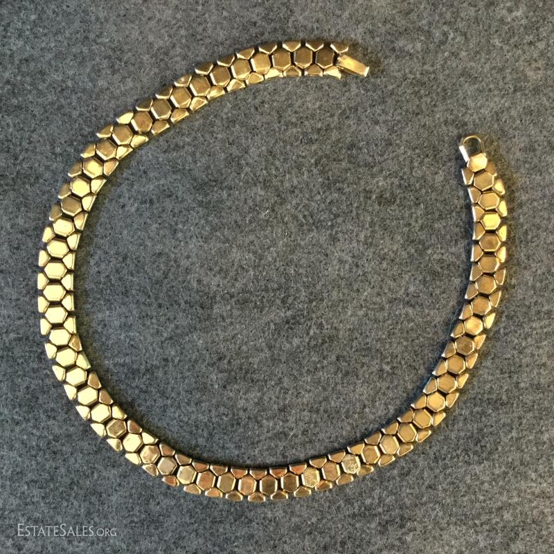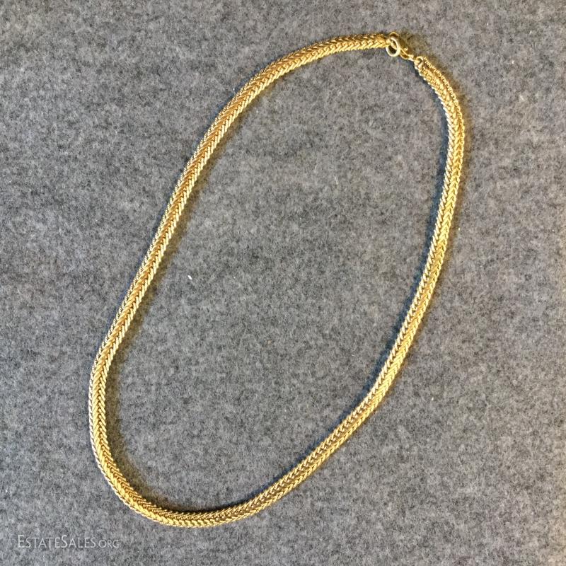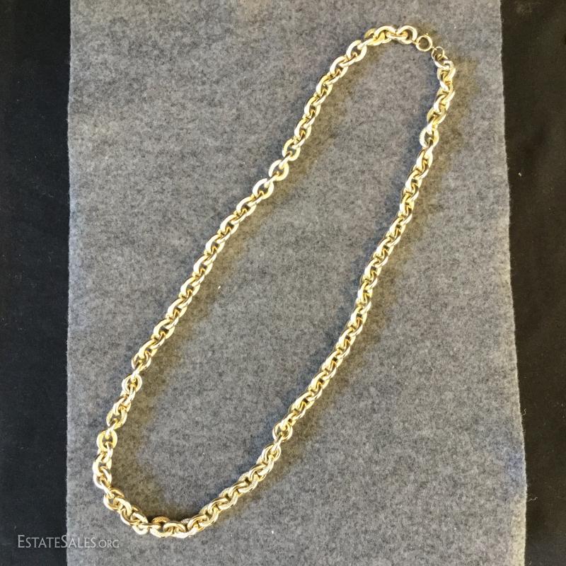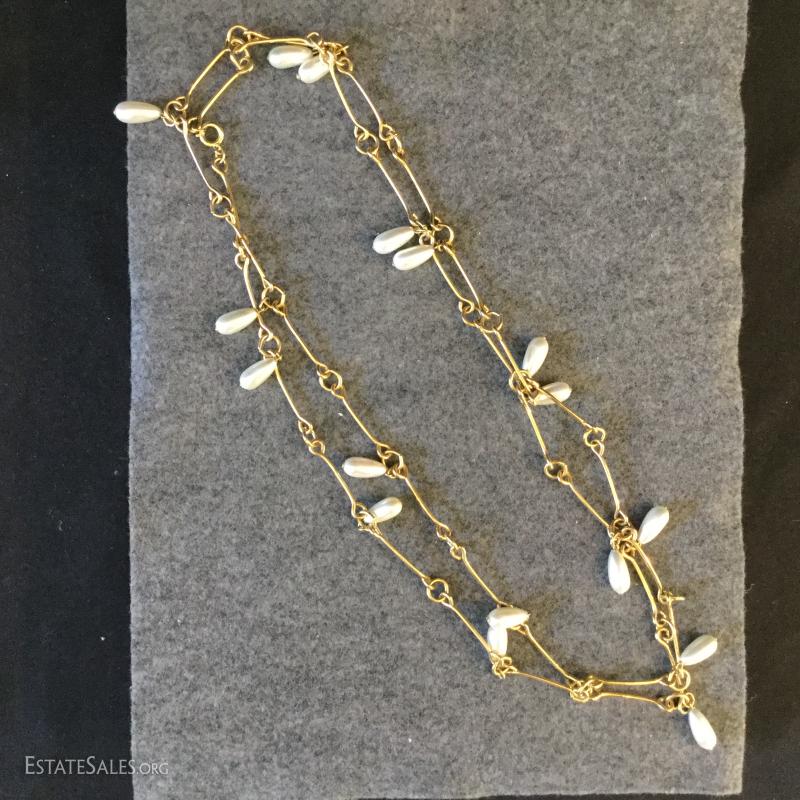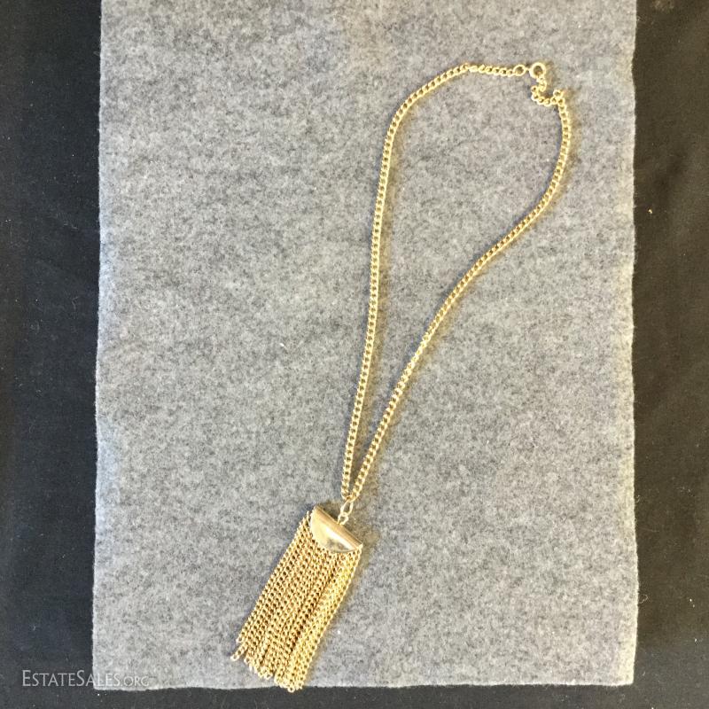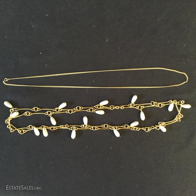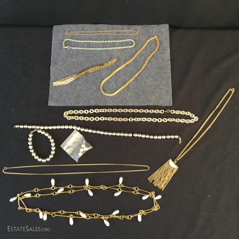 This lot includes several gold colored necklaces and clip
