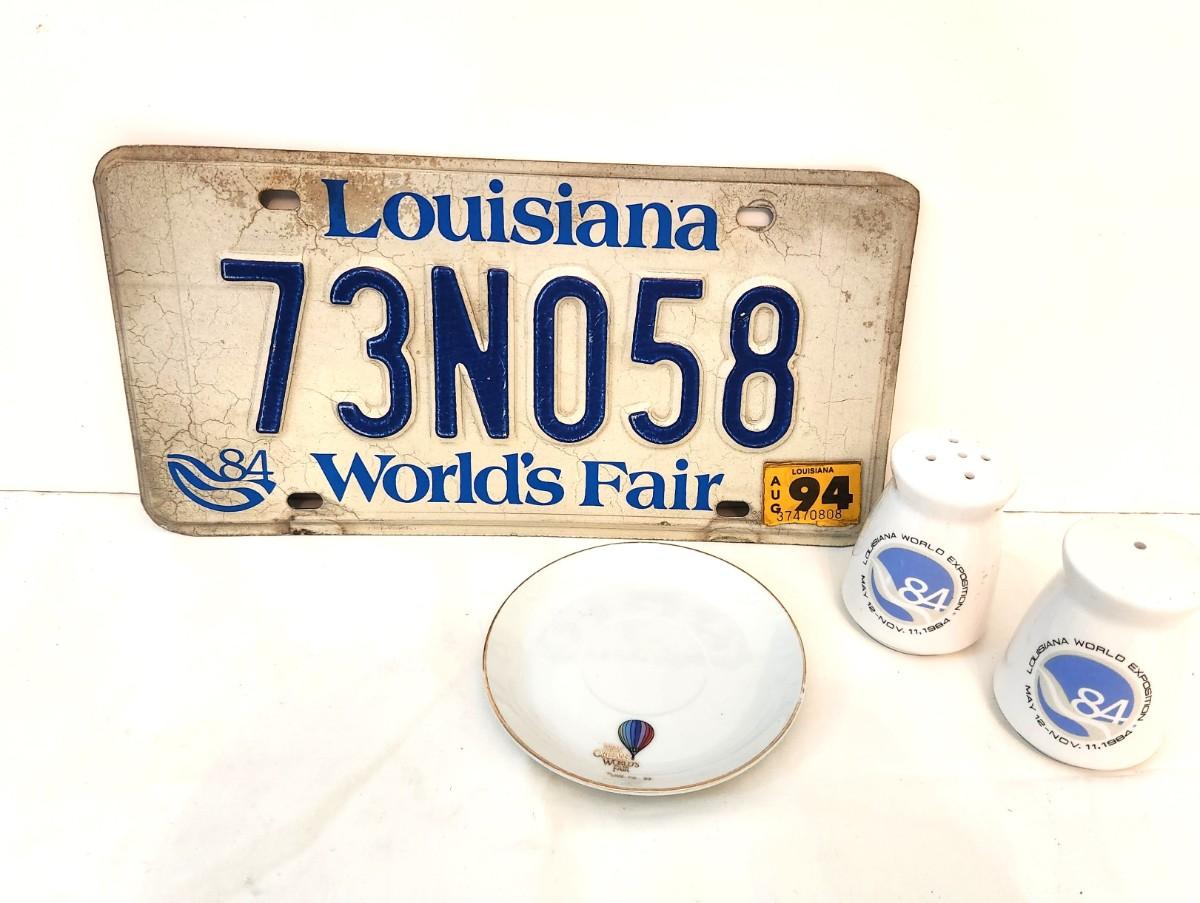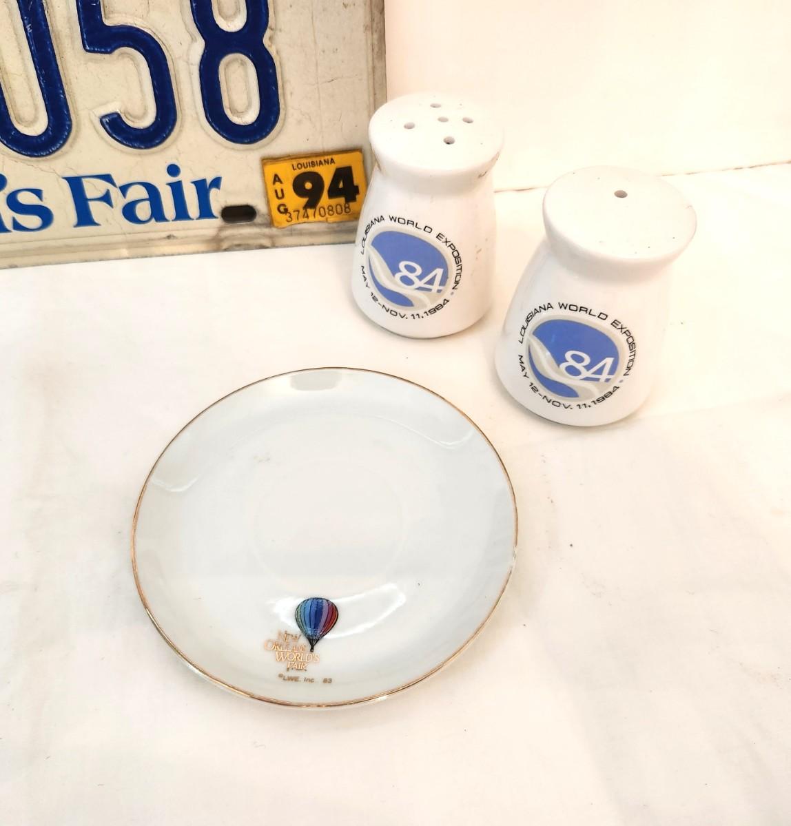 You get all you see here - set of 1984 New Orleans World's Fair Salt/Pepper shakers, , saucer, and license plate. Vintage condition. Plate was good from 1984-1994.