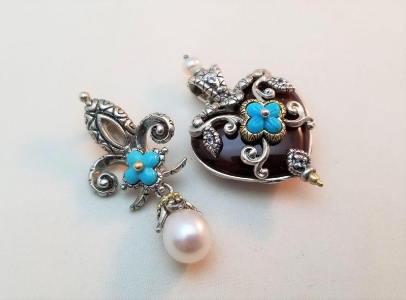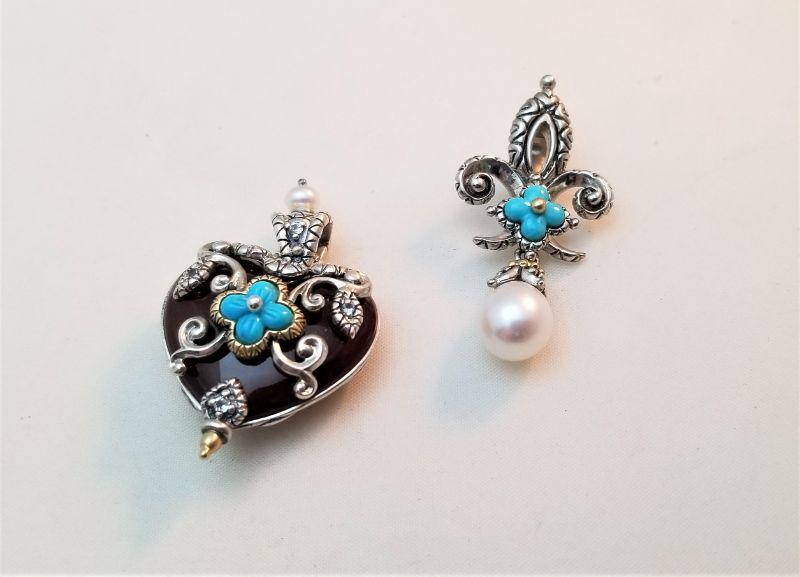 These two pieces speak for themselves - quality all the way. One enhancer in the form of a fleur di lis - set with turquoise and a dangly pearl - the other is a heart, 18kt gold, pearl and turquoise accents. Anyone would be proud to own these little beauties. Each measures about 1.5" long.