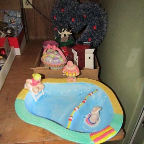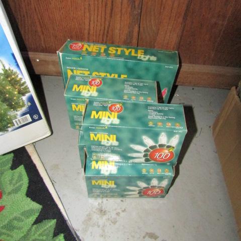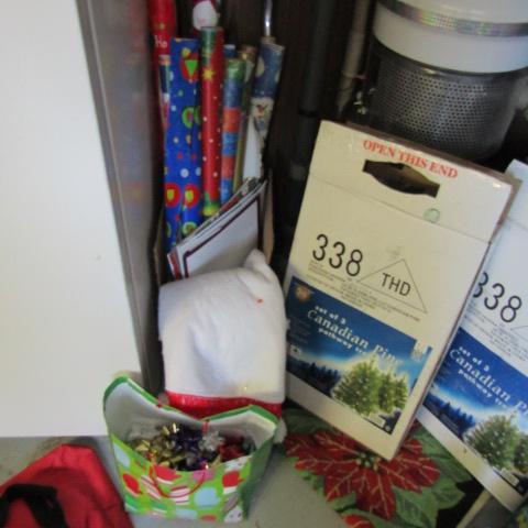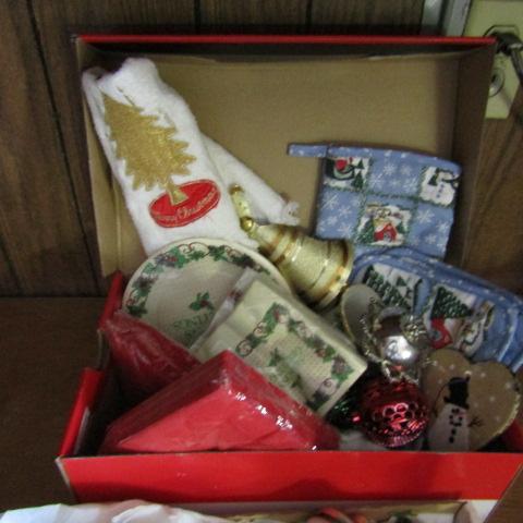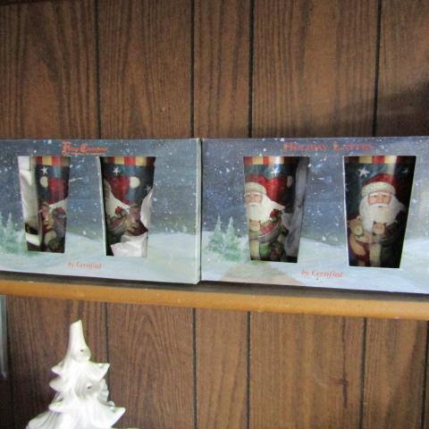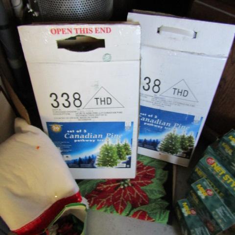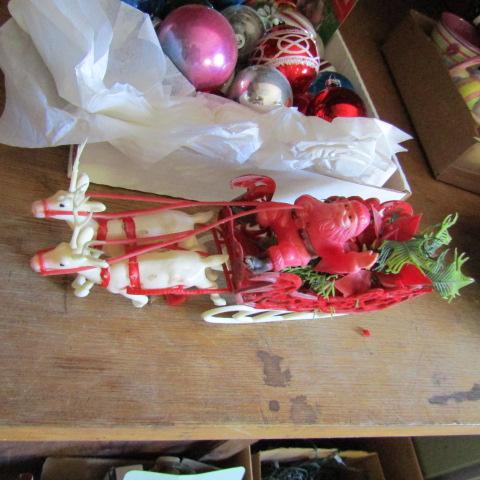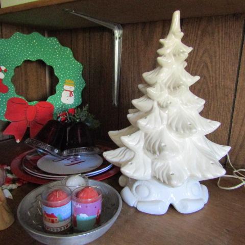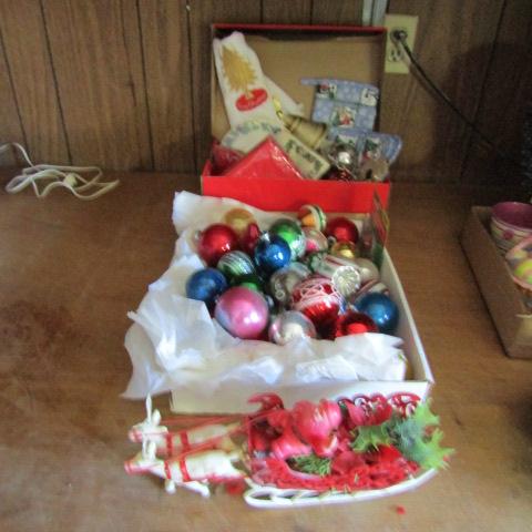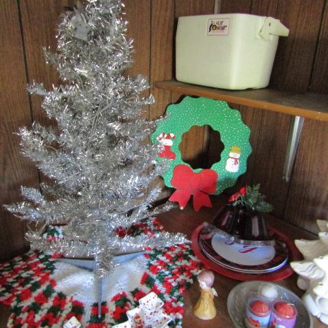 SMALL ALUMINUM TREE, CERAMIC TREE (MISSING PLASTIC LIGHTS), LIGHTS, VINTAGE GLASS ORNAMENTS, NIB GLASSES, AND MUCH MUCH MORE!