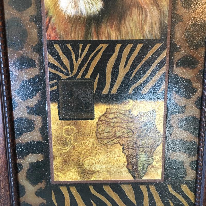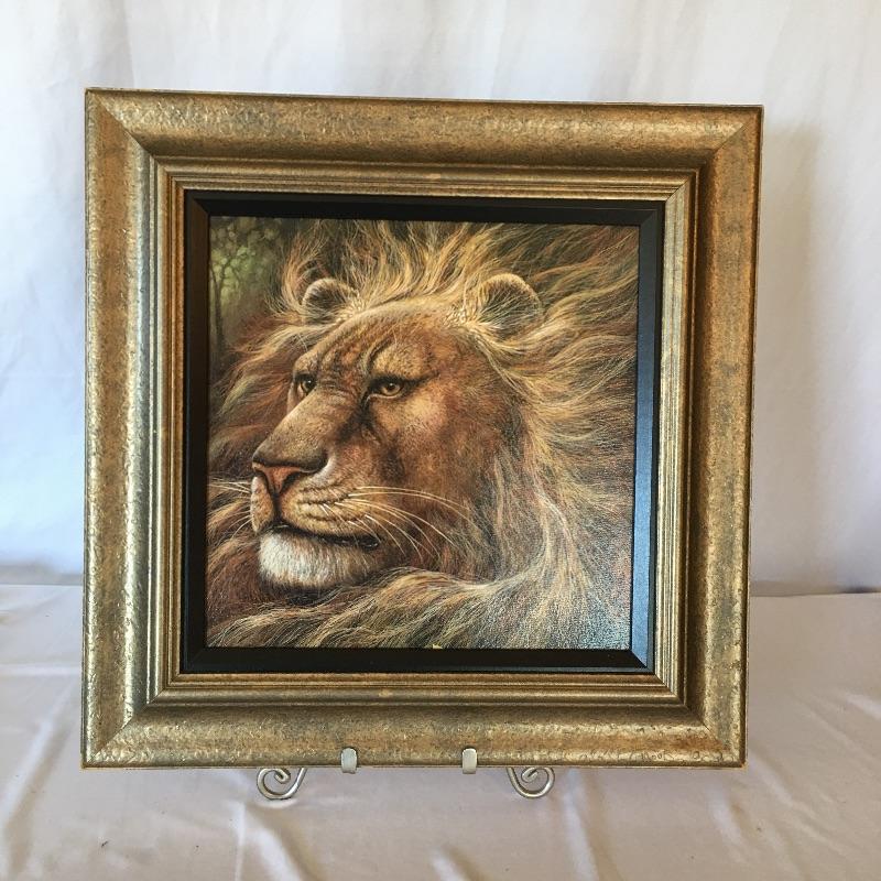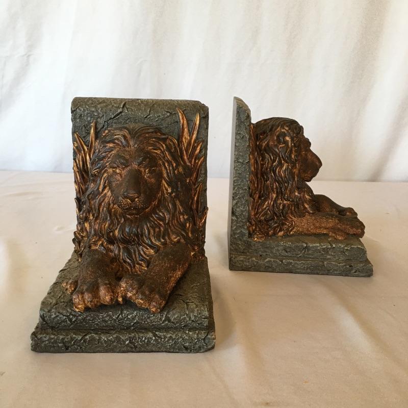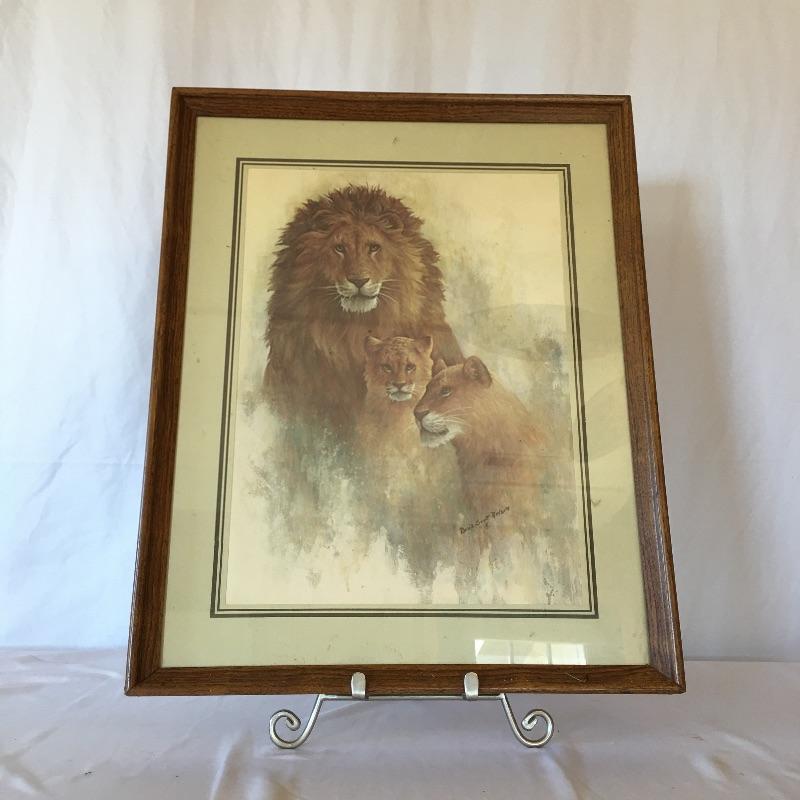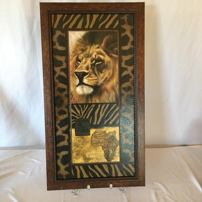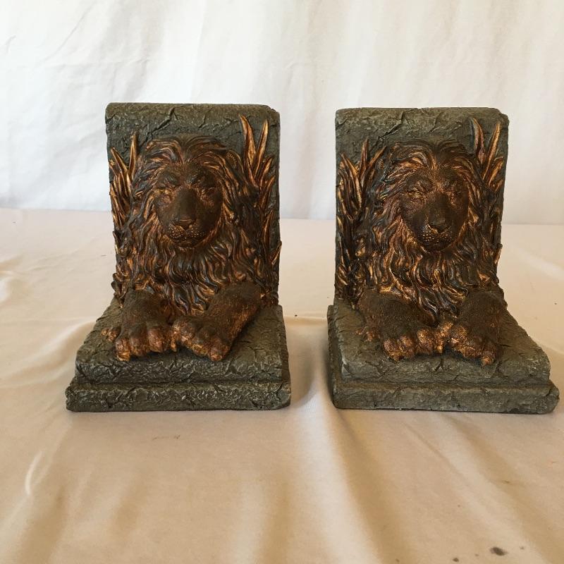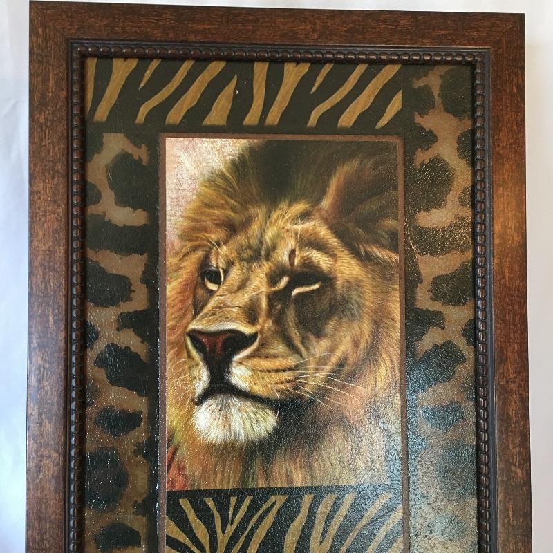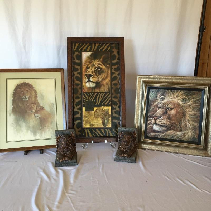Get in the lions den with this nice array. Lot includes resin lion bookends and three framed lion themed pieces of art.