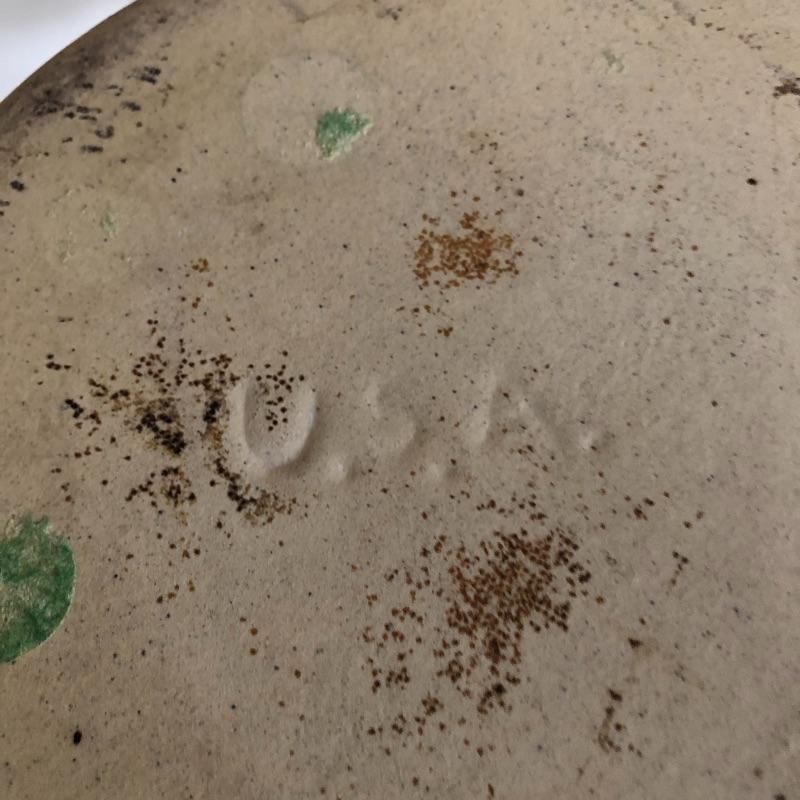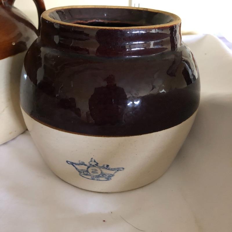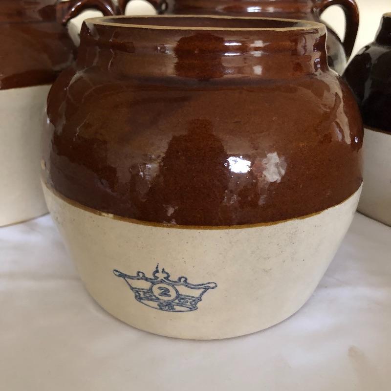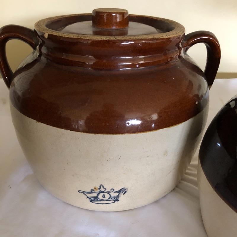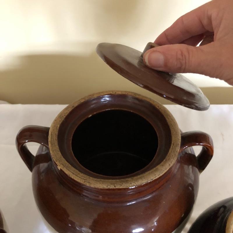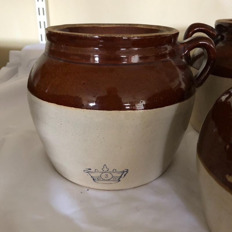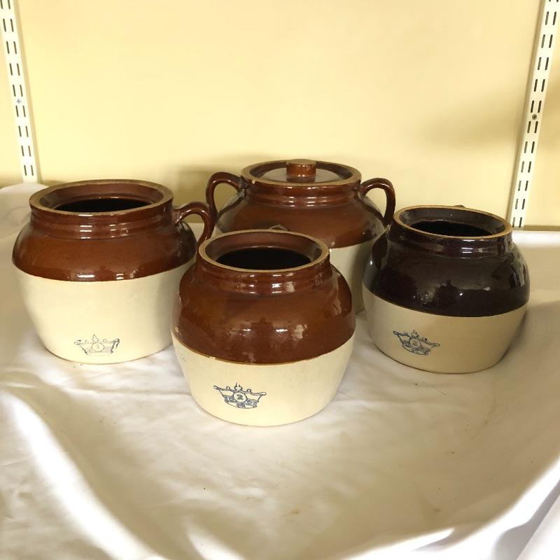 One out of four of these Robinson bean pots is lidded and all four have the crown logo and stamped USA on the bottom. There are two #2, one #3 and a #4(lidded). These rustic Ransbottom crocks are in great condition.