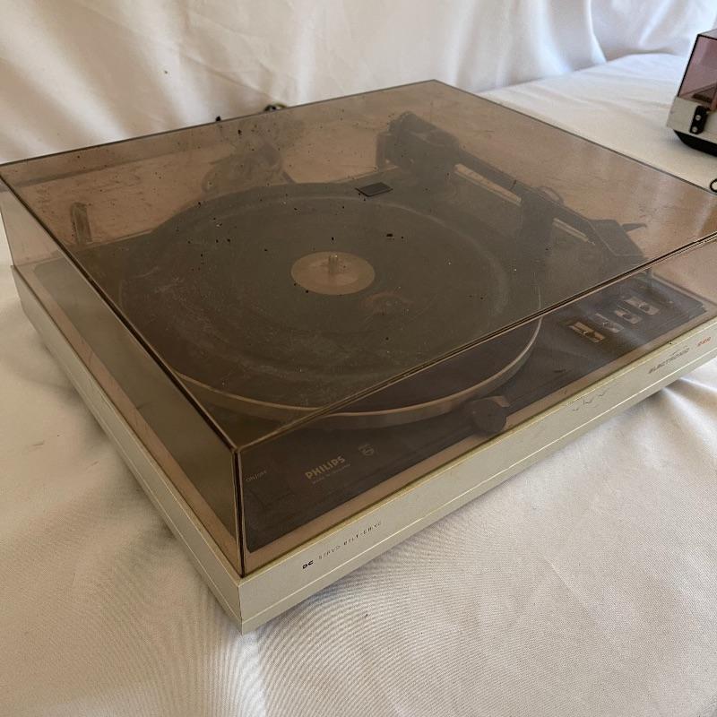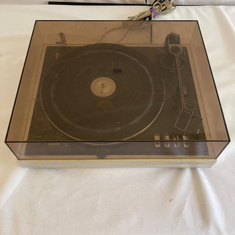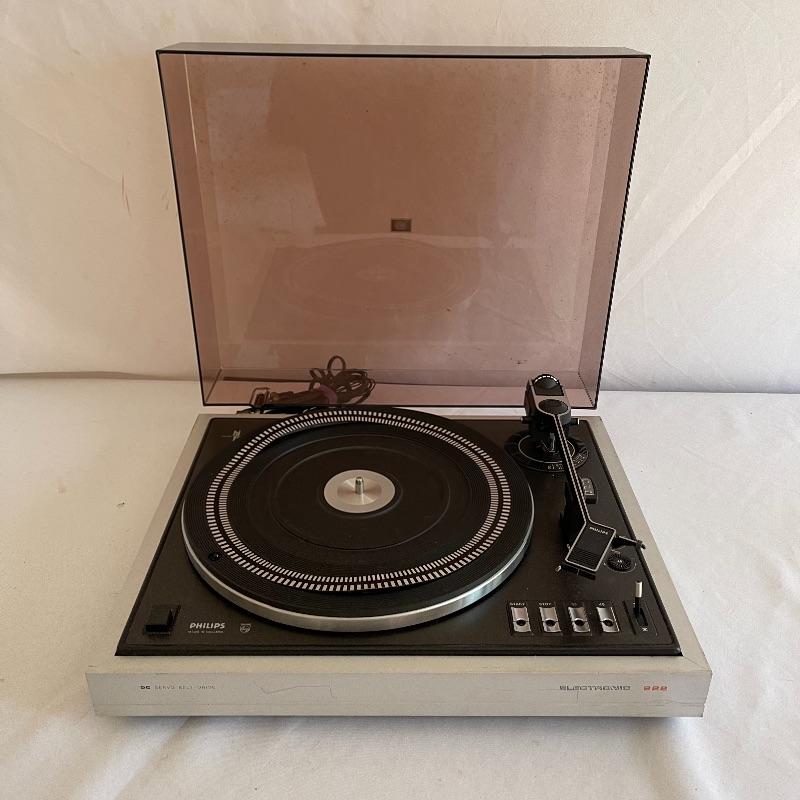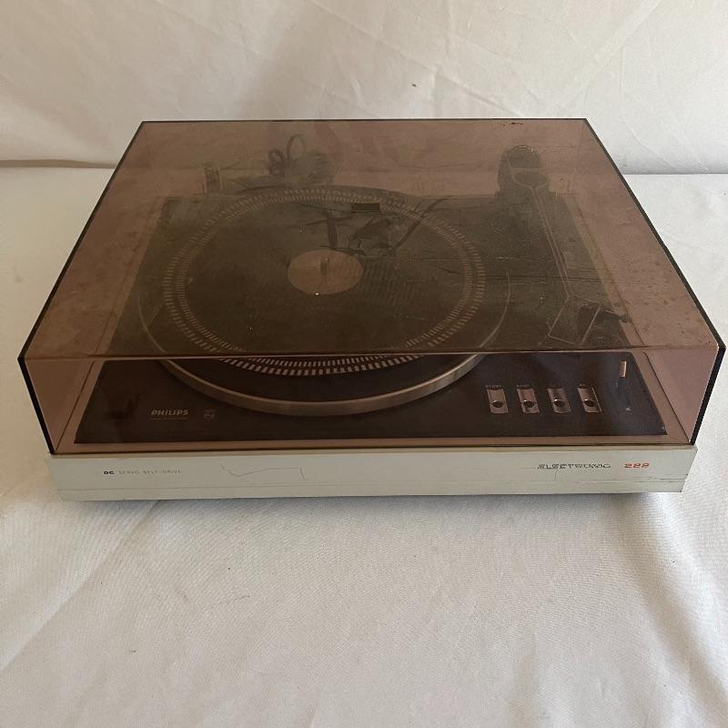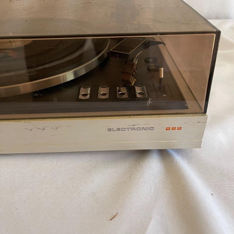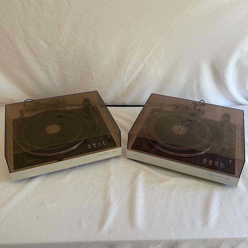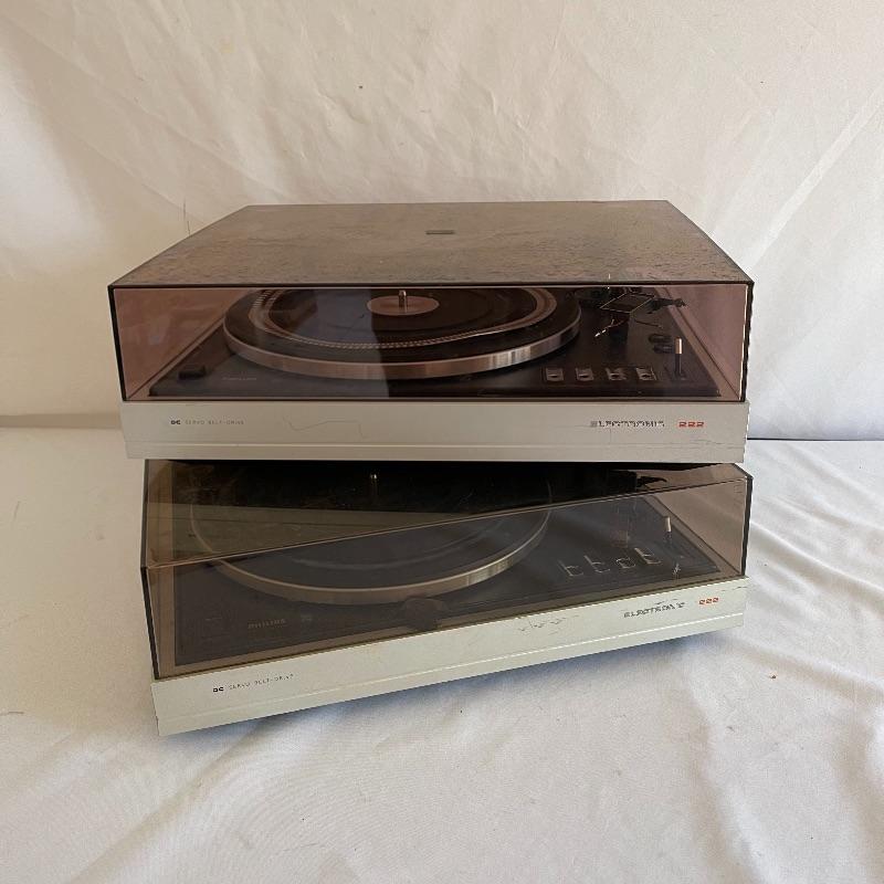Phillips Electronic 222 turntables, 1979-82. Both are type 22GA222/44B and both powered on when plugged in. Lids are in seemingly good condition.