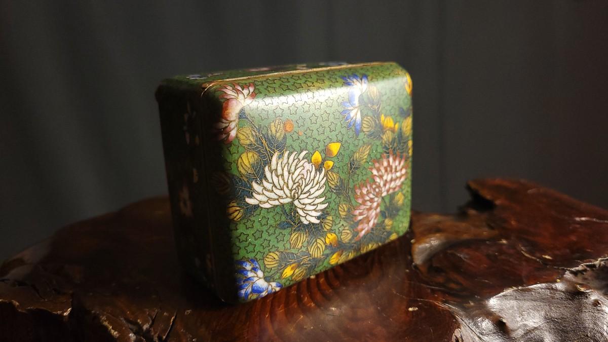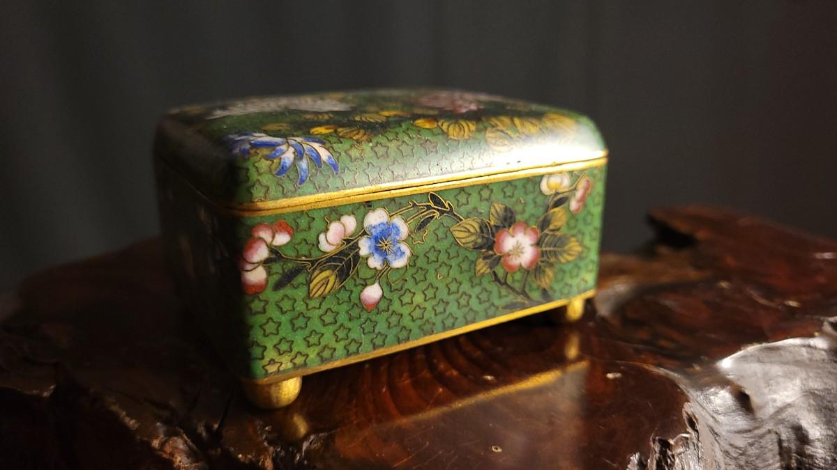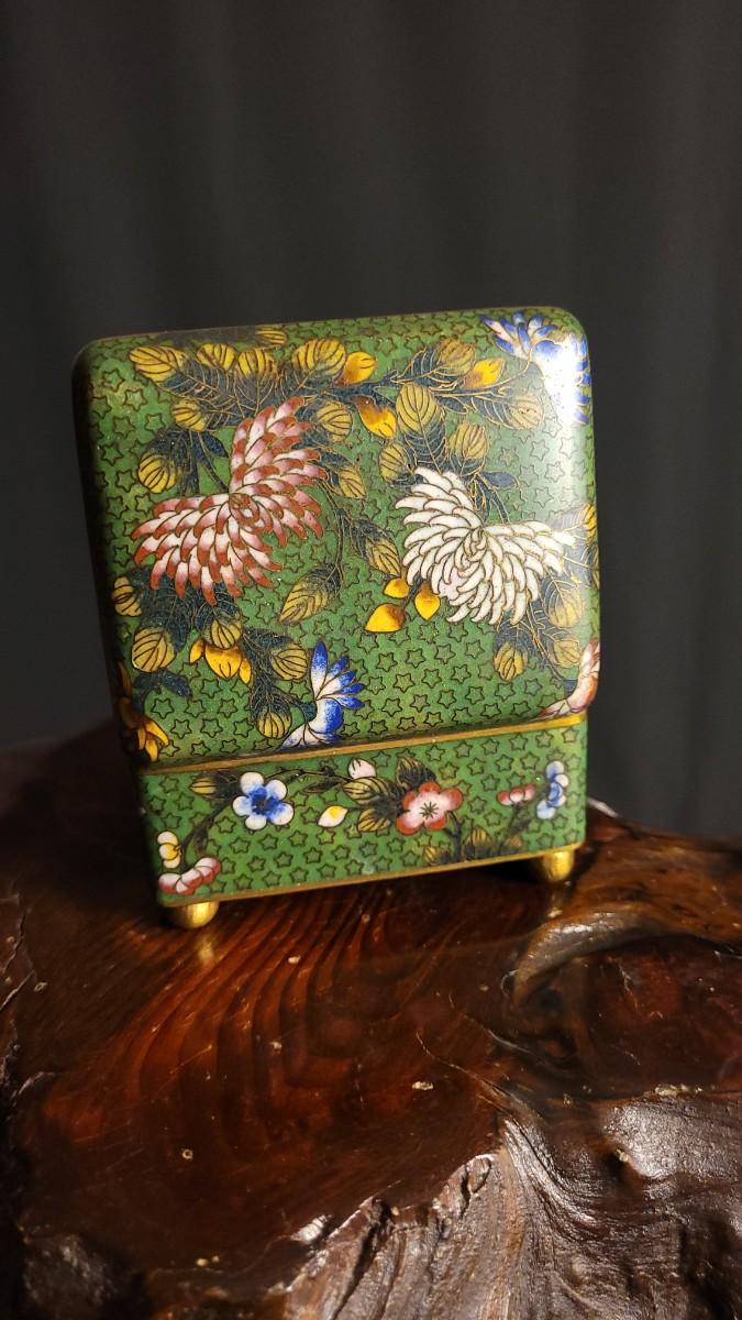 This lot features a Vintage Cloisonne Jewelry or Trinket Box that has a base color of dark green with many colorful Accents throughout. Blooming flowers including Lotus make this Box a great selection for storing anything special. 3.25" x 2.75" x 1.75".