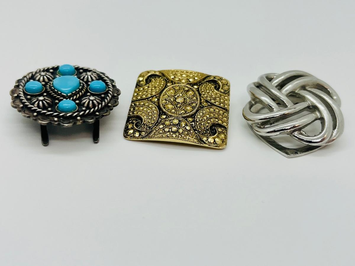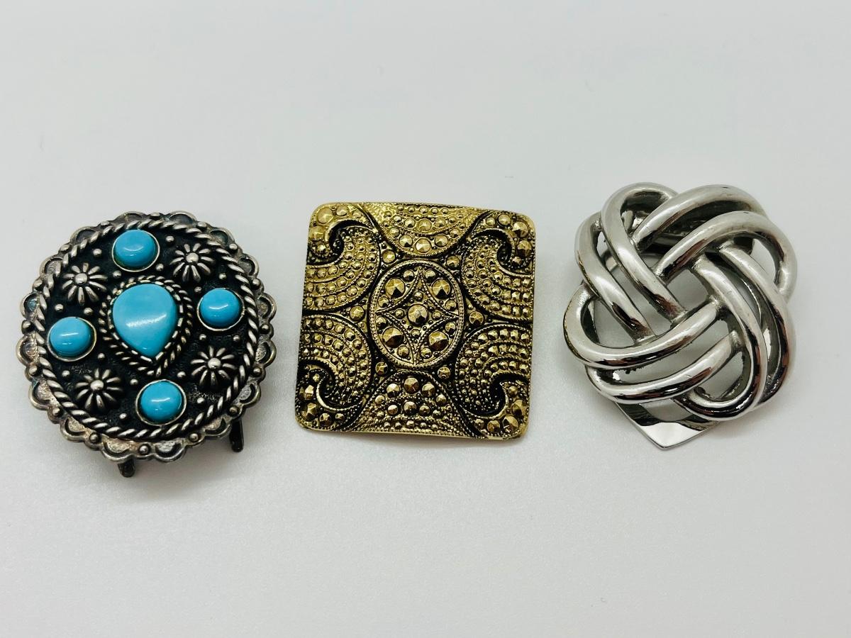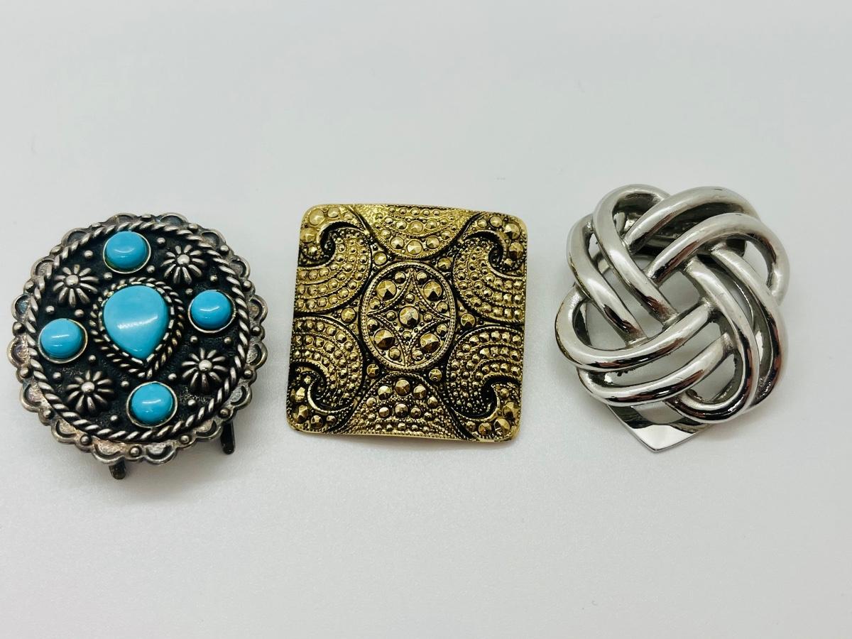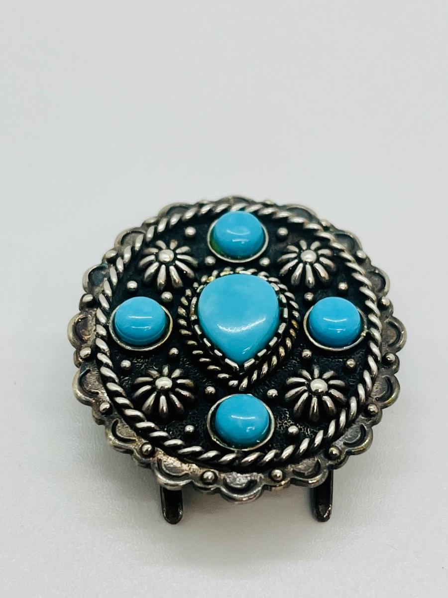 Lot 107: Clip lot:  Two Scarf Clips & Southwestern Sterling & Turquoise Collar/Bolo/Sash clip