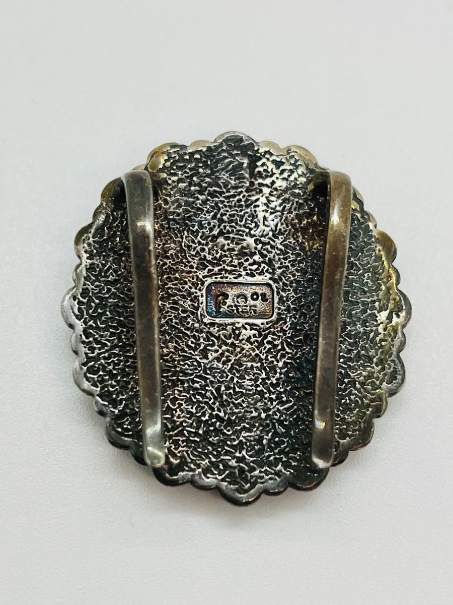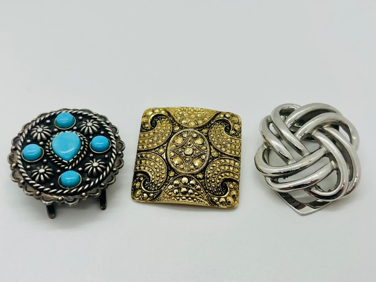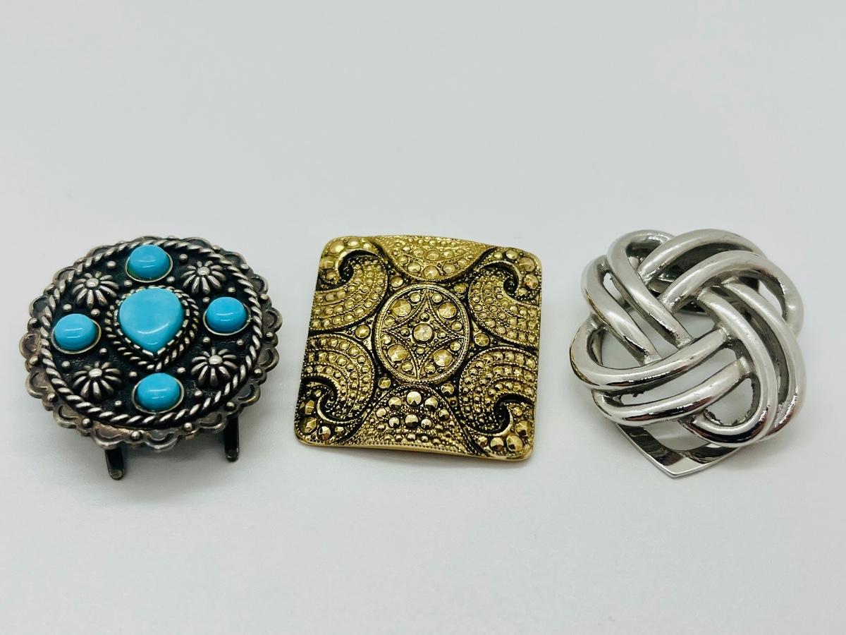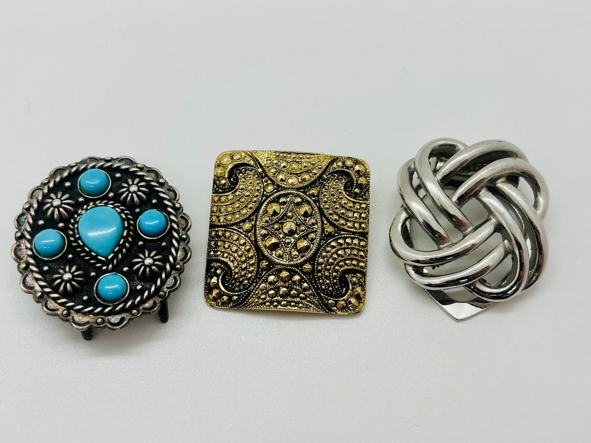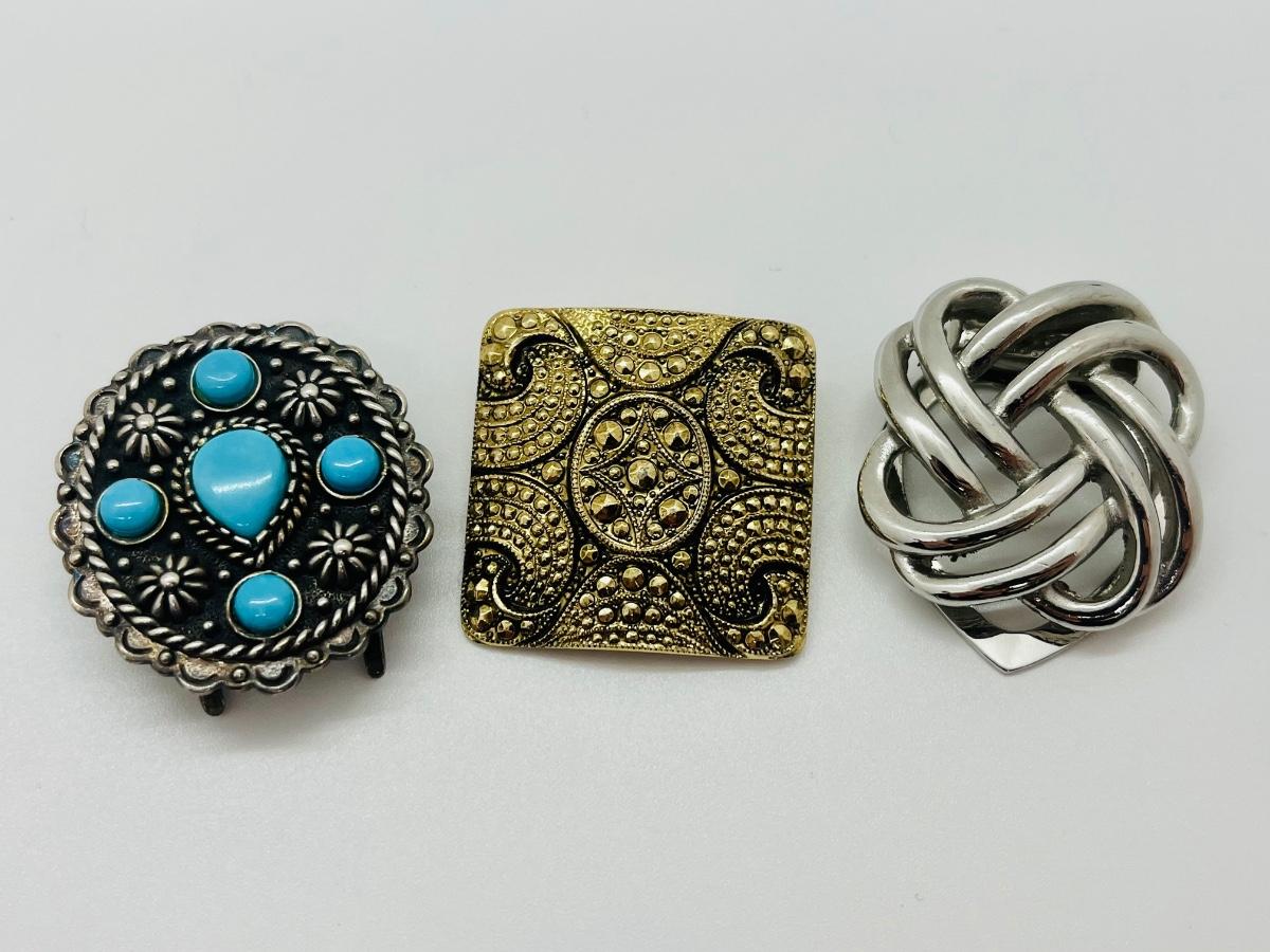 Lot 107: Clip lot:  Two Scarf Clips & Southwestern Sterling & Turquoise Collar/Bolo/Sash clip