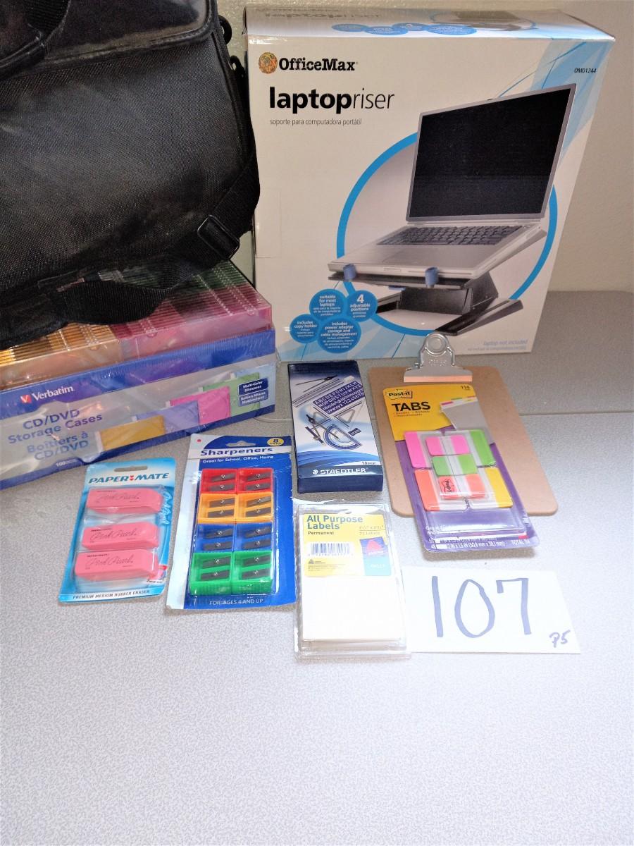 LOT 107 NEW LAPTOP RISER, CARRY CASE AND VARIOUS OFFICE SUPPLIES