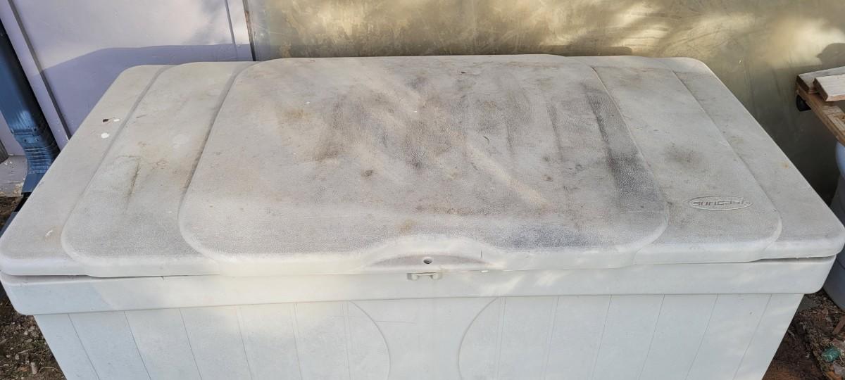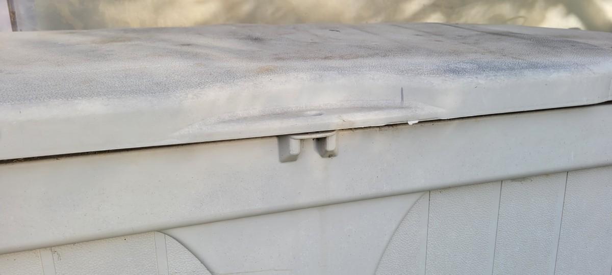 Very large outdoor storage case by SUNCRAFT that has the ability to be locked when a padlock is added to the center closing Clasp.