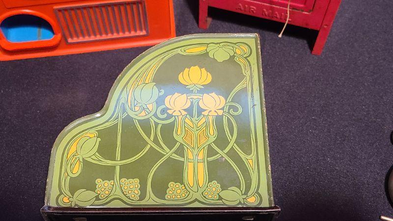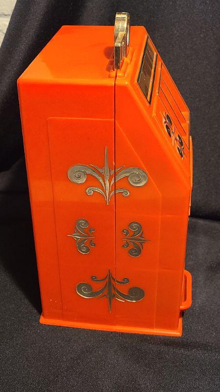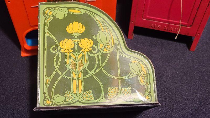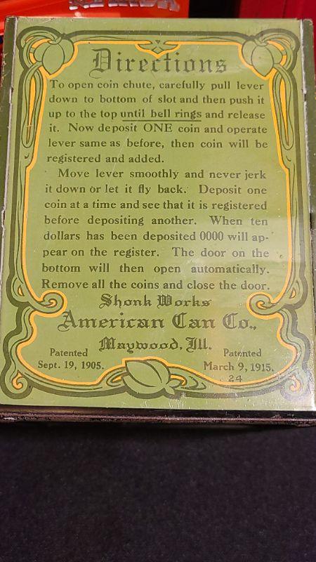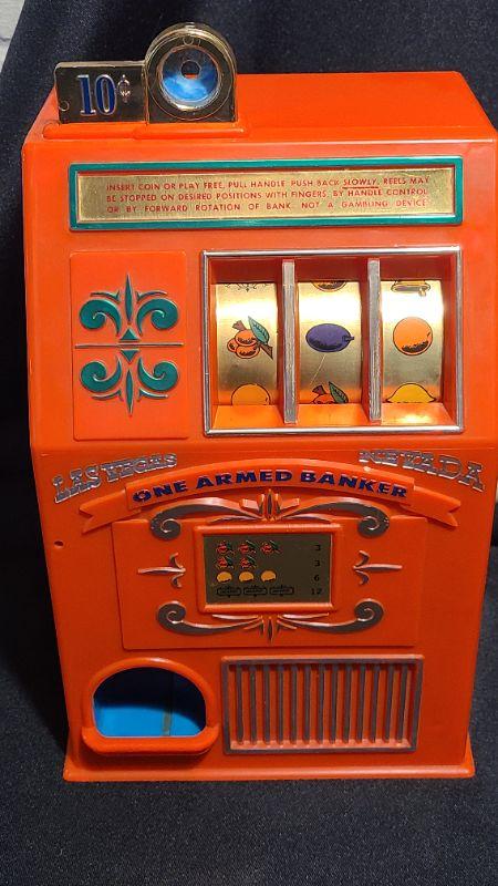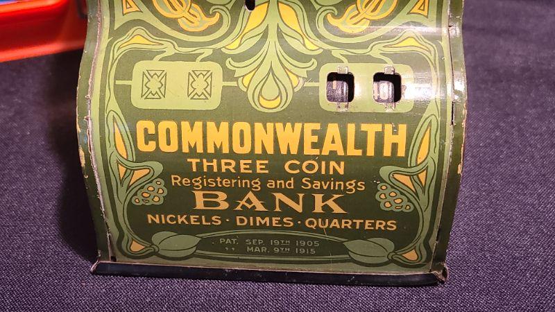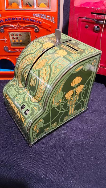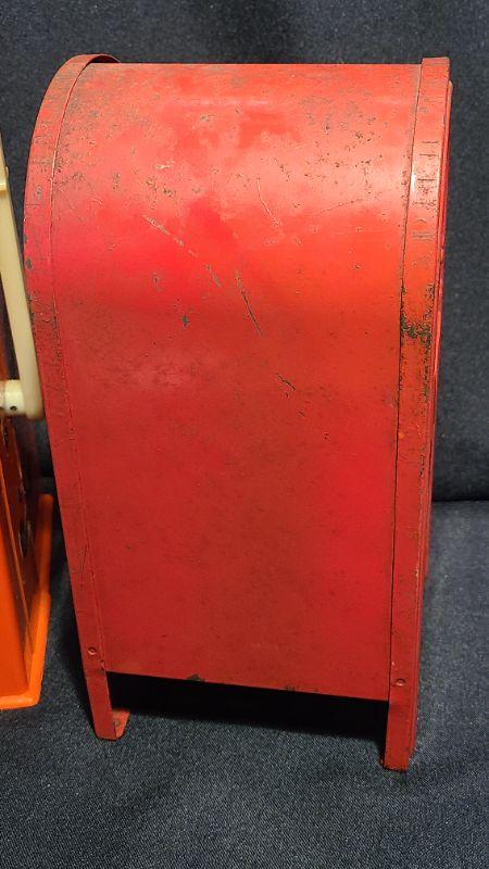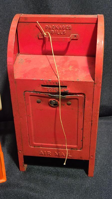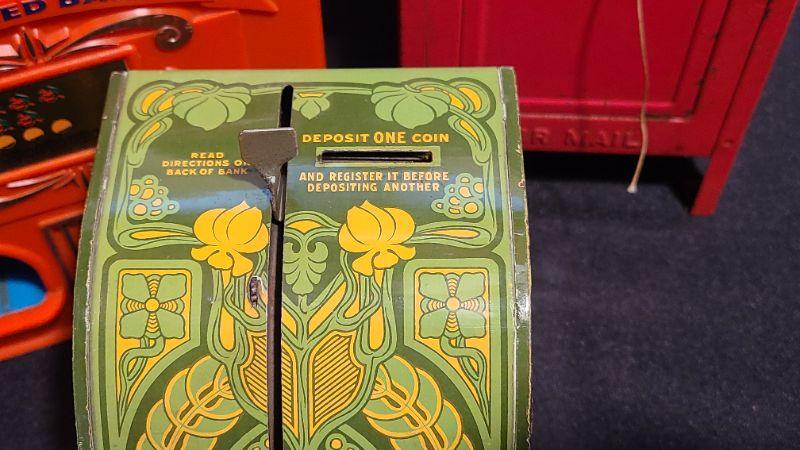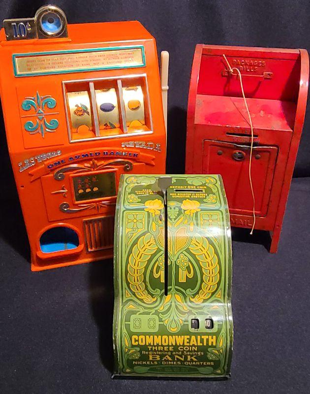 Antique Commonwealth tin metal bank, gorgeous colors, Las Vegas One Armed Banker Slot toy slot machine, Metal Red Mailbox as-is. Please see all pics for condition of each item. CLS