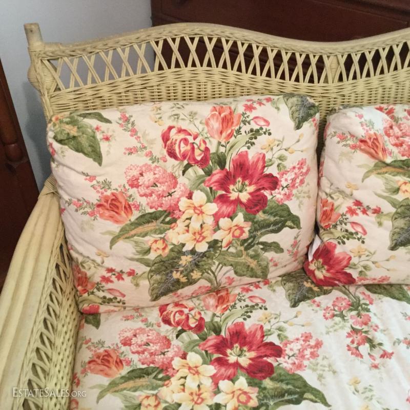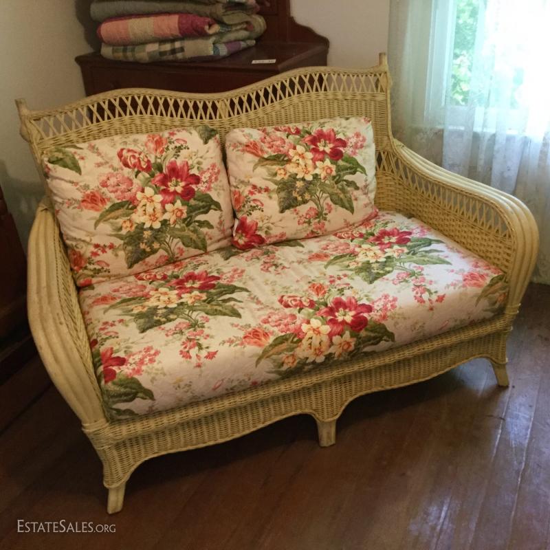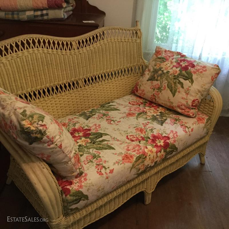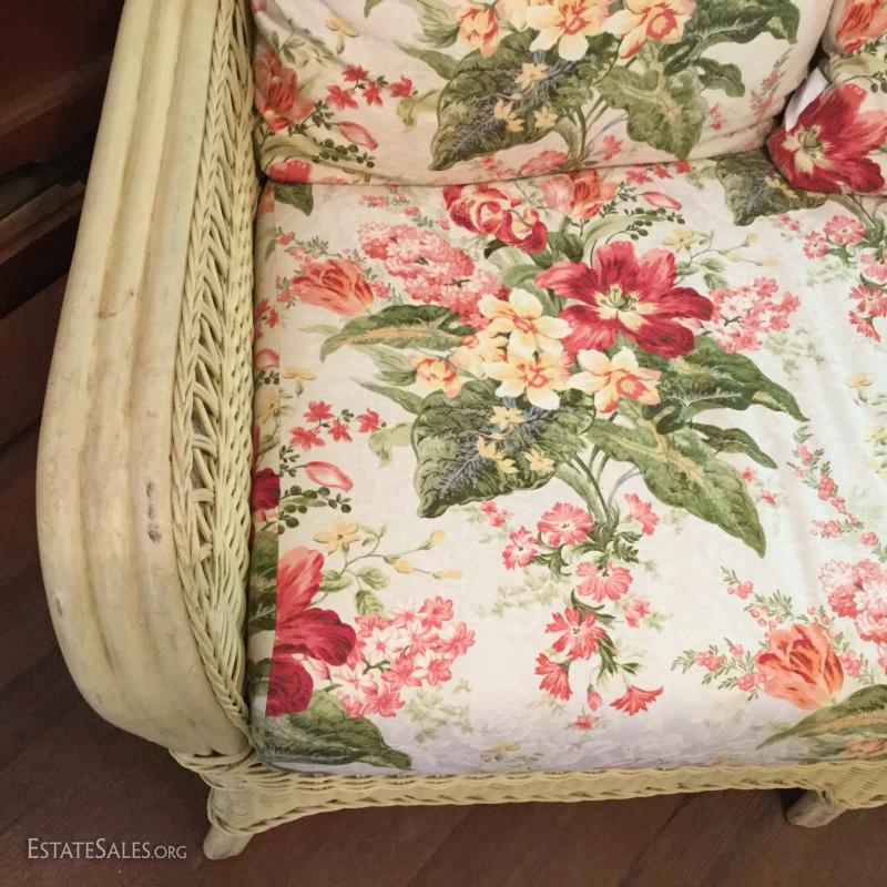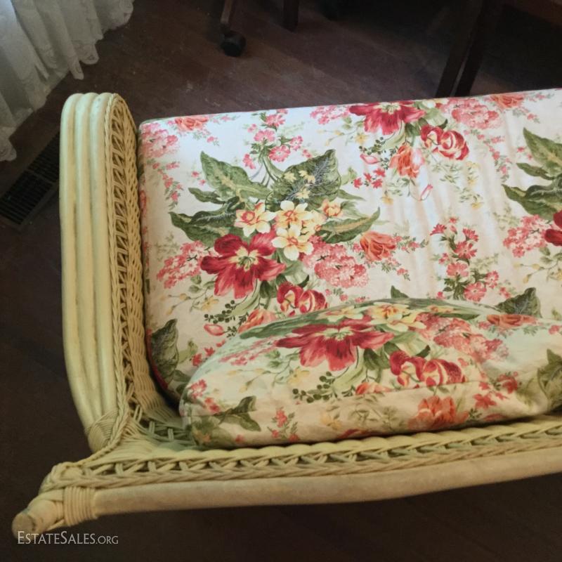 Beautiful vintage, wicket couch with floral cushions. In excellent condition! Measures 57"L x 32"w x 37"H. Lot available for pick up in Saluda, NC only.