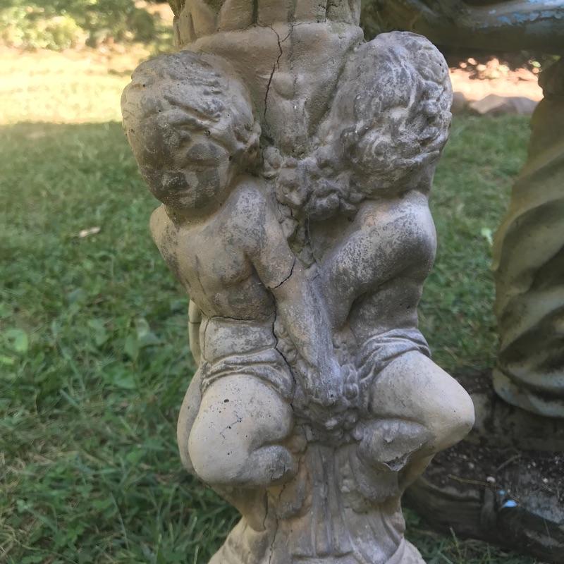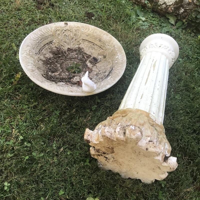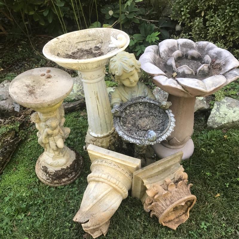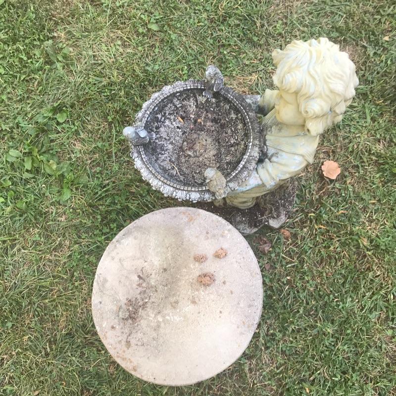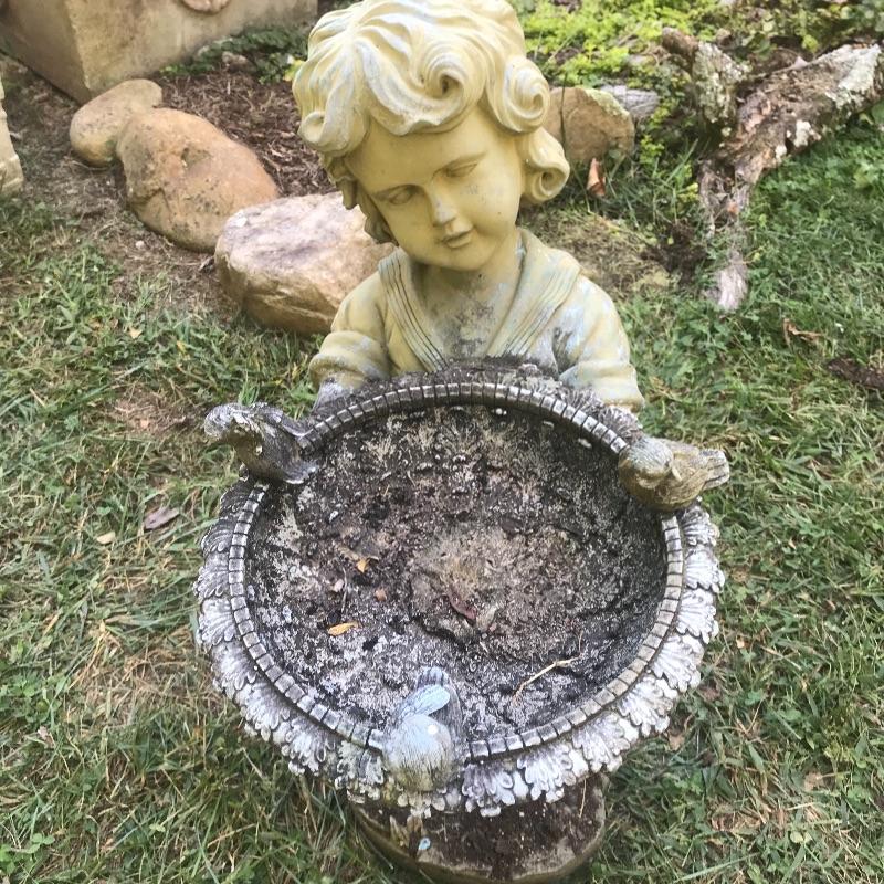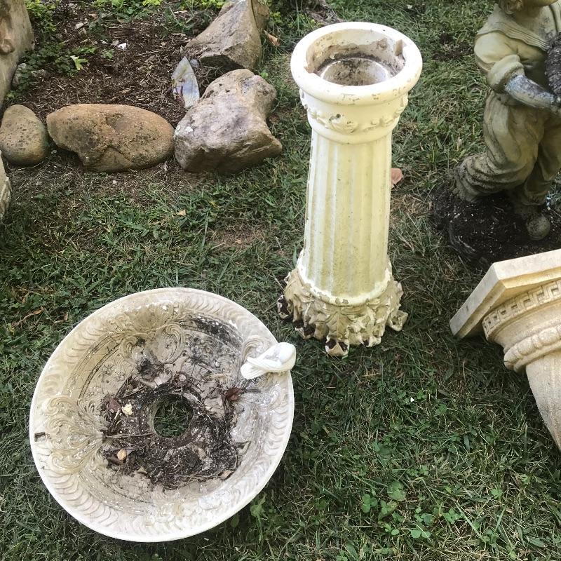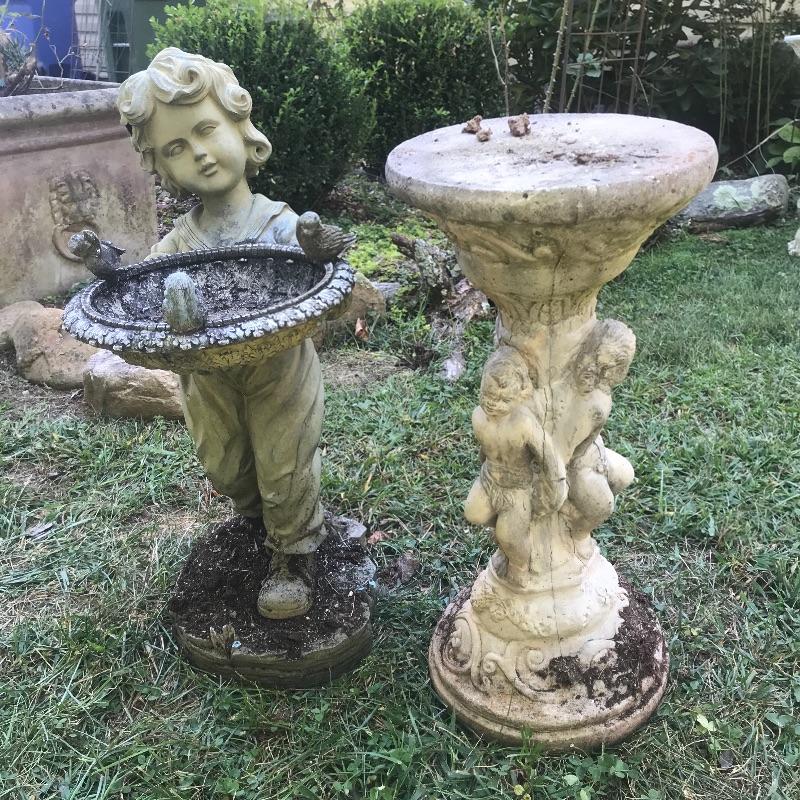 Lovely yard lot with three bird baths and three pillars. The largest bath is white with a detachable top standing approximately 25” high. There are two pillar heads perfect to create illusions in your yard. Materials and weight vary piece by piece, but all most light enough for one person to load. The heaviest, the pillar with cherubs holding hands, is possibly cement. There can be blemishes and evidence of the elements throughout, but all are sturdy and have life left in them. See photos. No shipping.