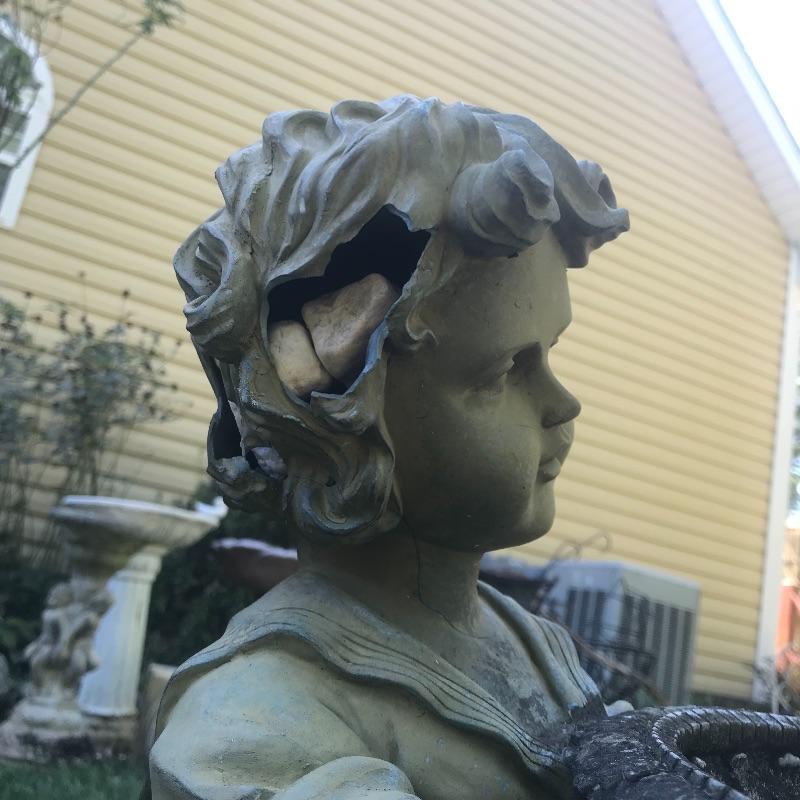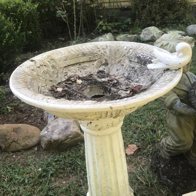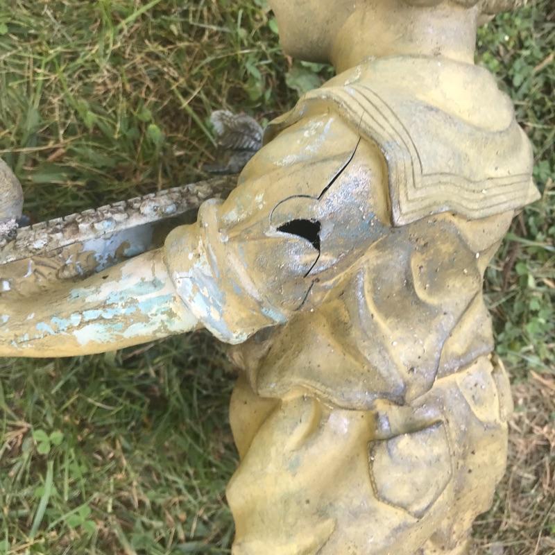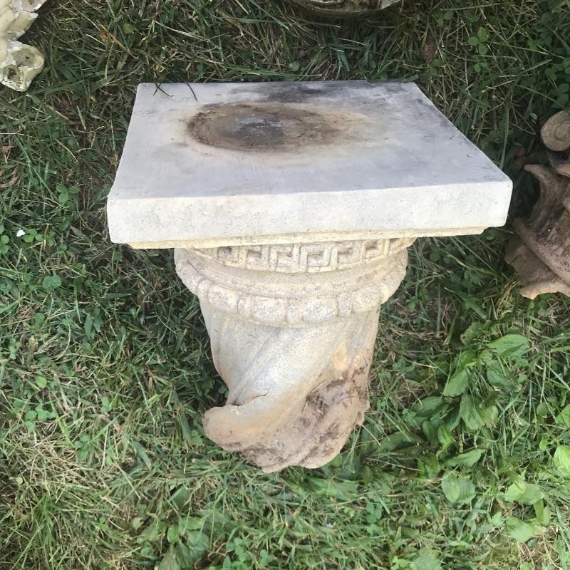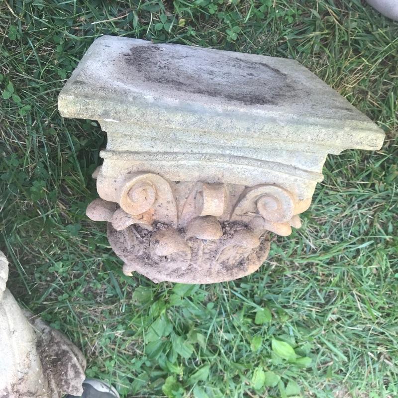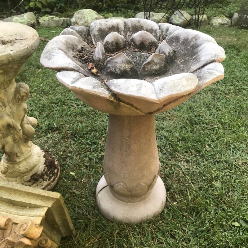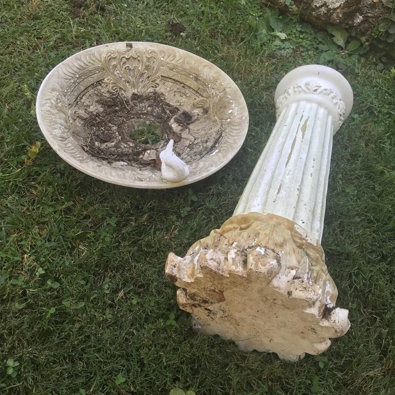 Lovely yard lot with three bird baths and three pillars. The largest bath is white with a detachable top standing approximately 25” high. There are two pillar heads perfect to create illusions in your yard. Materials and weight vary piece by piece, but all most light enough for one person to load. The heaviest, the pillar with cherubs holding hands, is possibly cement. There can be blemishes and evidence of the elements throughout, but all are sturdy and have life left in them. See photos. No shipping.