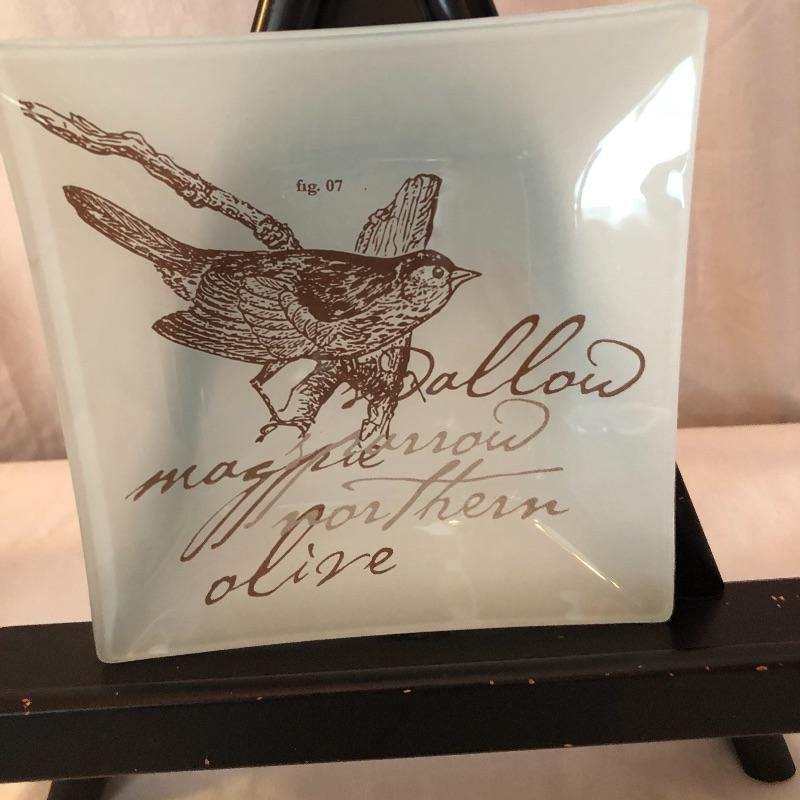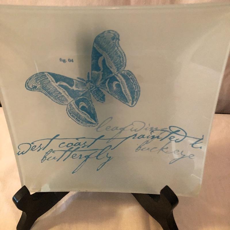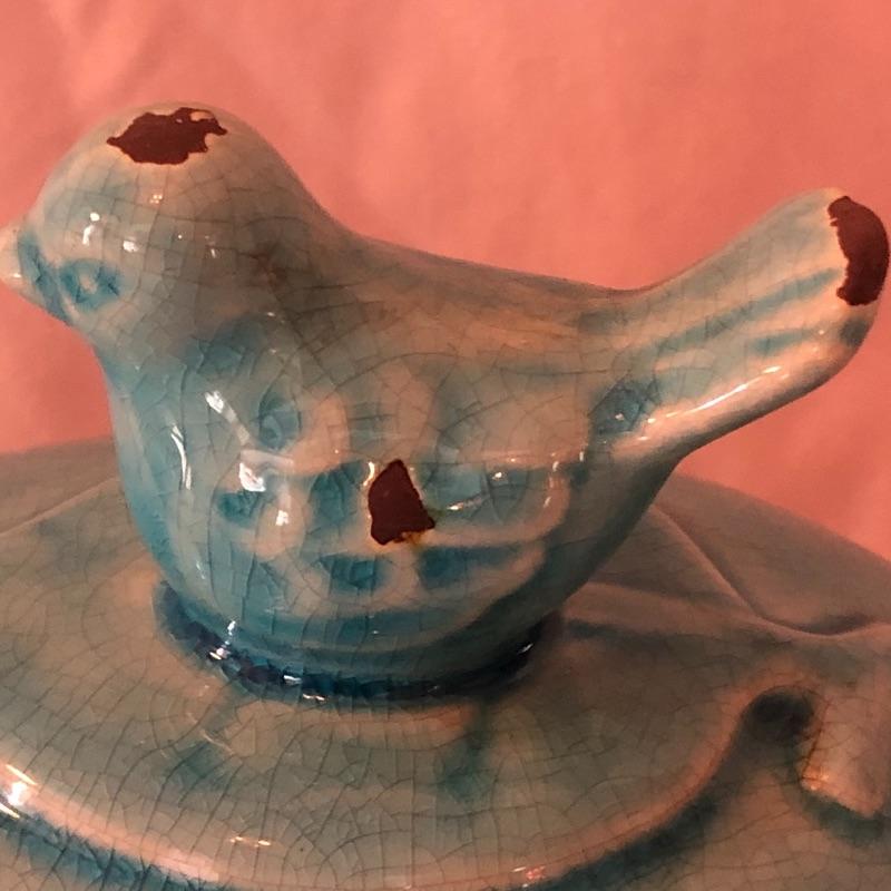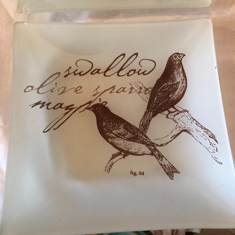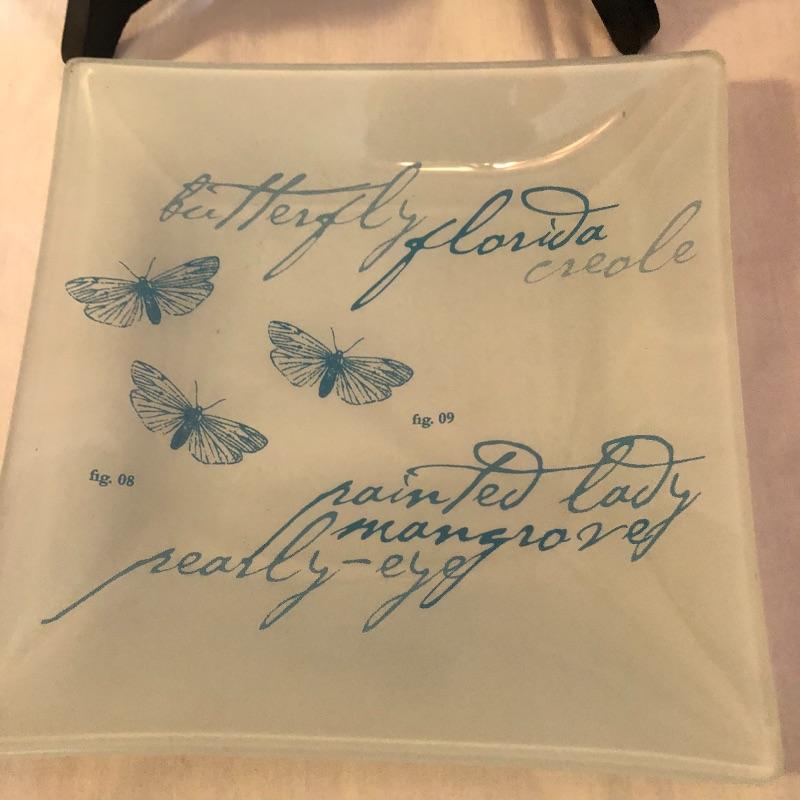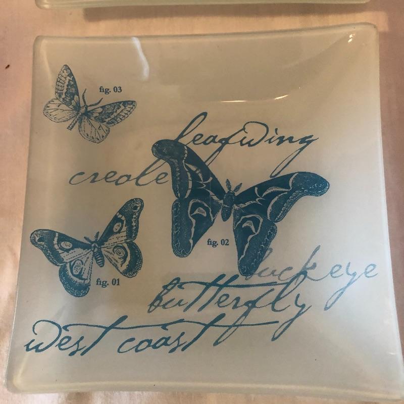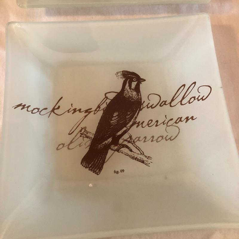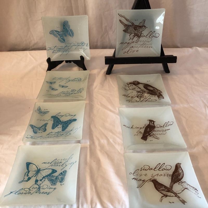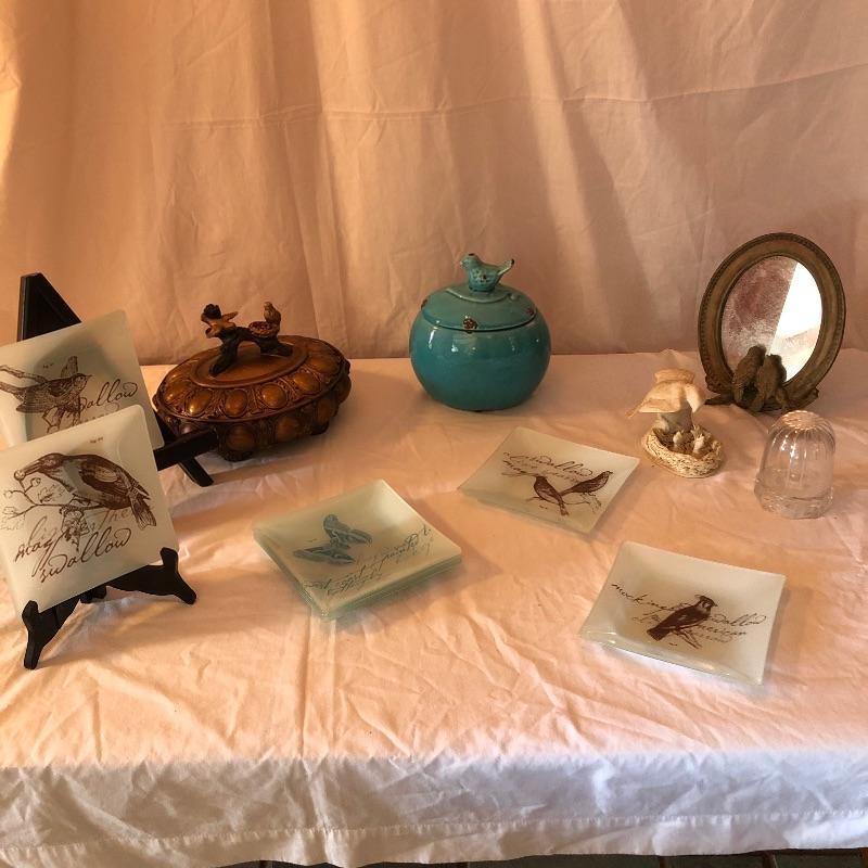 This lot includes many bird related items! It includes a gold bird bowl with lid, a blue crackle glaze bowl with lid, a momma bird with babies figurine, oval bird mirror and four bird plates and four butterfly plates. Plates measure 6” x 6”. Shipping available.