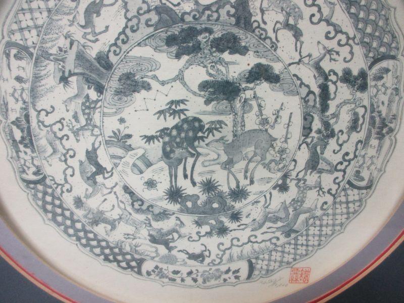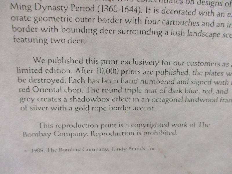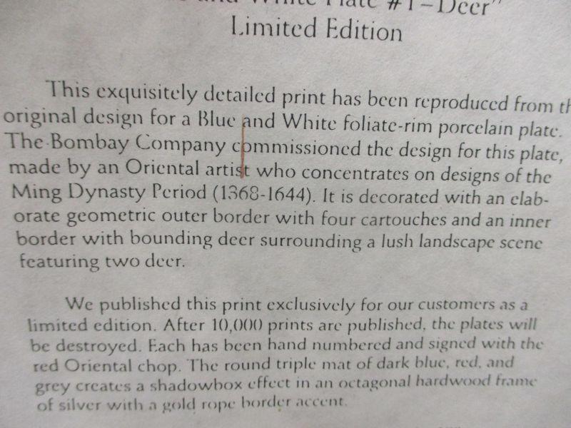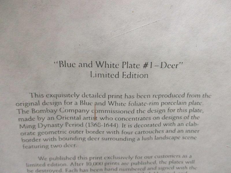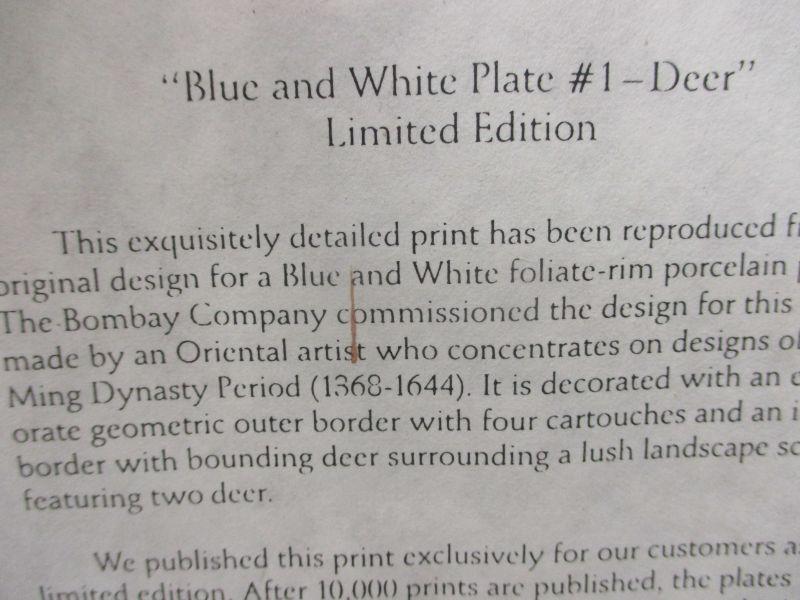 Bombay Company Private Collection "Blue and White Plate # 1 Deer". It is a vintage limited edition from 1989, and it is number 5629 of 10,000 (after 10,000 prints the plates were destroyed). It is signed with the red Oriental chop.