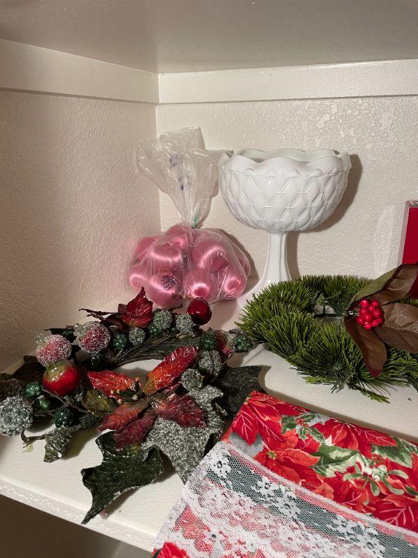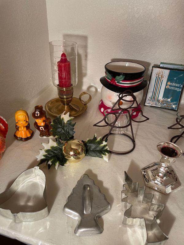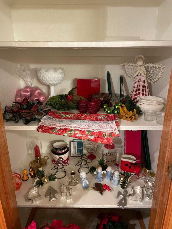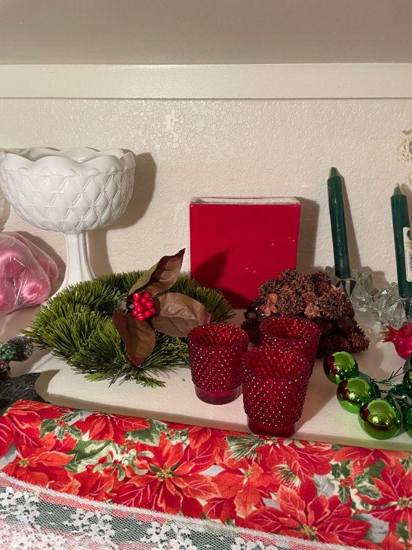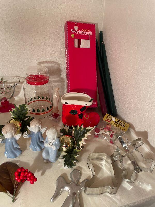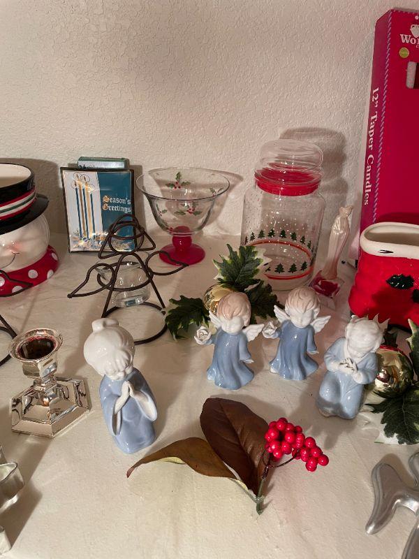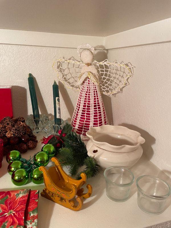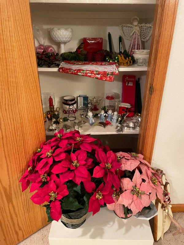 CHRISTMAS DECORATIONS, FAUX POINSETTA PLANTS IN POTS, CANDLES, ANGELS, CANDLE HOLDERS, AND MORE