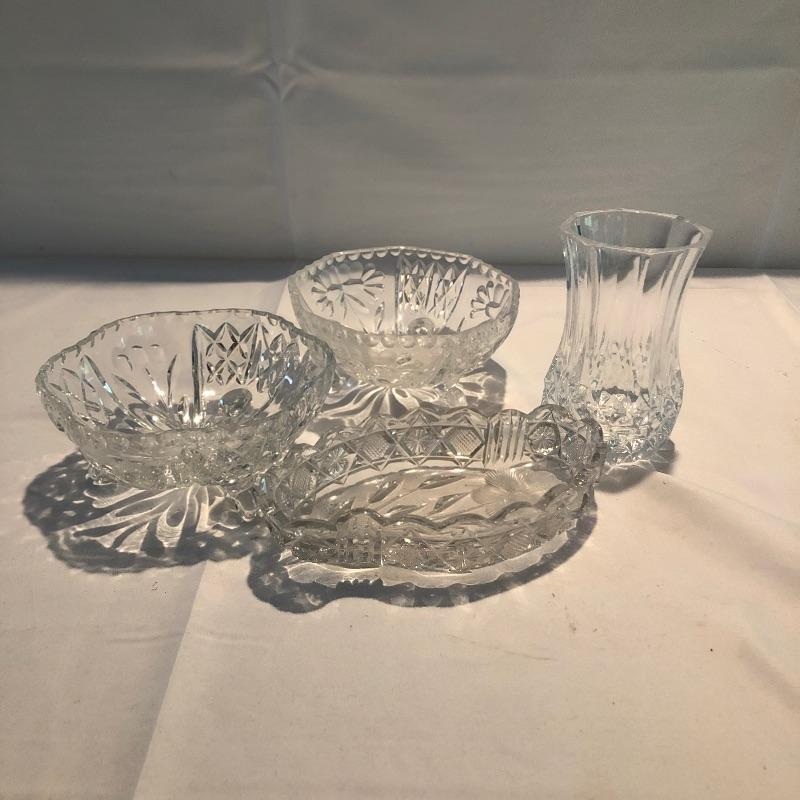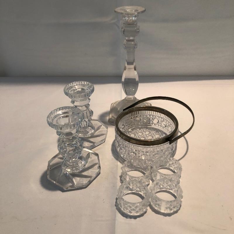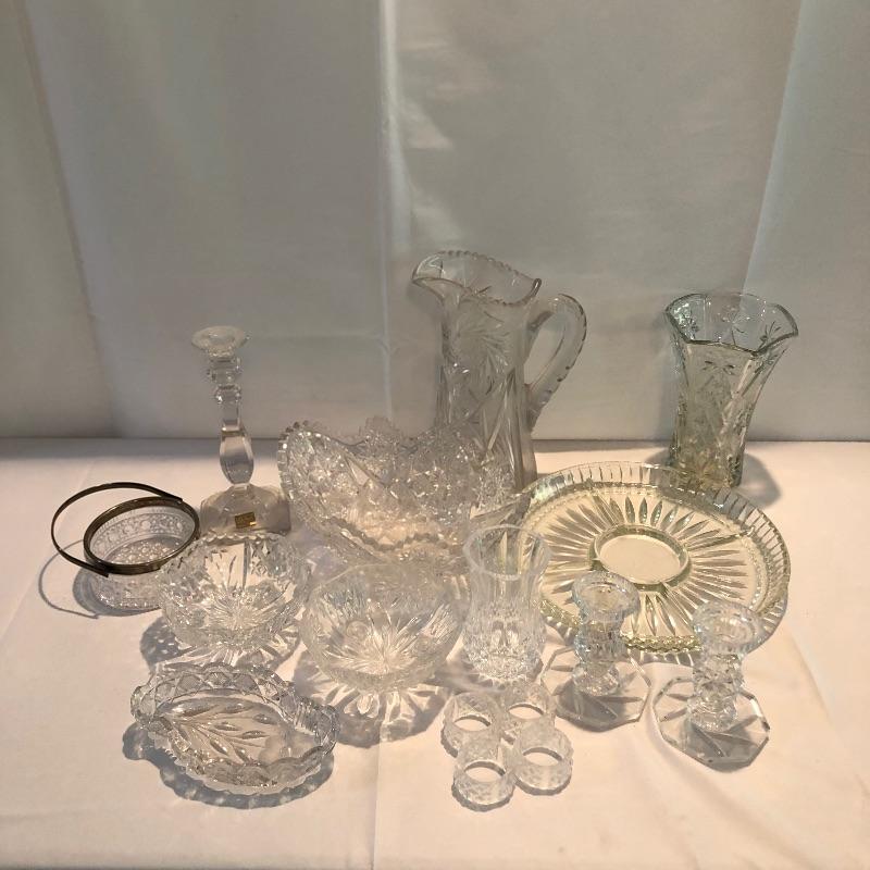 This lot comes with a myriad of glass pieces that are perfect for a fancy dinner party or nice occasion. From a pitcher (6"x11"), to a ice bowl, to glass napkin rings, this lot has it all! If you want to spice up your collection of dining ware, look no further, because this lot will make your home look like Martha Stewart’s! Local pickup only.