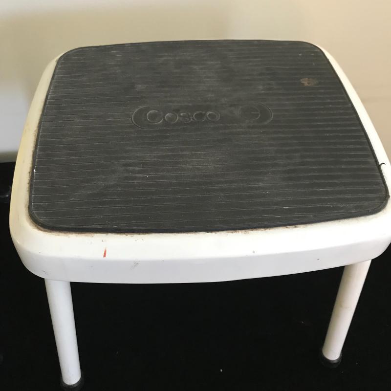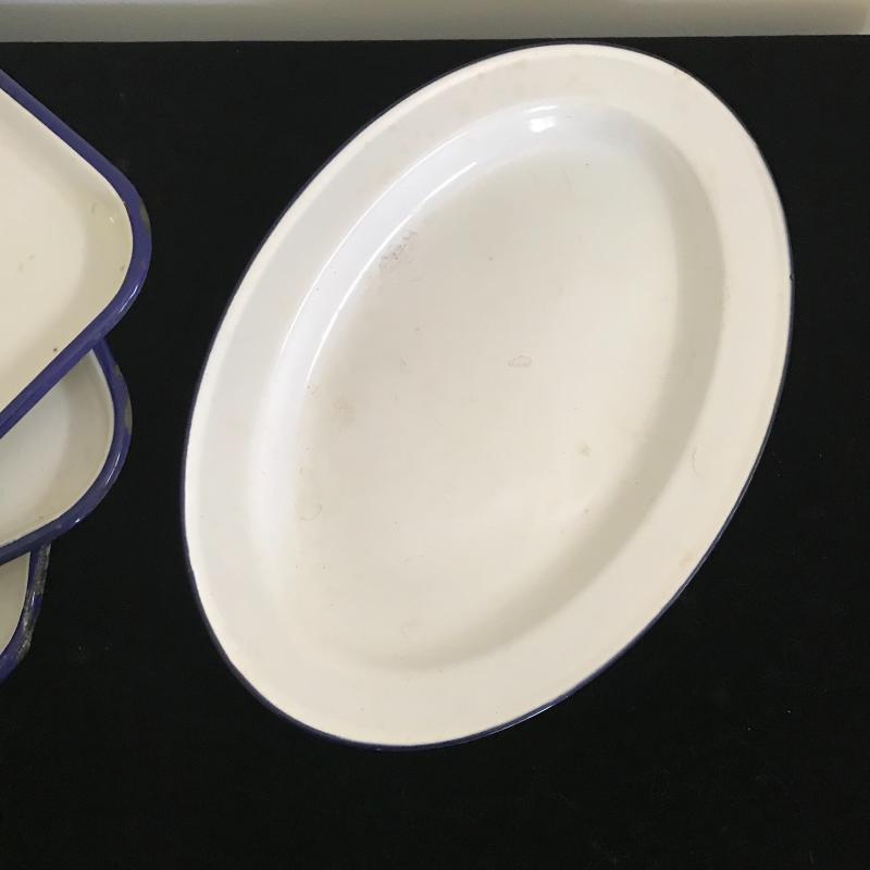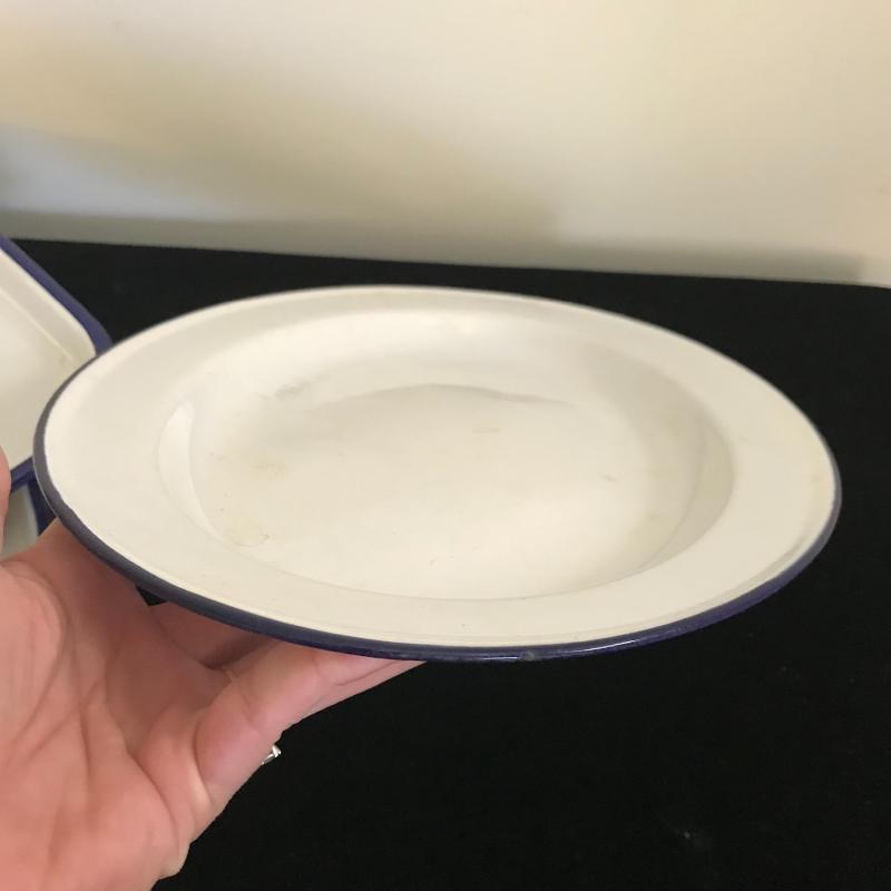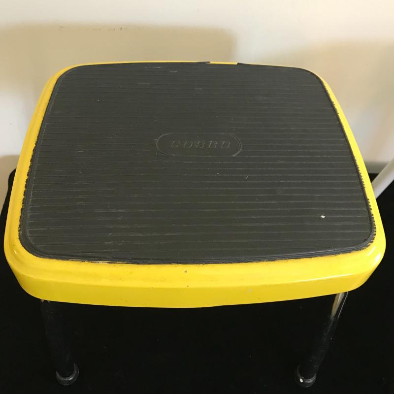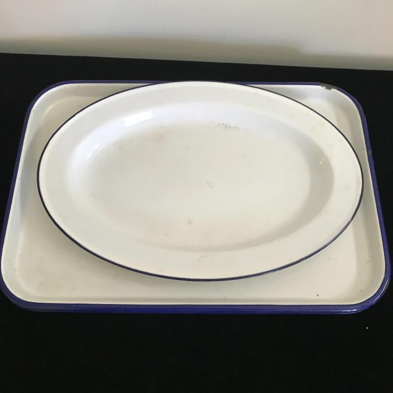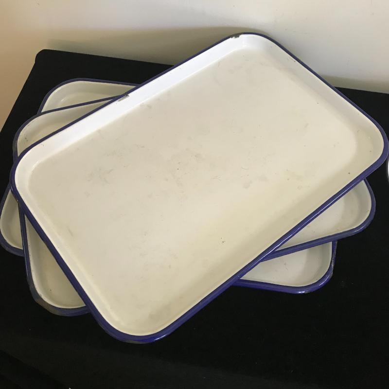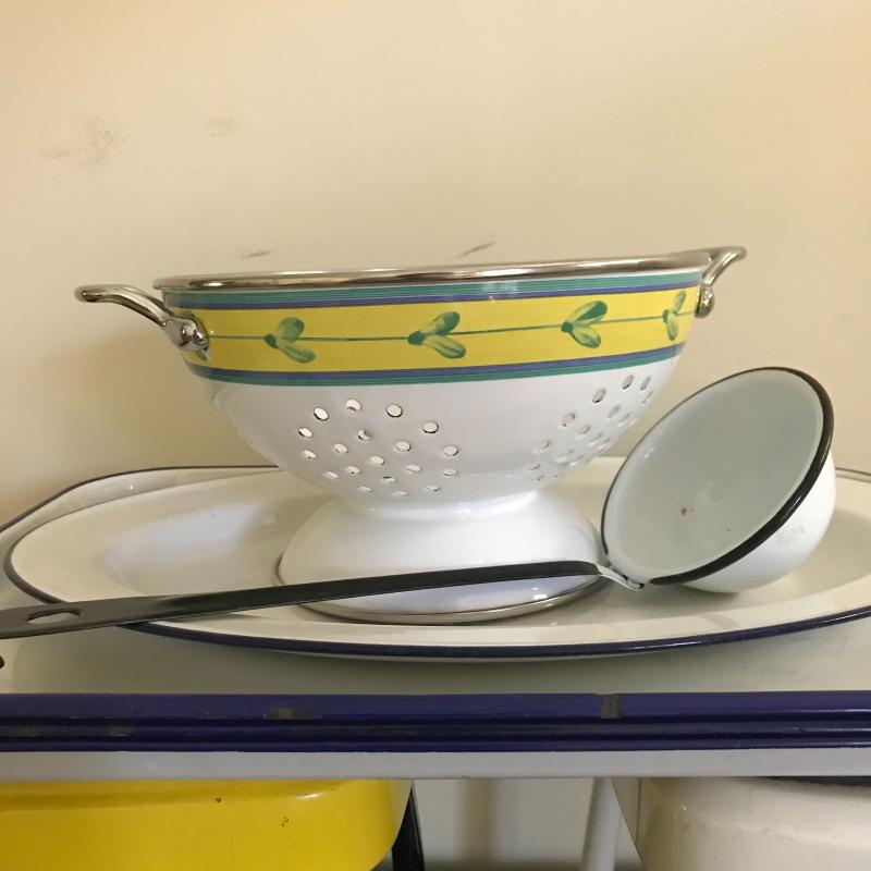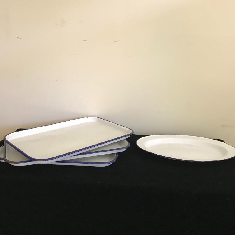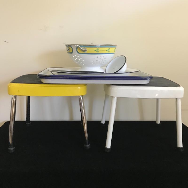 Fun lot includes a wonderfully painted colander, soup ladle, three large (17.5”x12”) rectangle serving trays with a smaller oval tray all with blue rims, some rims are worn, and lastly two Cosco step stools. Local pick up only.