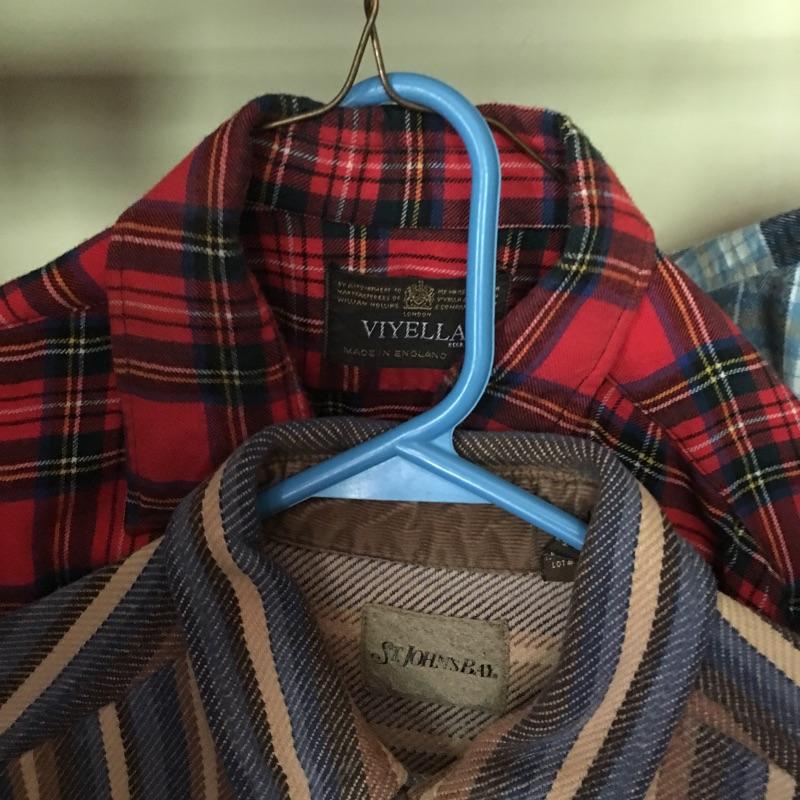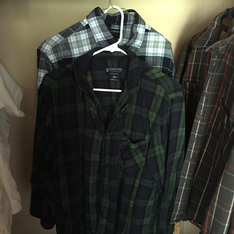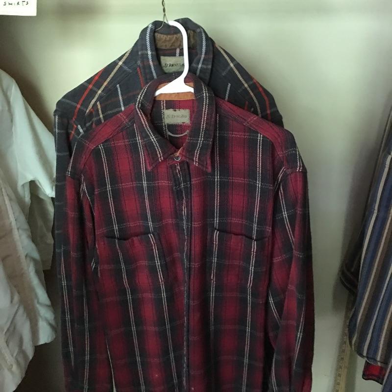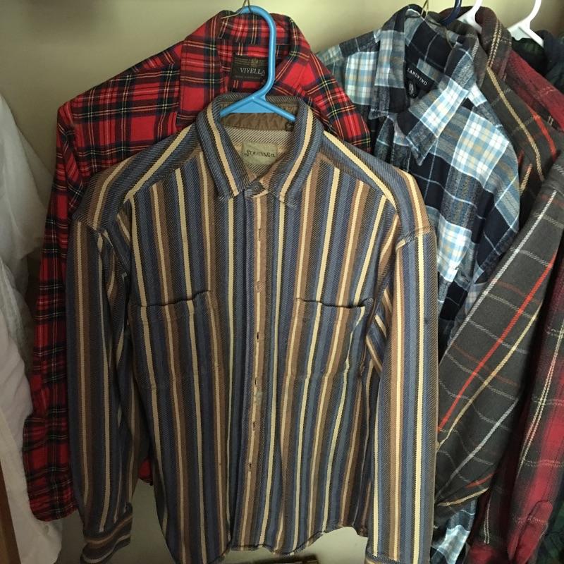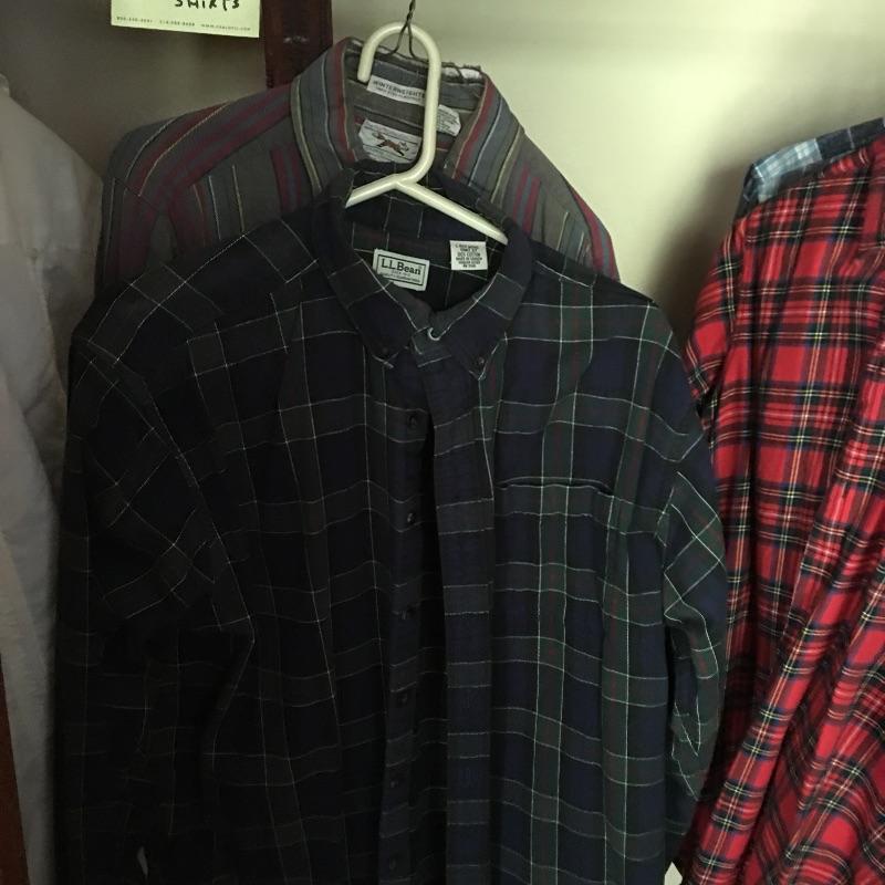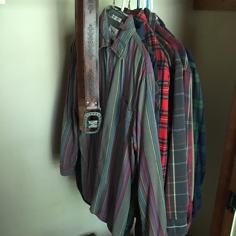 Eight flannel shirts and leather belt with M on buckle. Be ready for fall with these comfortable warm flannel shirts. Five shirts are medium and three are large, Belt measures 43” with buckle
