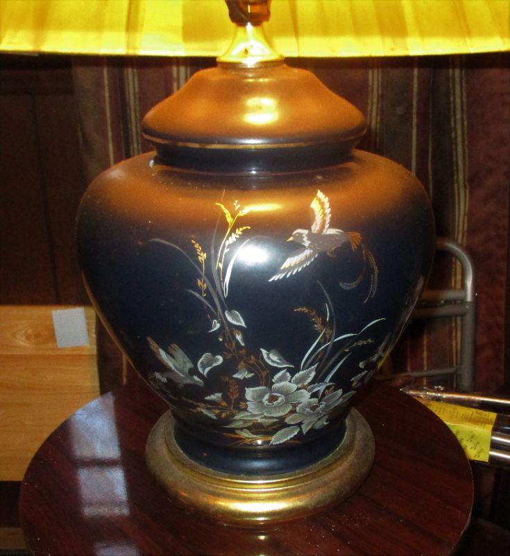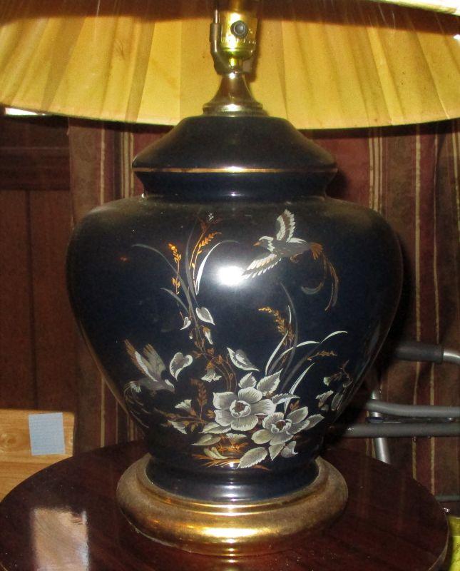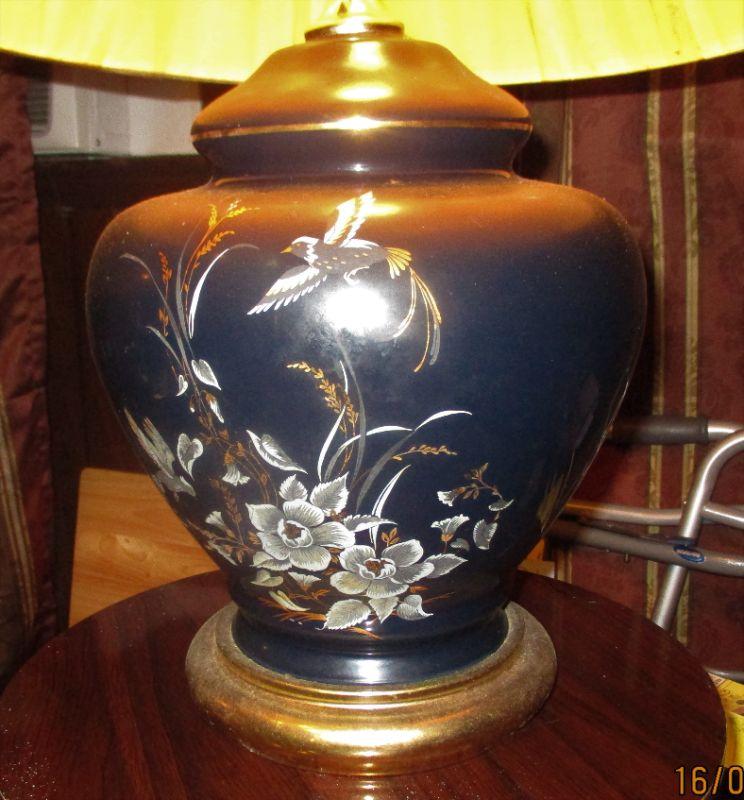 Very deep midnight blue with a floral and bird design that is a 3 way light. The base is 15" tall and matches lot 188.