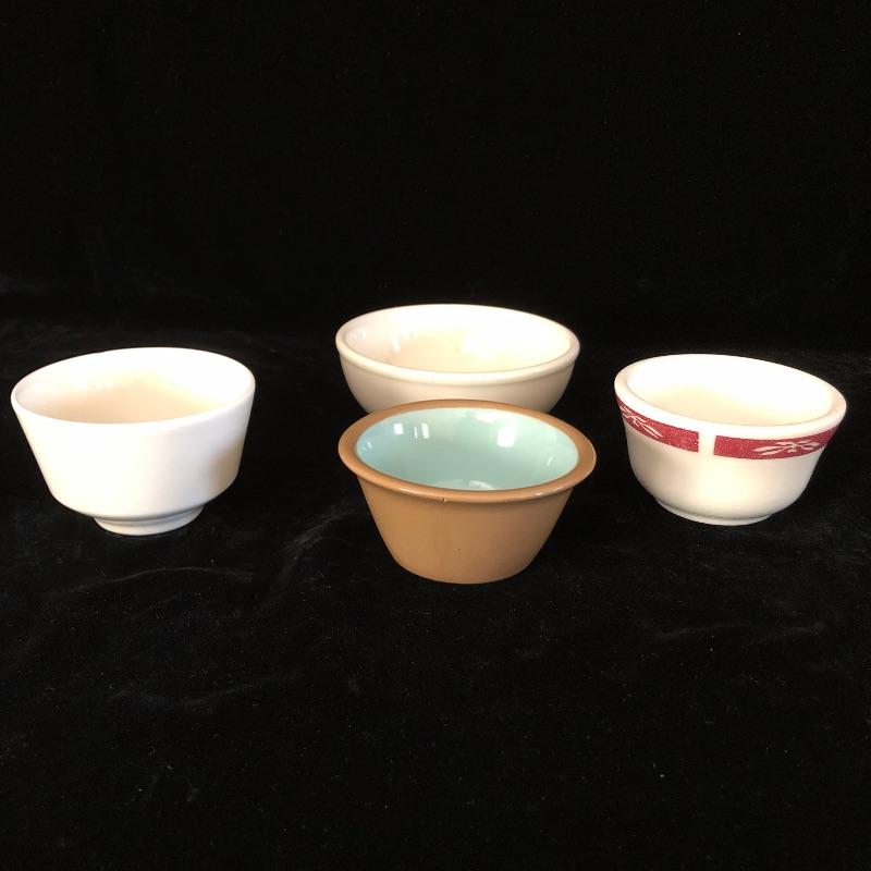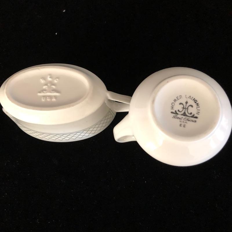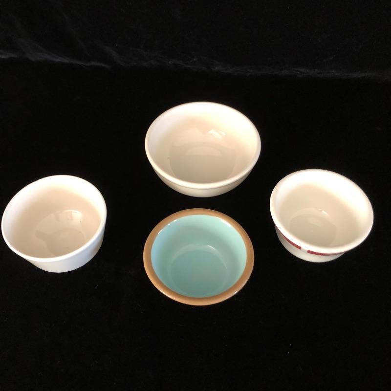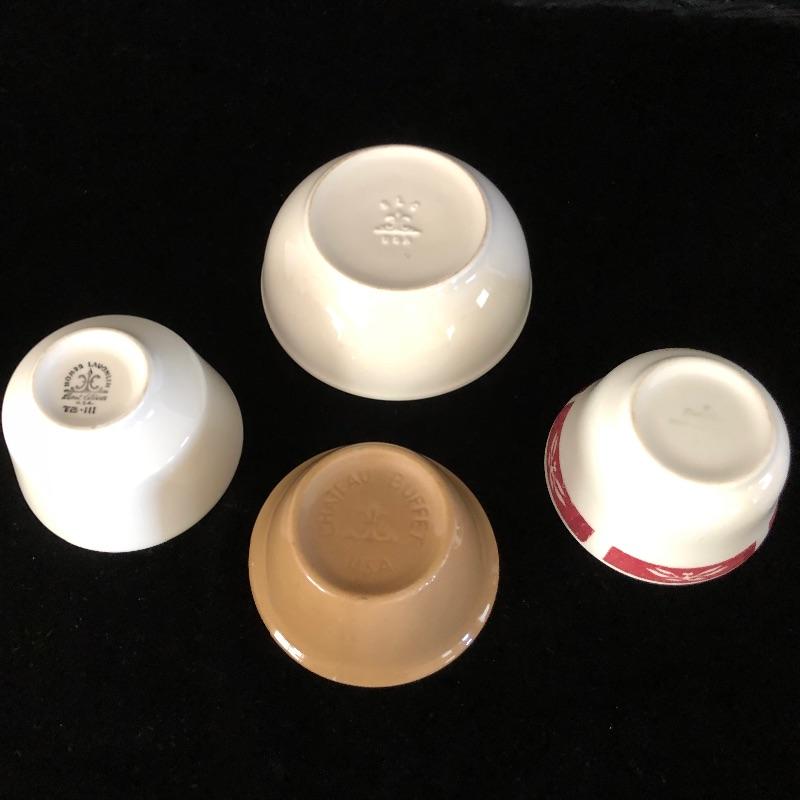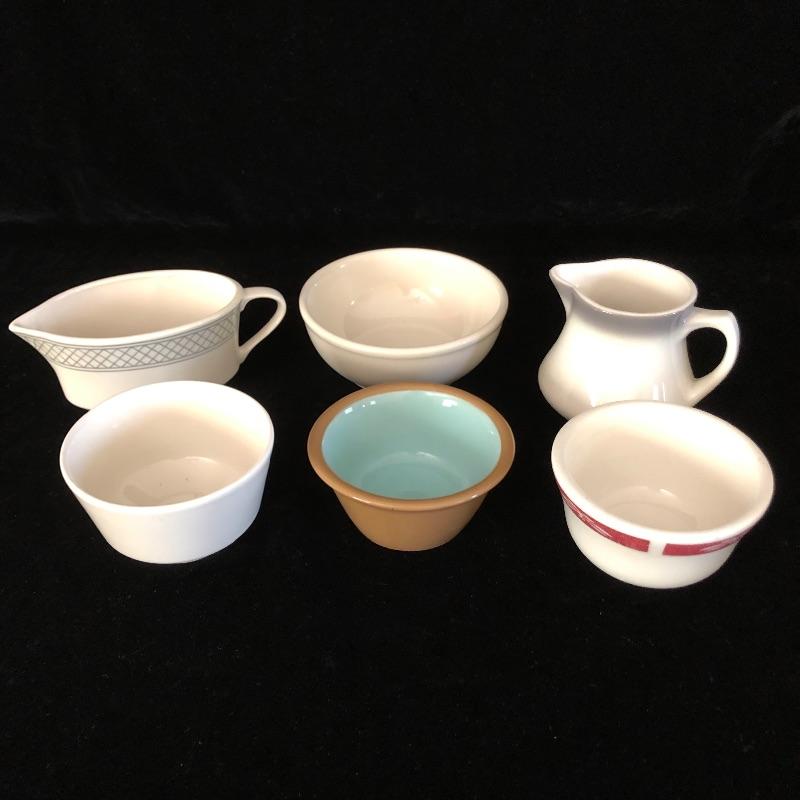 Six pieces in total that includes four small bowls and two creamers. The smallest brown bowl is the only piece not marked Homer Laughlin, it is stamped Chateau Buffet.
