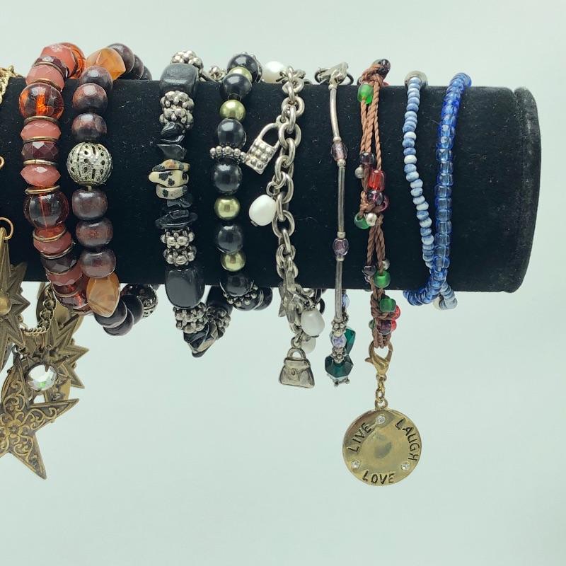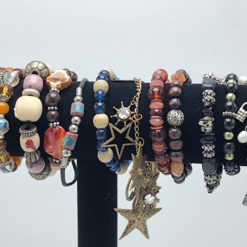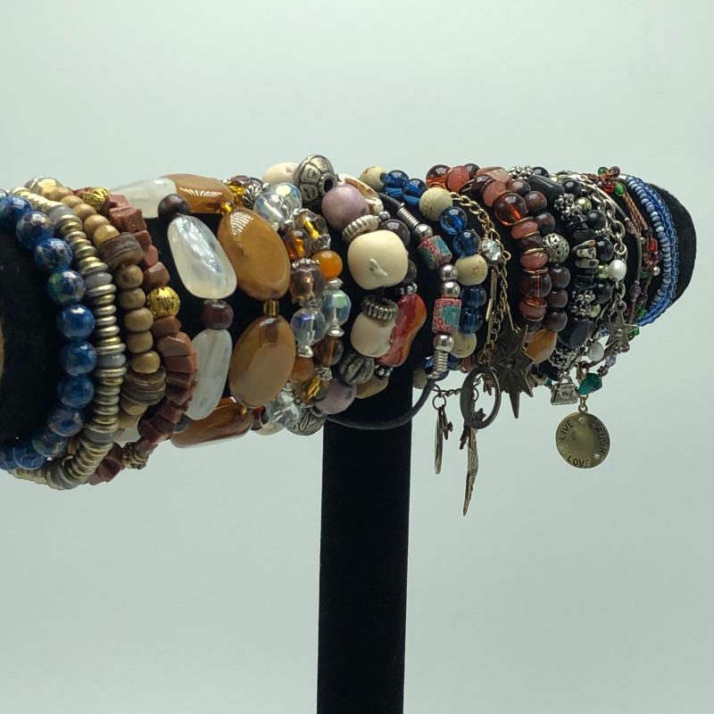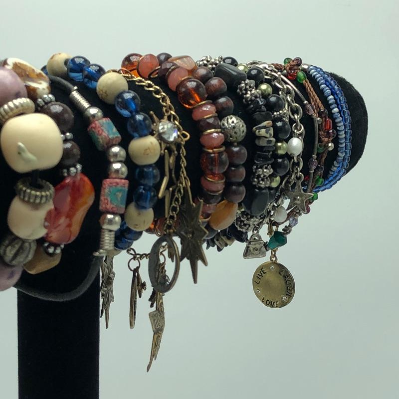Necklaces and bracelets galore! Throw in a few cool rings and a couple of pairs of unique pierced earrings and is unique collection of jewelry with a bohemian flair is complete.