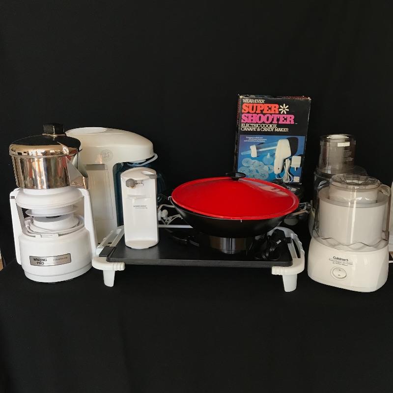 Toastmaster electric griddle, like new Cuisinart frozen yogurt, ice cream and sorbet maker, Splendid pressure cooker, West Bend wok, Waring Pro juice extractor with two unopened packs of juice extractor filters, Black and Decker electric extra tall can opener, Hamilton Beach can opener/knife sharpener, WaterWise water purification system with six unopened filters, Sunbeam Mixmaster, Rival electric steamer, West Bend non-stick electric skillet, Super Shooter with original packaging. See photos. All pieces turn on when plugged in. No shipping.