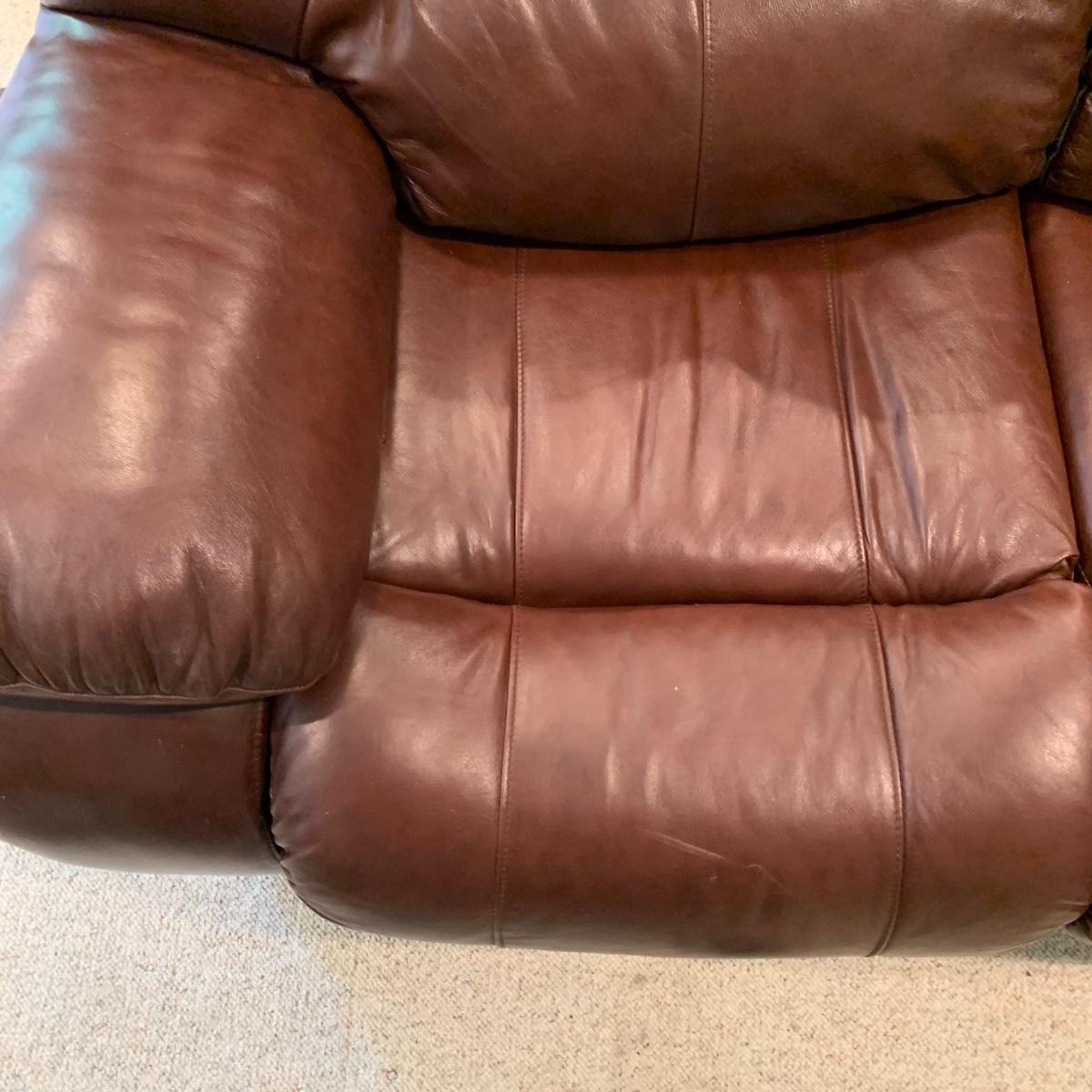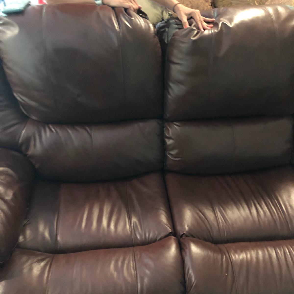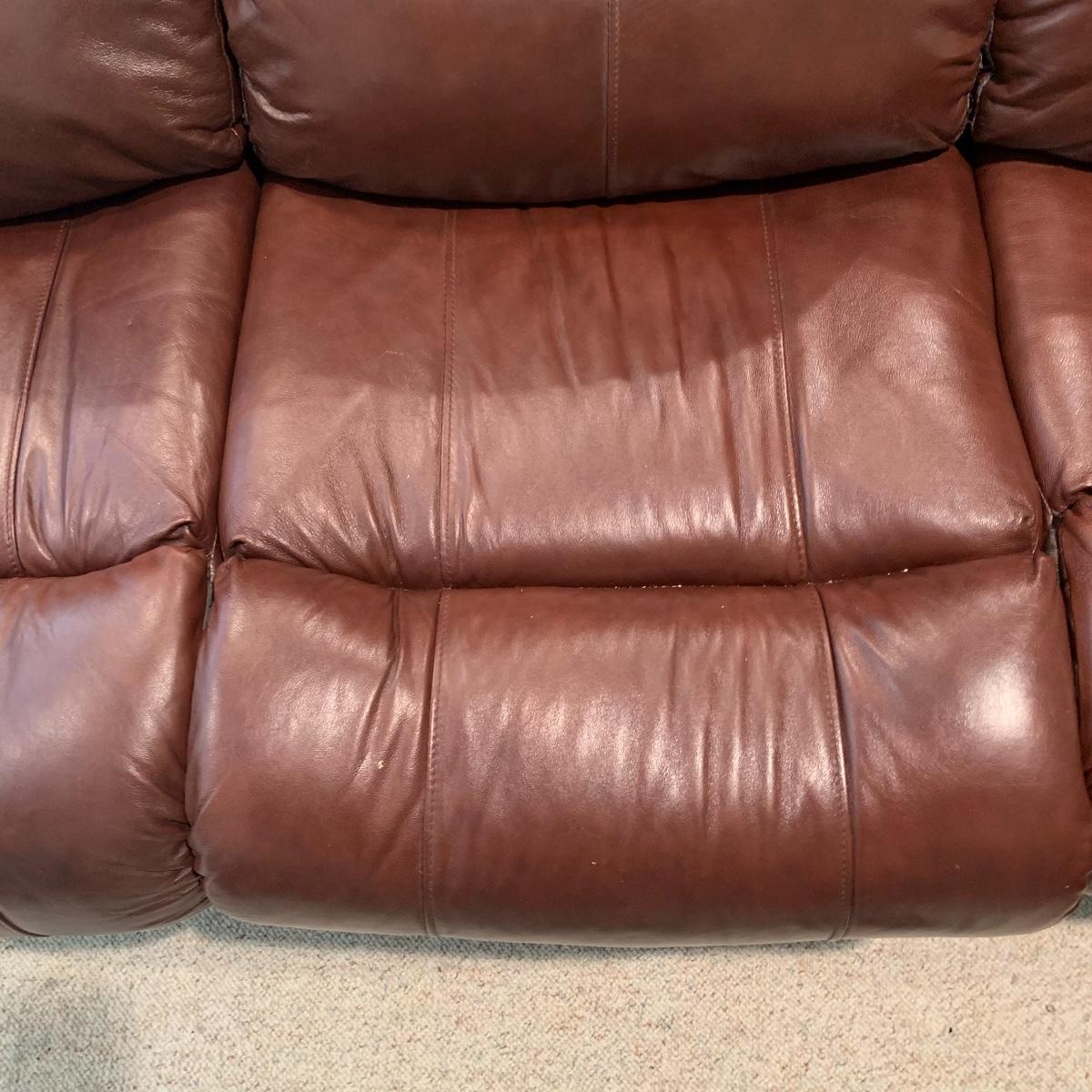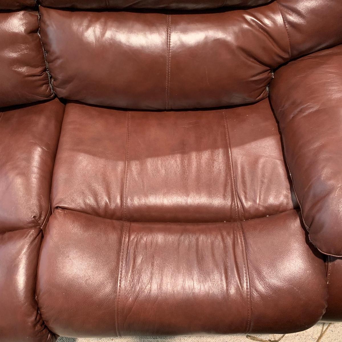Are you searching for a quality leather sofa? Look no further. This couch is made of soft brown leather and features recliners on either side. It measures 84” long X 40” tall X 36” deep with a 19” seat height. There is some wear where the cushions rub together, see pictures but it is hard to see. Matches recliner in lot 114. LUnknown manufacturer.