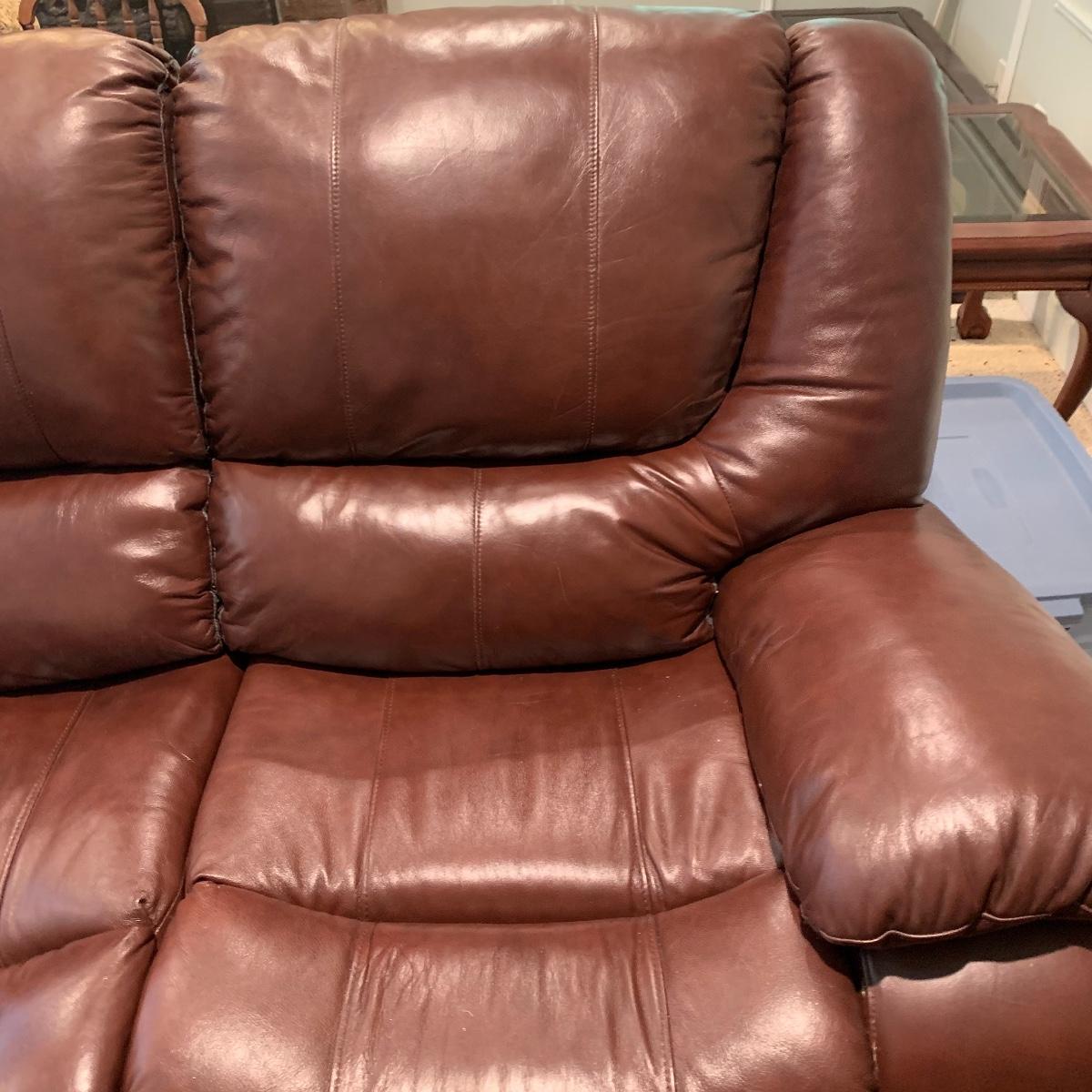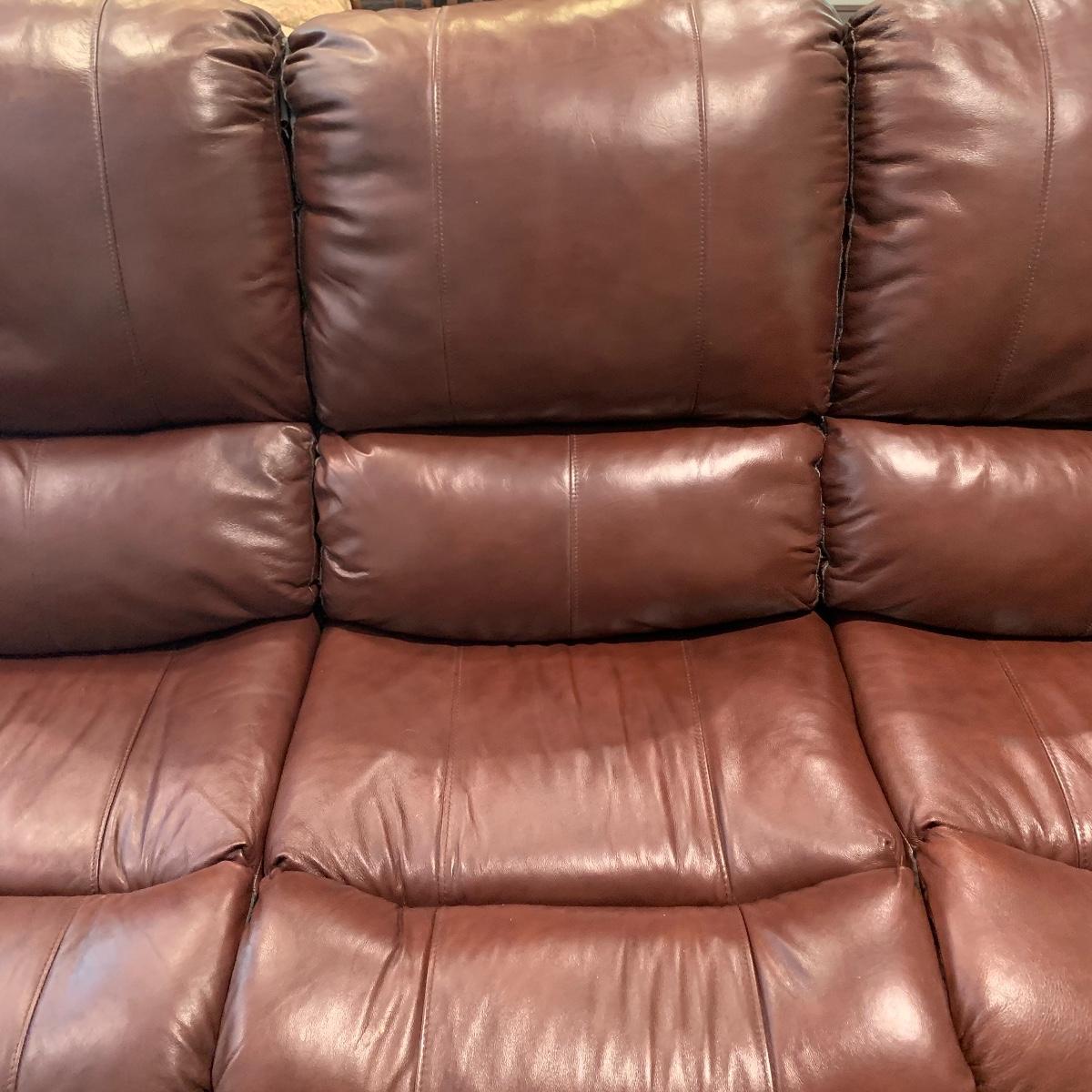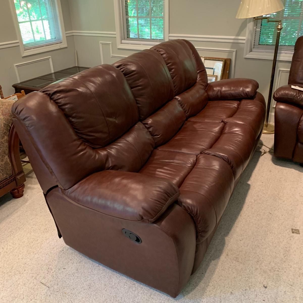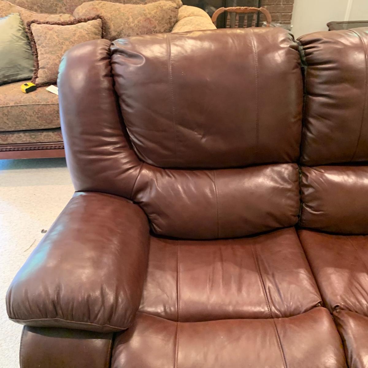 Are you searching for a quality leather sofa? Look no further. This couch is made of soft brown leather and features recliners on either side. It measures 84” long X 40” tall X 36” deep with a 19” seat height. There is some wear where the cushions rub together, see pictures but it is hard to see. Matches recliner in lot 114. LUnknown manufacturer.