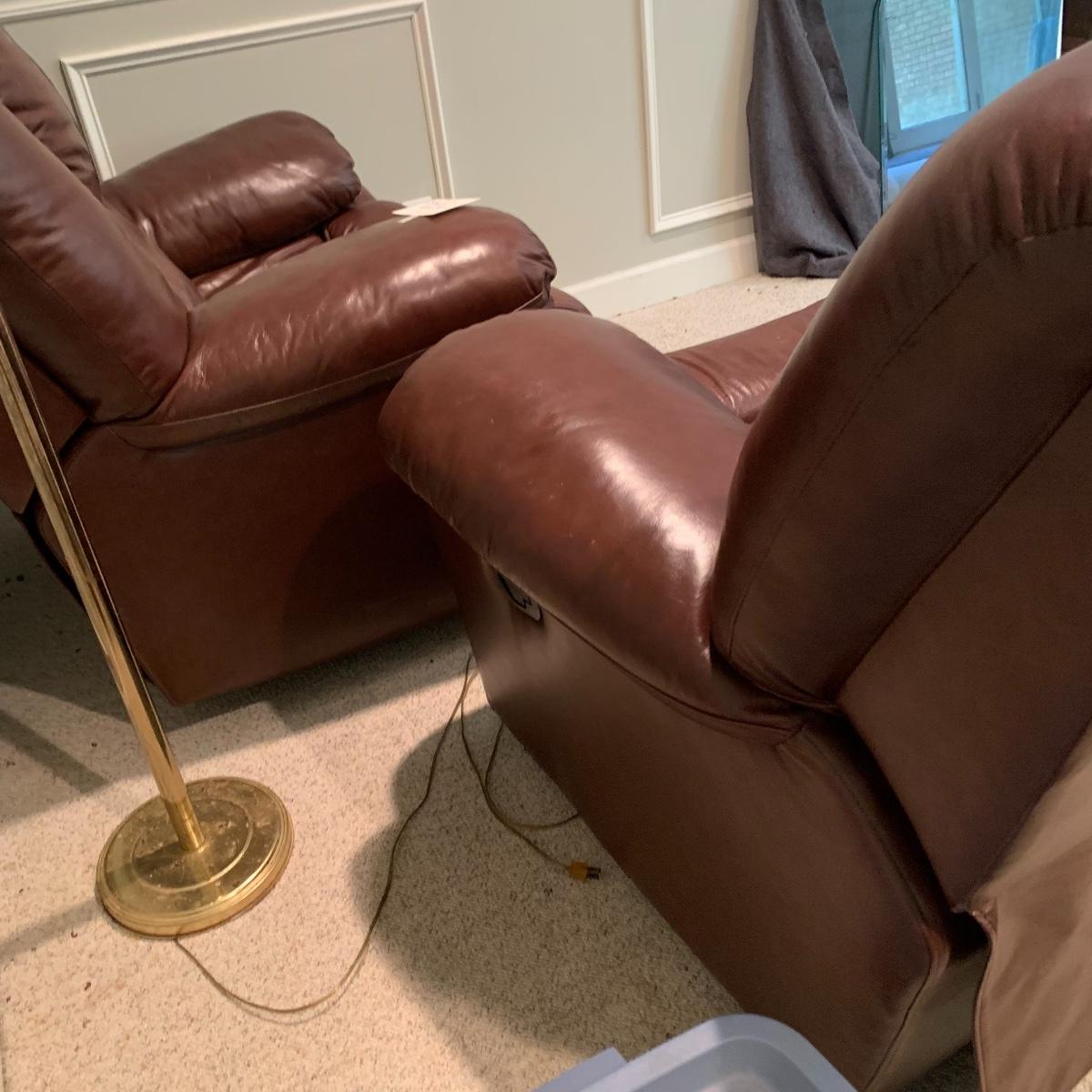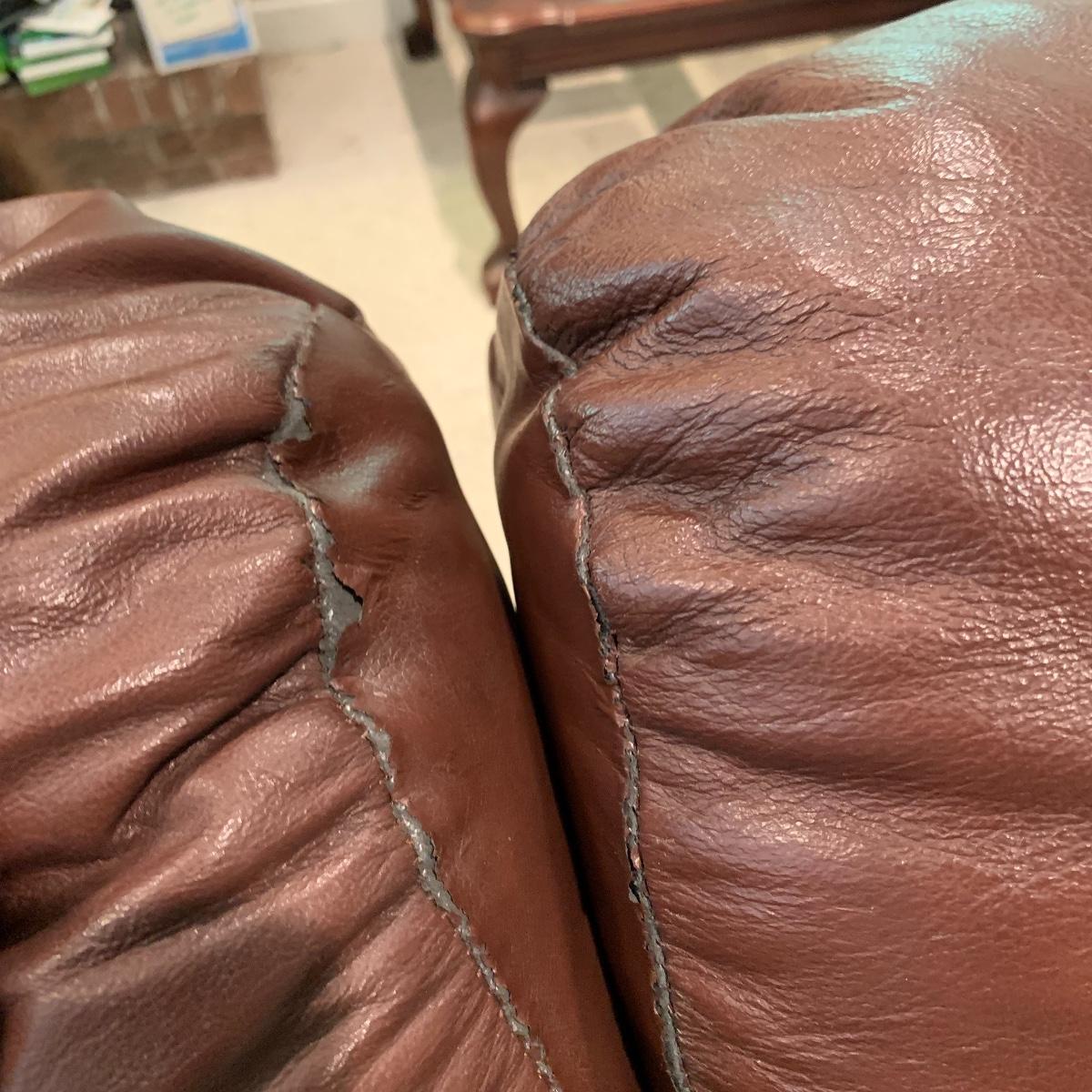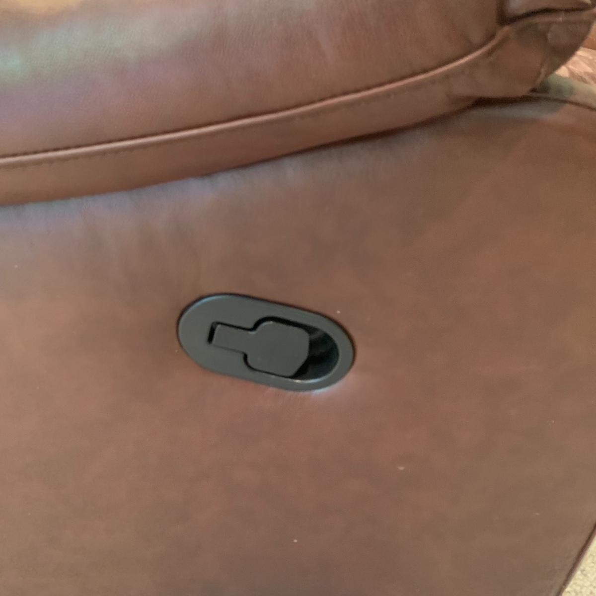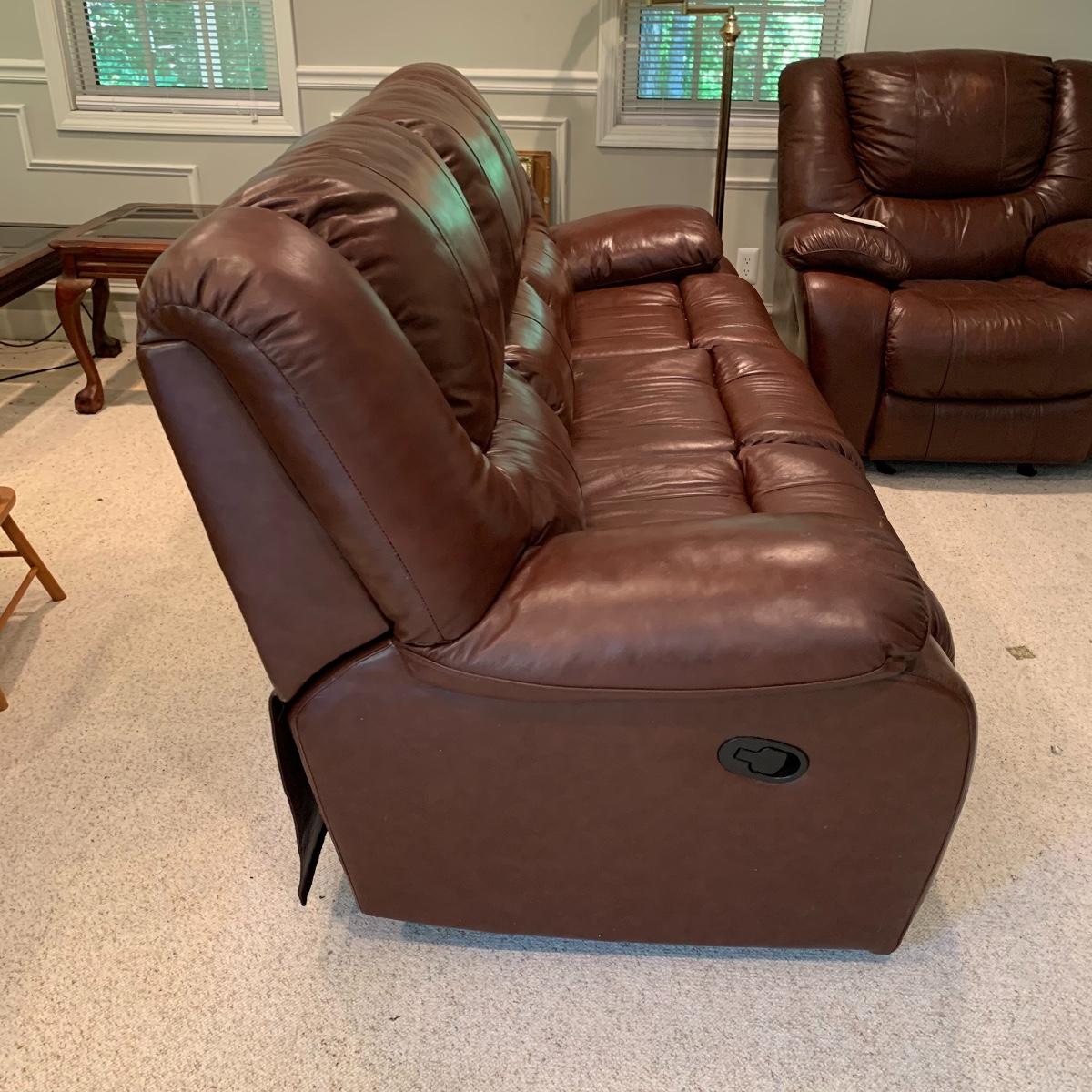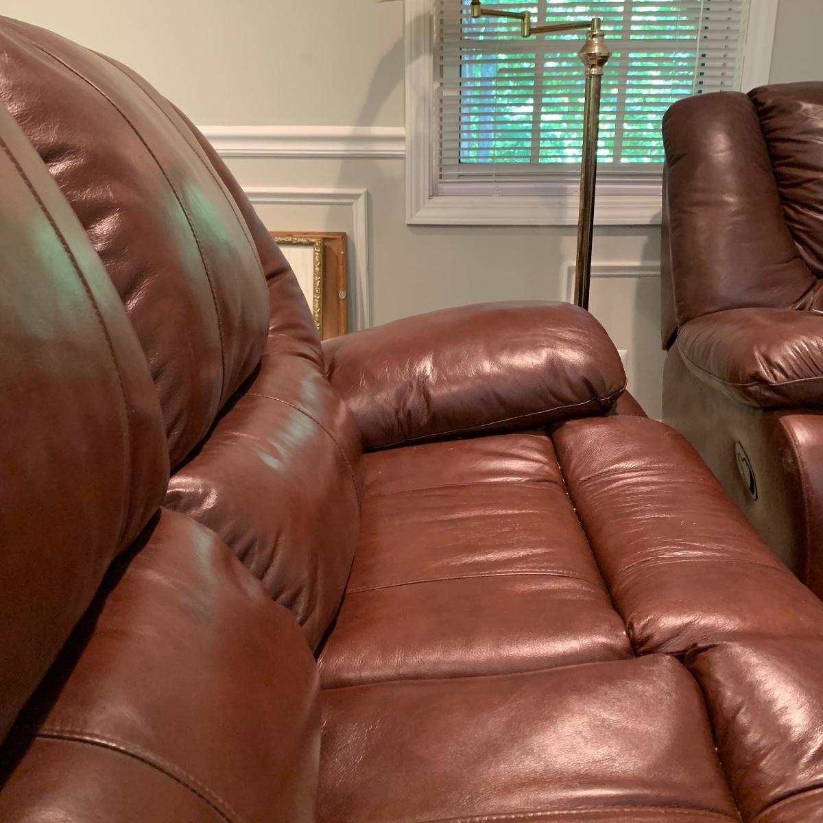Are you searching for a quality leather sofa? Look no further. This couch is made of soft brown leather and features recliners on either side. It measures 84” long X 40” tall X 36” deep with a 19” seat height. There is some wear where the cushions rub together, see pictures but it is hard to see. Matches recliner in lot 114. LUnknown manufacturer.