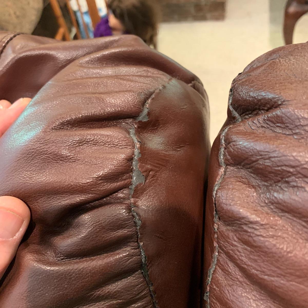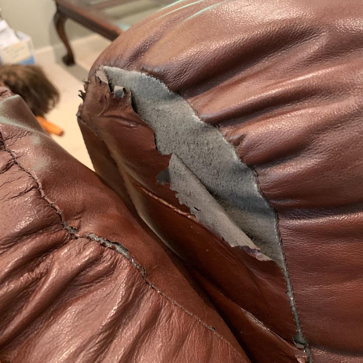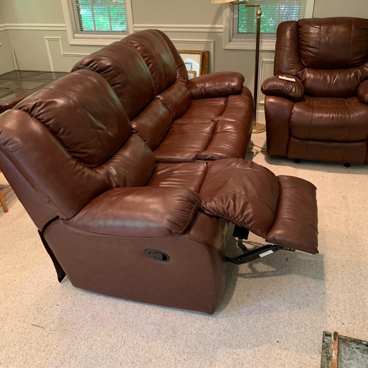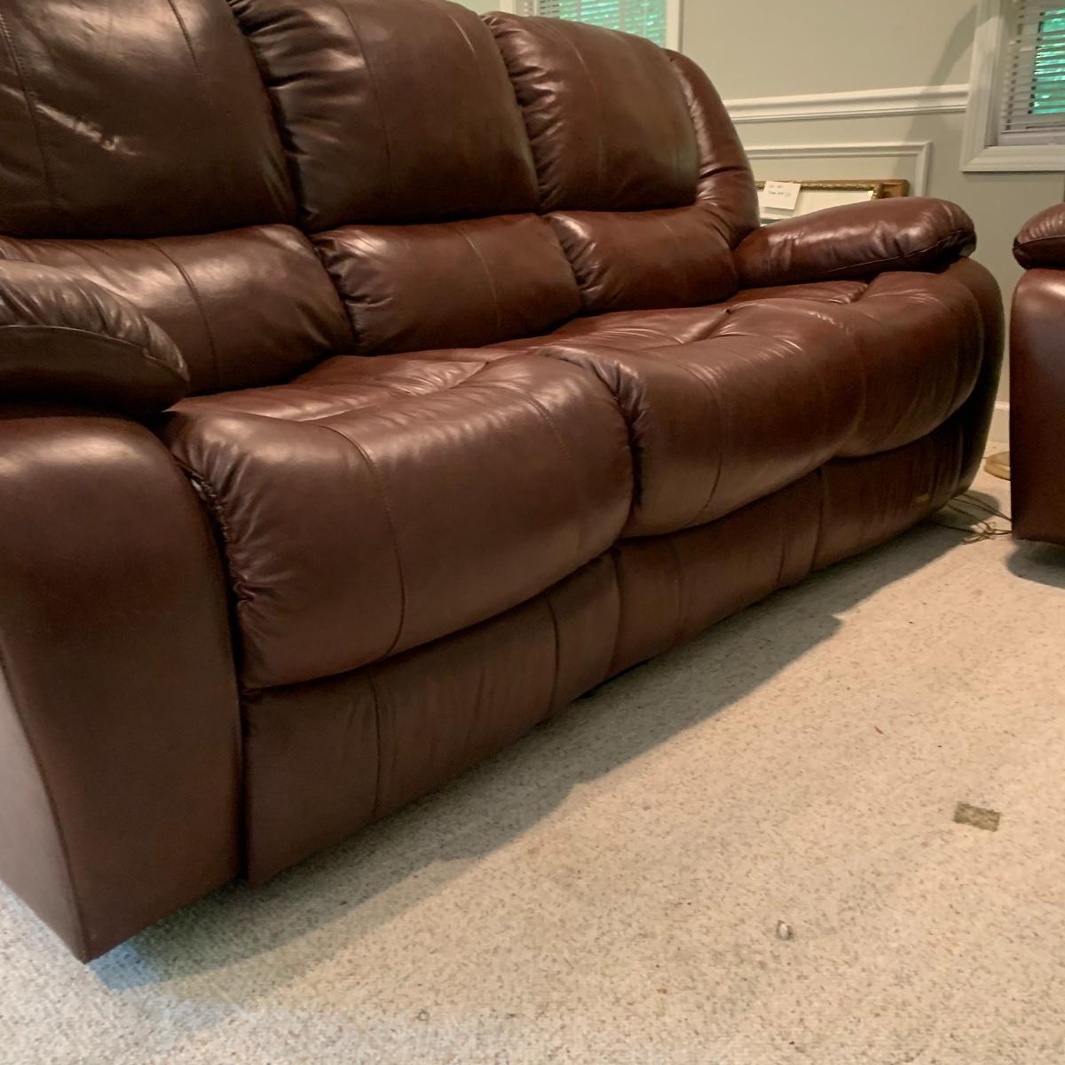 Are you searching for a quality leather sofa? Look no further. This couch is made of soft brown leather and features recliners on either side. It measures 84” long X 40” tall X 36” deep with a 19” seat height. There is some wear where the cushions rub together, see pictures but it is hard to see. Matches recliner in lot 114. LUnknown manufacturer.