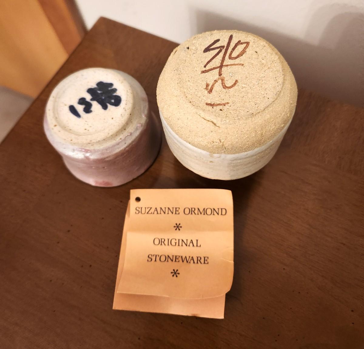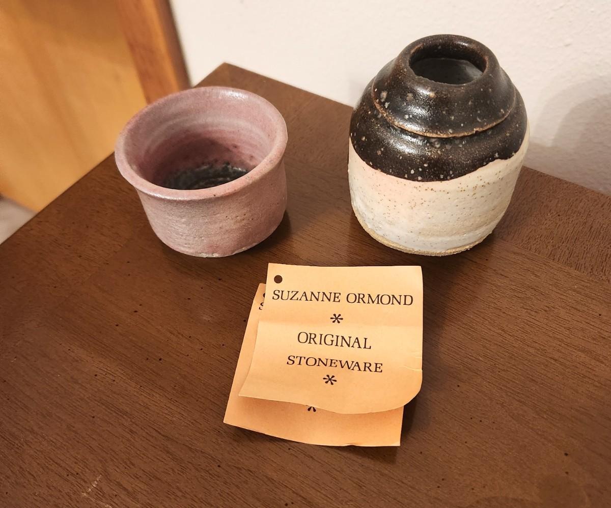 Lot of 2 pieces Suzanne Ormond (signed) stoneware pottery - larger is 3.5", smaller is 2". Suzanne is the author of Louisiana Art Nouveau: Crafts of the Newcomb Style and is a graduate of Newcomb College. Her works are widely collected.