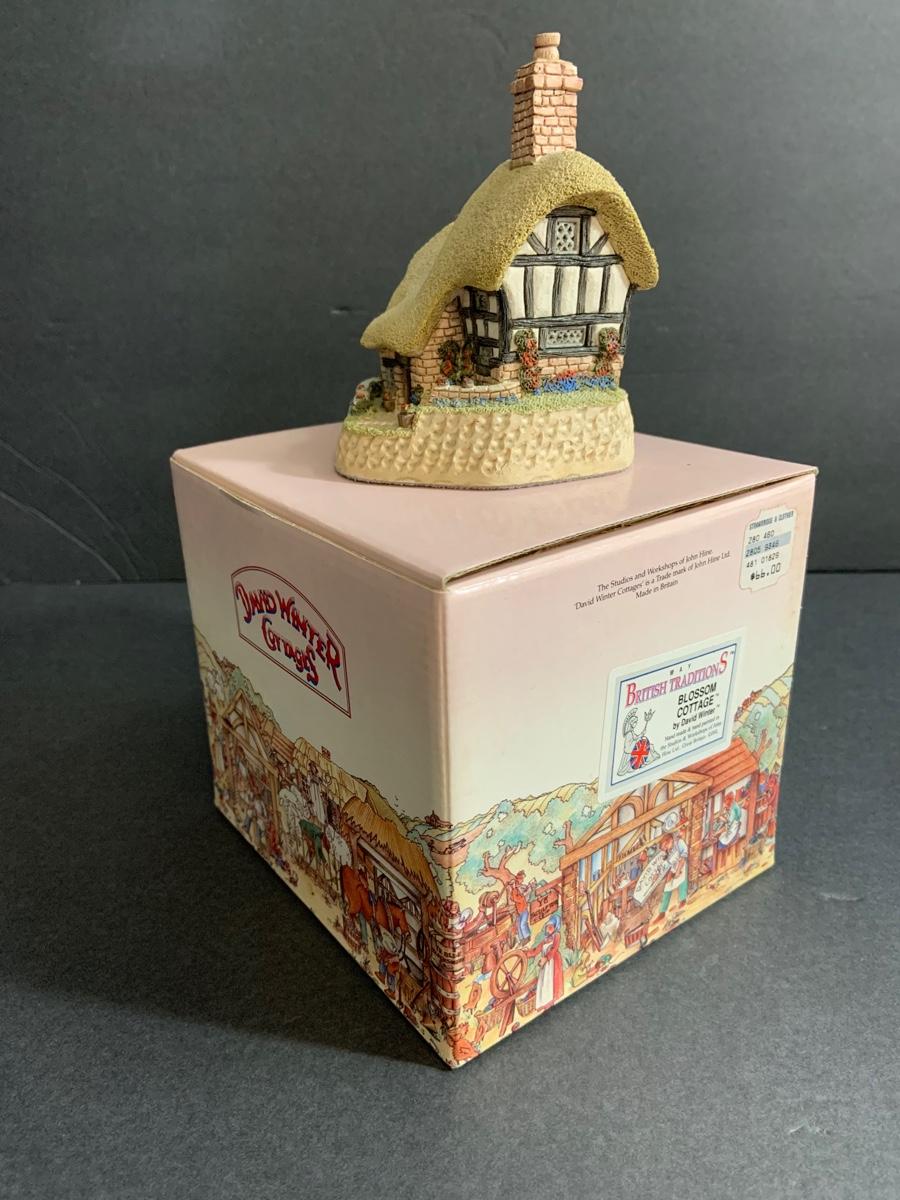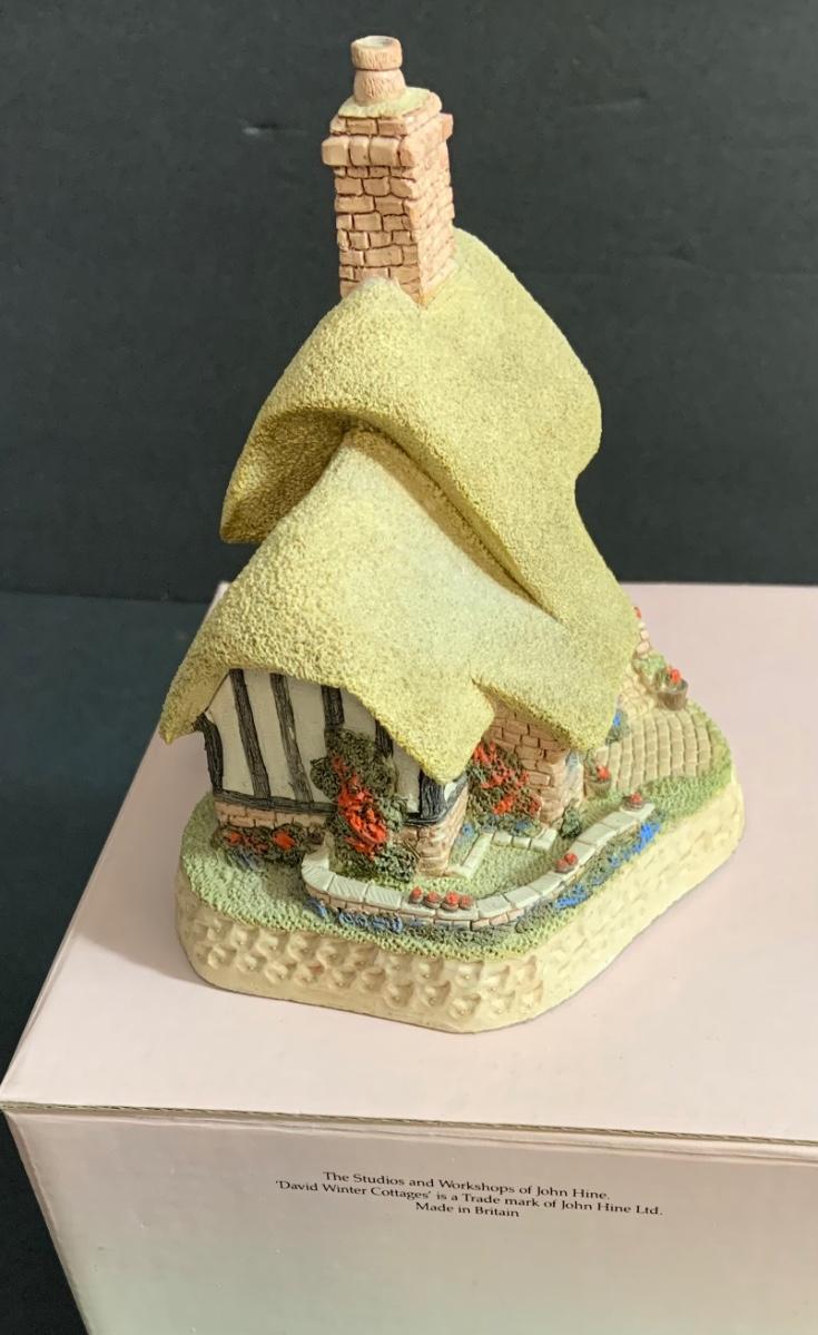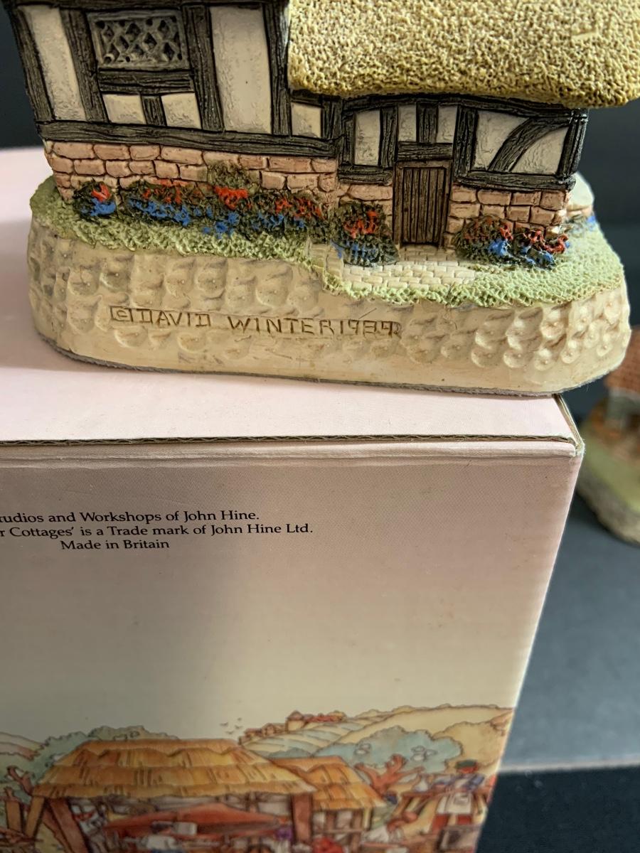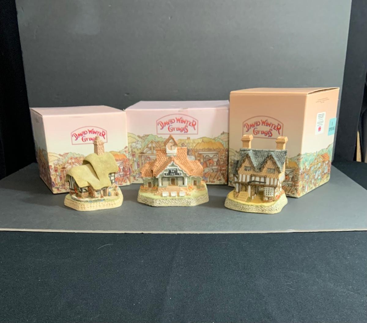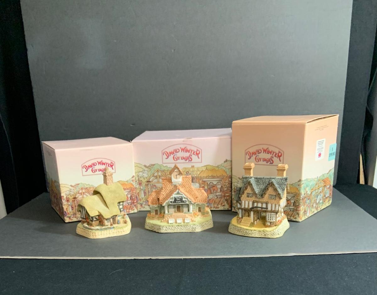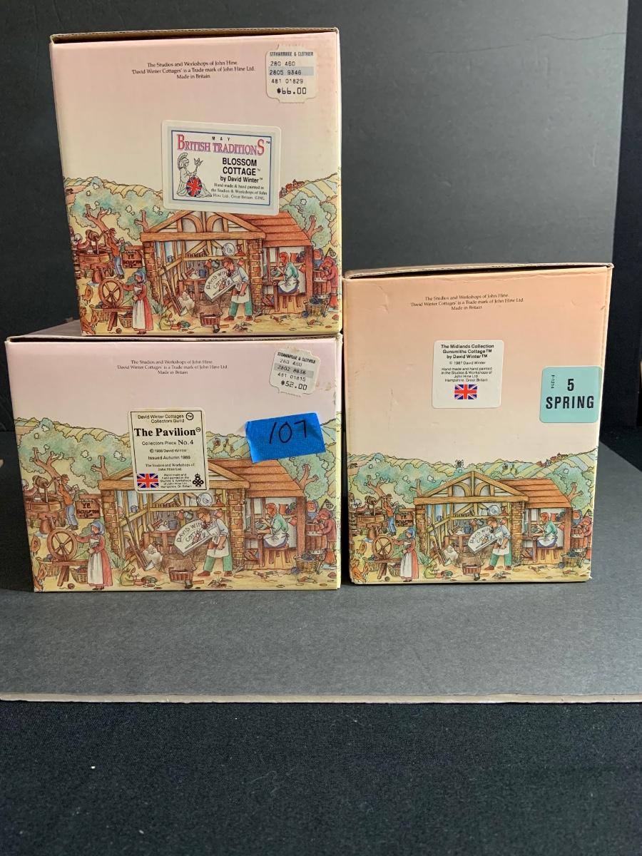 Lot :107: 3 David Winter Cottages- COLLECTORS GUILD PIECE NUMBER 4 The Pavilion, MAY BRITISH TRADITIONS Blossom Cottage & Midlands Collection Gunsmiths Cottage