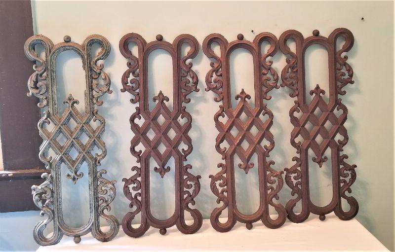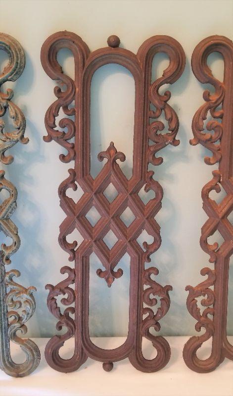One of these has been painted but the rest of these antique cast iron architecturals have their original patina. Each is 11" wide, 30" tall. Great for the Garden or patio