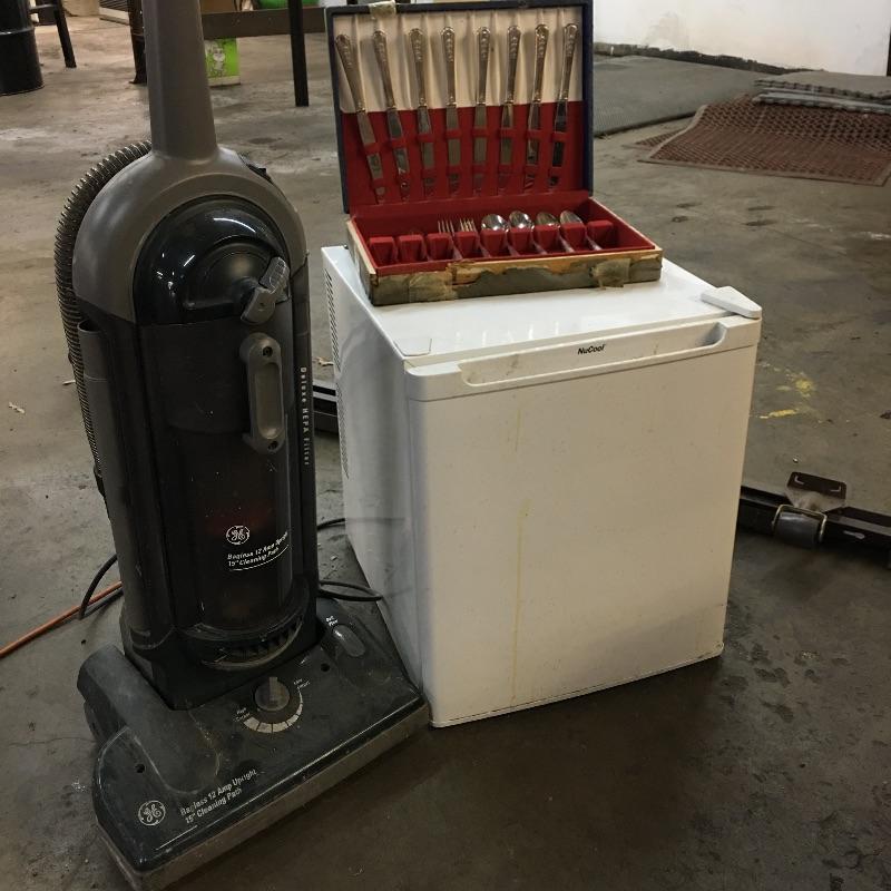 Nucool 1.7 cubic ft. Fridge, GE upright vacuum, Oneida four piece eight person cutlery set and adjustable bed frame. Mini refrigerator measures 17” x 19” x 20.5”. Great for your college bound child or anywhere else you can use it.