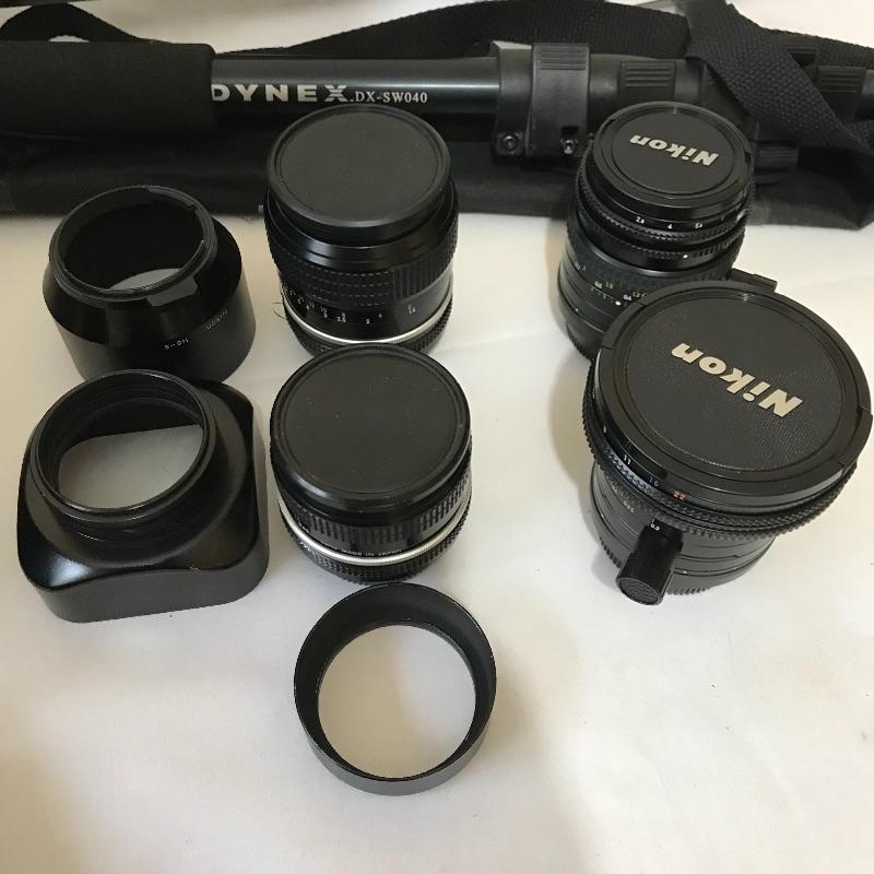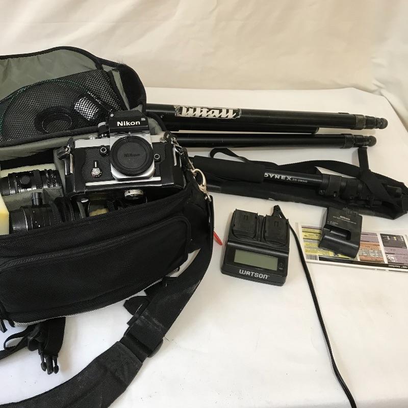 Large camera lot perfect to begin or add to your photographer’s collection. Nikon F2 with 28mm, 50mm and 105mm lenses and nice Canon case with insulation to keep your items safe. Tiltall tripod with three-way head, Dinex DX S040 monopod (case with broken zipper included), Nikon and Watson chargers for your professional or hobbyist needs. See photos. Shipping available.