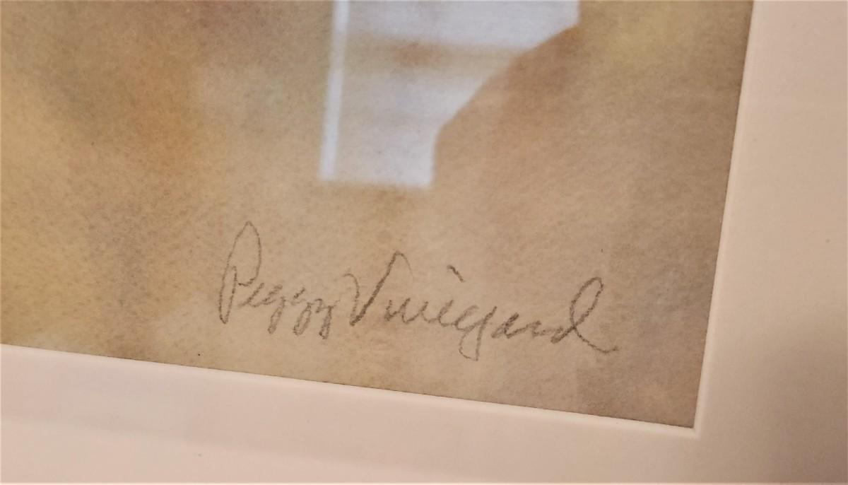 Listed Artist Peggy Vineyard is still active today in the North Carolina area - many galleries across the South handle her work. Today she is concentrating primarily on abstracts, but at the beginning of her career she focused on watercolor - this painting of a single rose is from that earlier period. The gallery tag is still on the back, noting the original price of $535.00 for this piece. Watercolor, framed under glass, 18.5" x 21.5". Good condition. Signed.