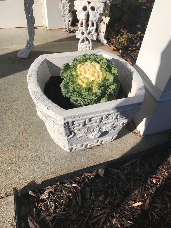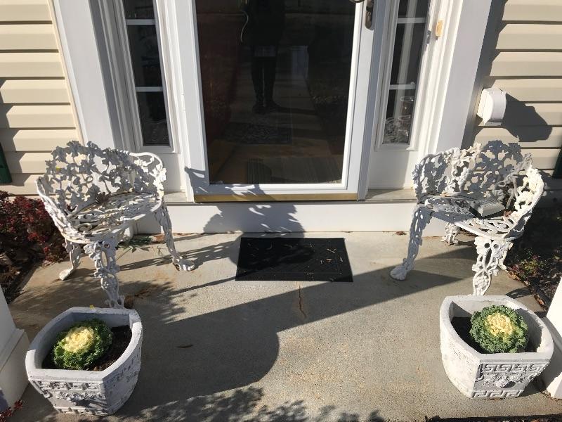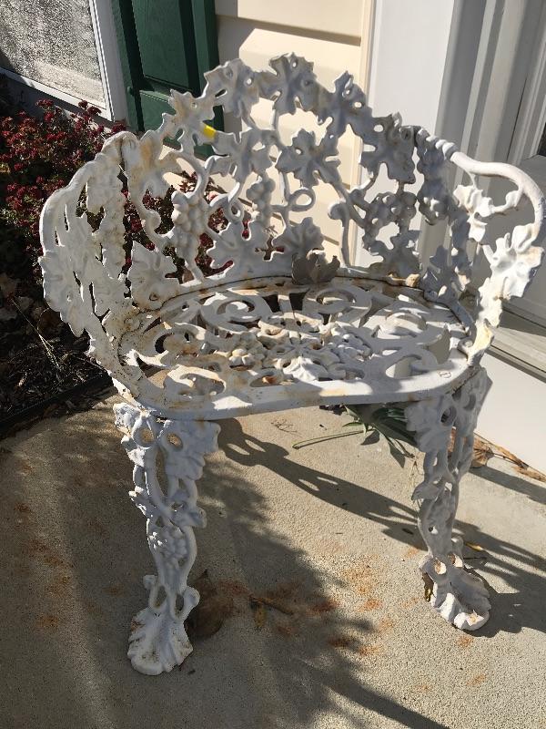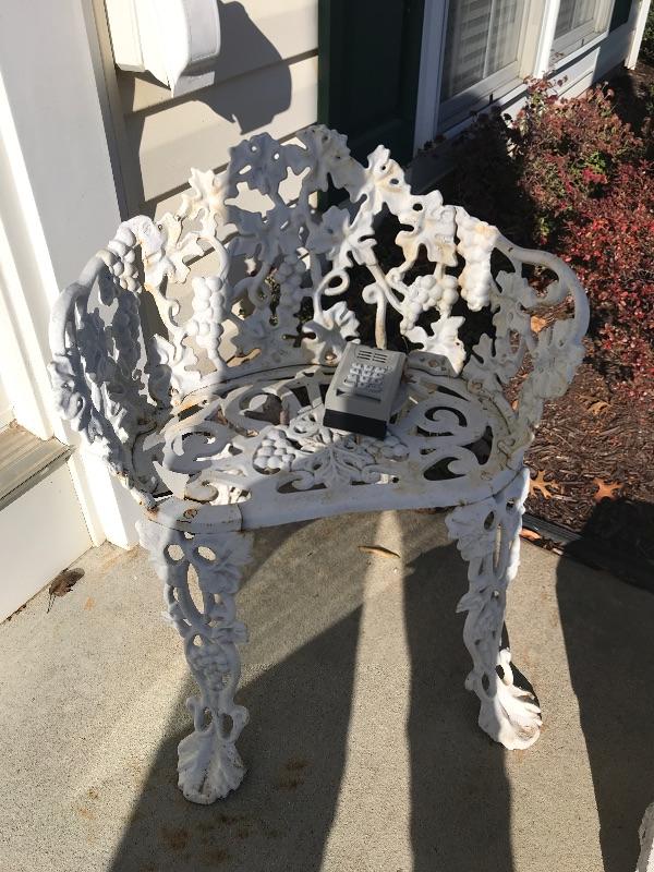 Lot of two iron chairs (one needs leg repair) and two cement pots