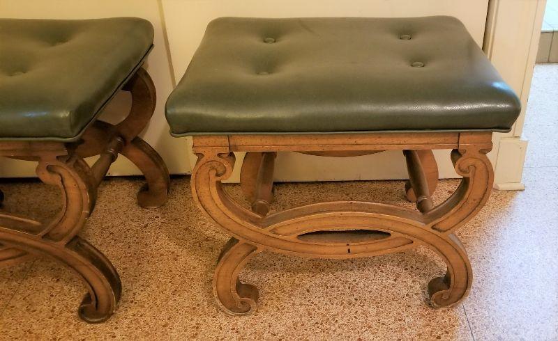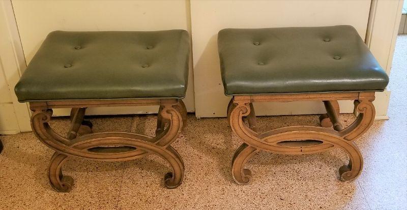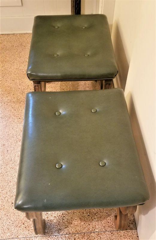 Matched paid of Mid Century stools - olive green Leatherette cover. Minor wear - see photos. 17" tall, 21" x 17".