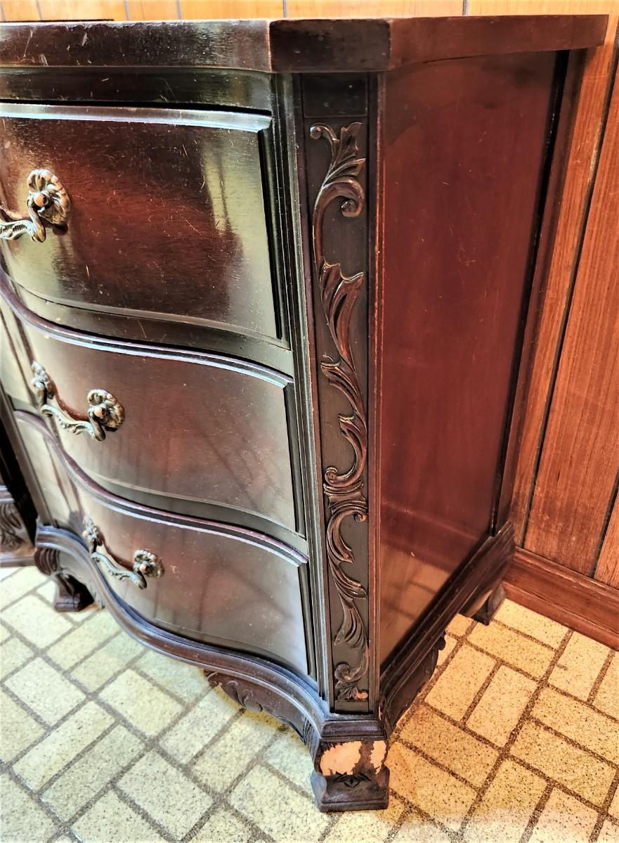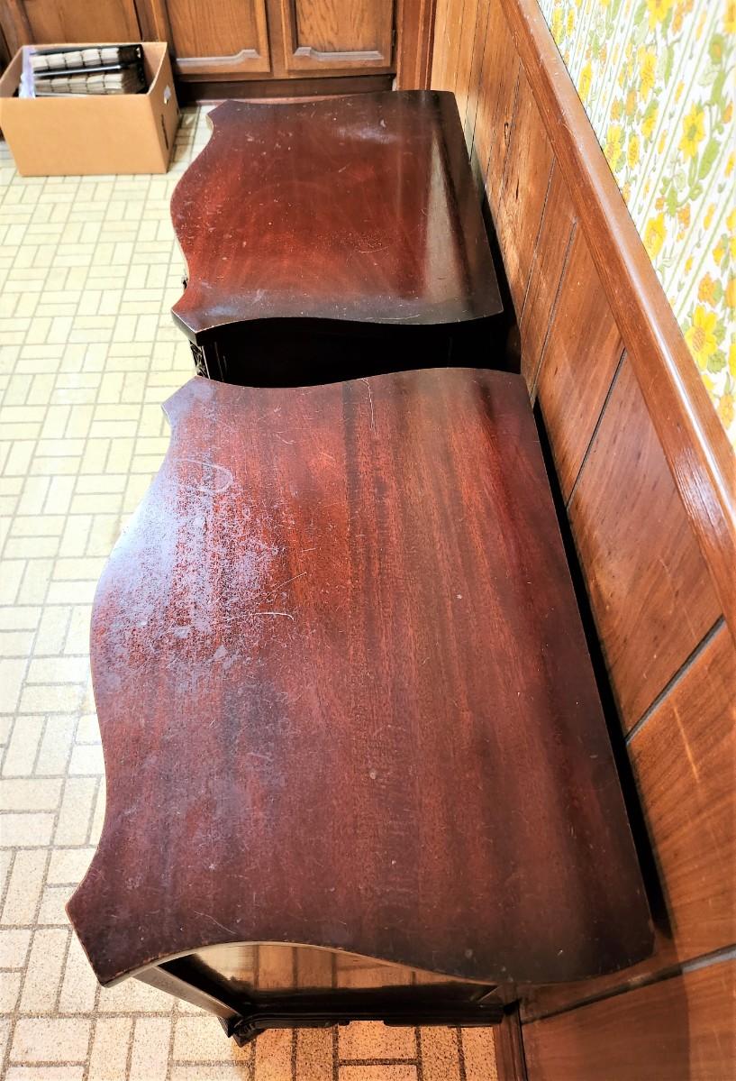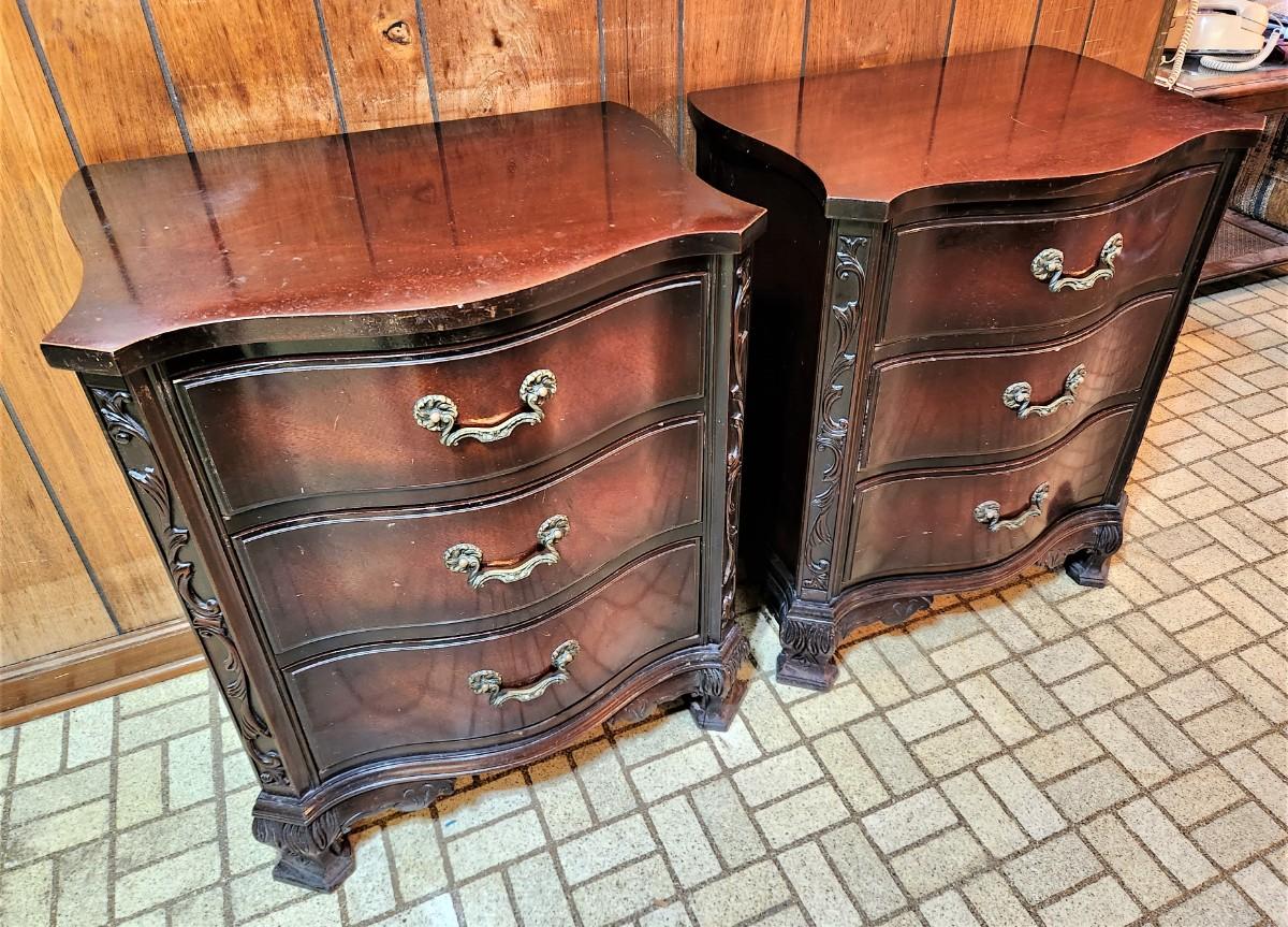 Pair of Mahogany-finish vintage nightstands, three drawers - no maker noted. 23" across, 16.5" deep, 28" tall. One has a veneer issue at the front foot, but we have the piece to glue back into place. Vintage condition. Original hardware. With a little love these could be brought back to life.