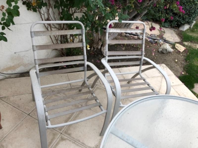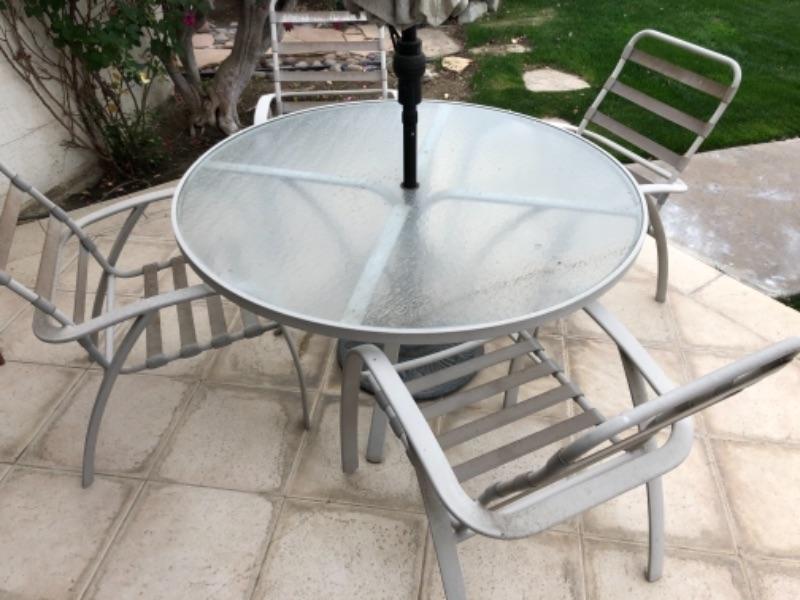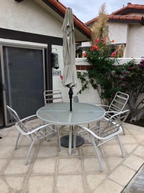 Lot 107. Patio table and four chairs, small side table, umbrella with stand--WAS $35““NOW $26.25