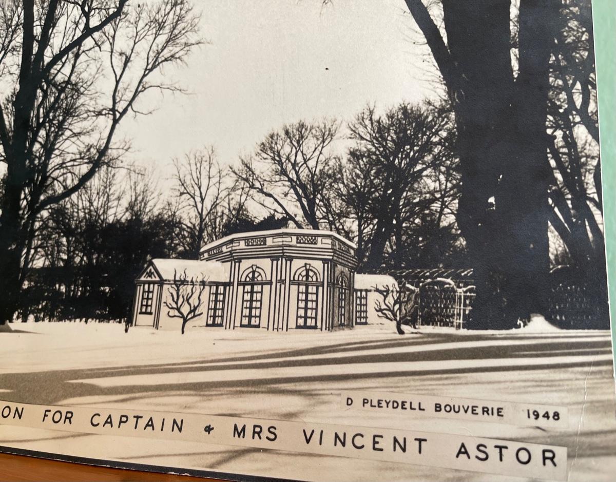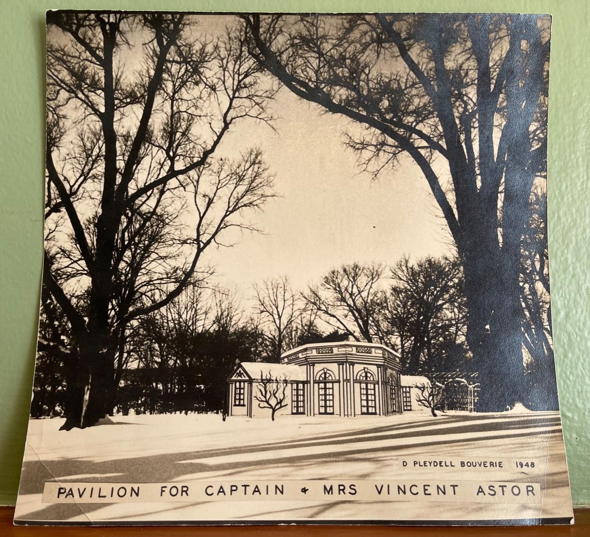 LOT 107 - Photograph - Pavilion for Captain - Vincent Astor (the building later to be named The Tea Room). At one point David appears to have been in the role of architect for Vincent Astor. Blue prints would suggest otherwise we discovered after some research. The actual building still standing though looks very similar to this altered photo that David created. It's a silver gelatin photo. David was married to Vincent's sister Ava Alice Astor from 1946-1952. This item is part of the David-Pleydell-Bouverie Estate at Bouverie Ranch in Glen Ellen. This item can be viewed at our Green + Cate Showroom in Sebastopol from July 15th - July 18th between the hours of 9am-5pm. For the benefit of the Bouverie Preserve of Audubon Canyon Ranch.