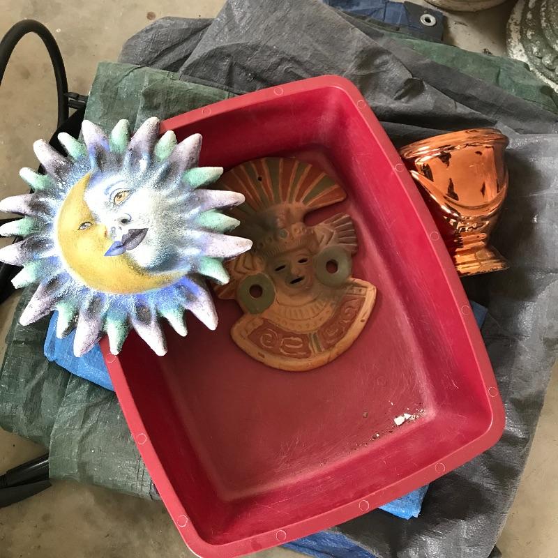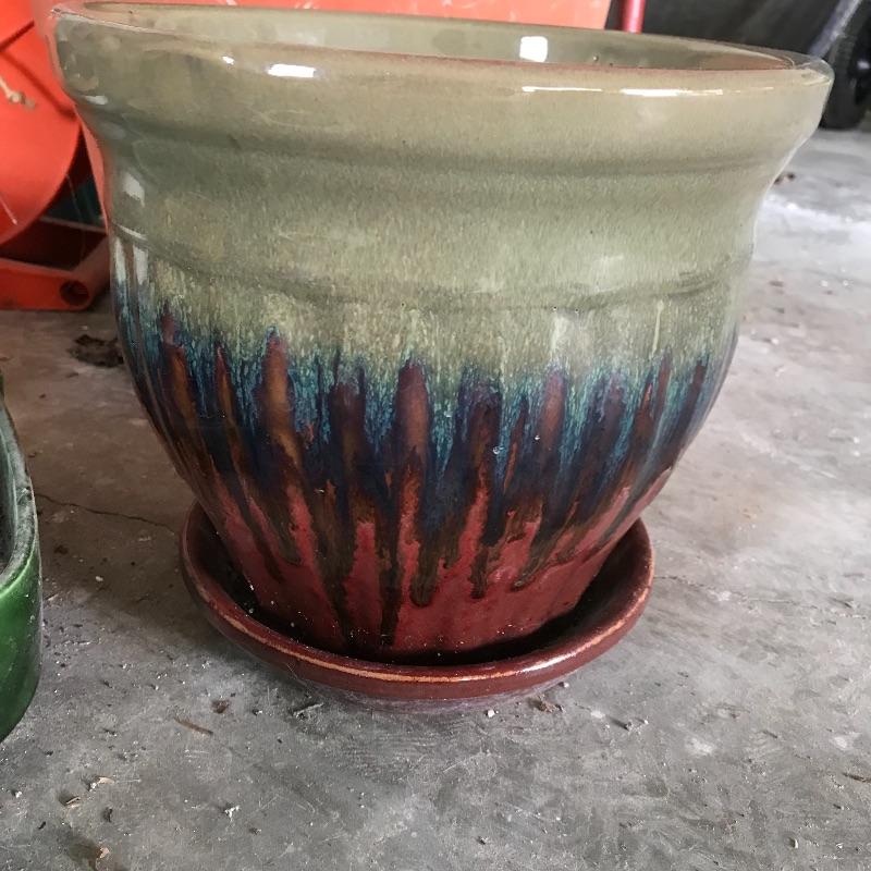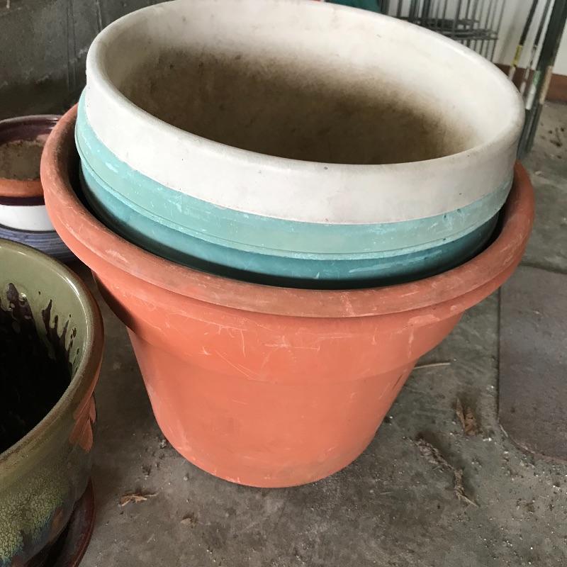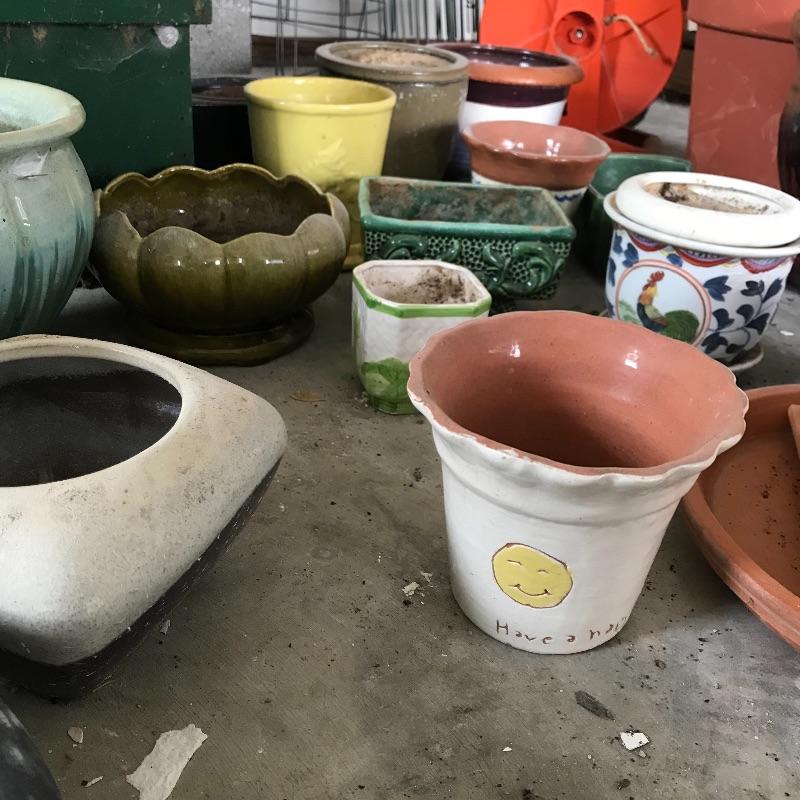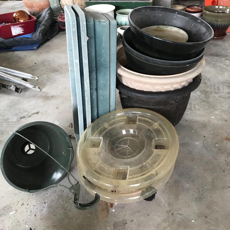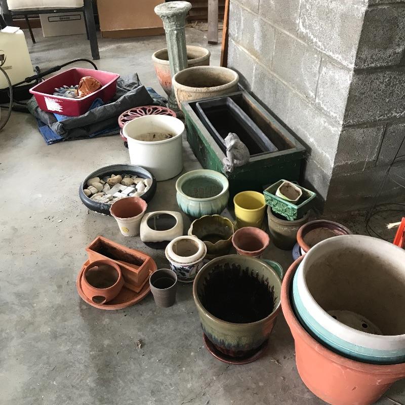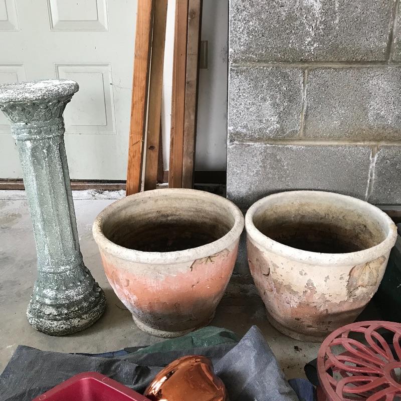 Lovely collection of various sizes planters. Pottery, ceramic, plastic and terra cotta. Two red set rollers, a large green box and other decor. Lot also includes plastic rollers tarps and more. Pillar measures 24” high. Green rectangle wooden box measures 26.5” x 13.5” x 10” See photos. No shipping.