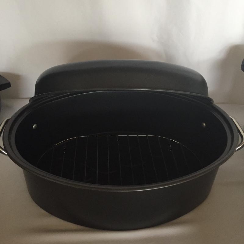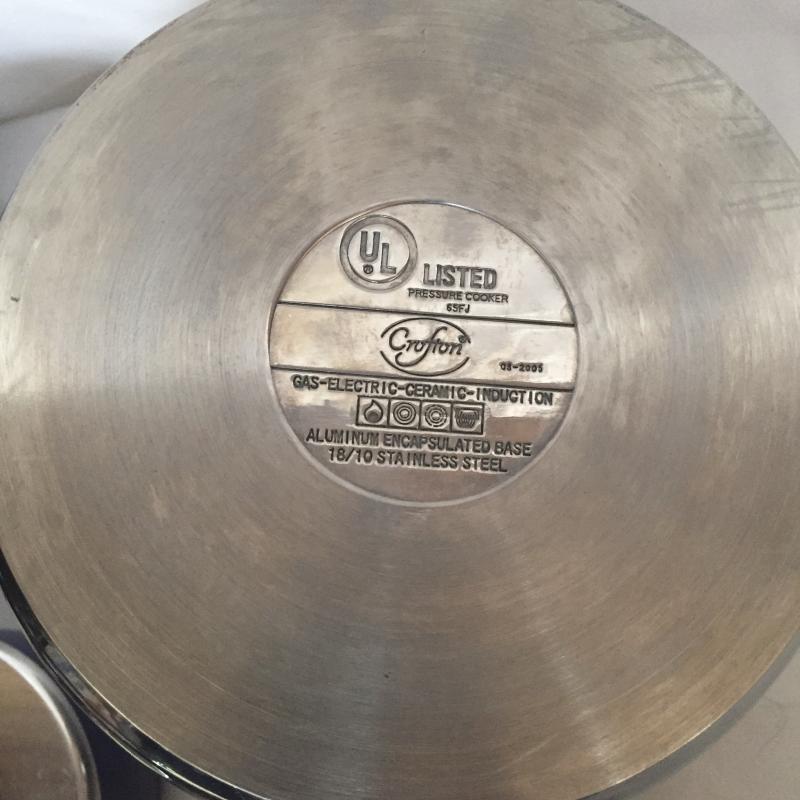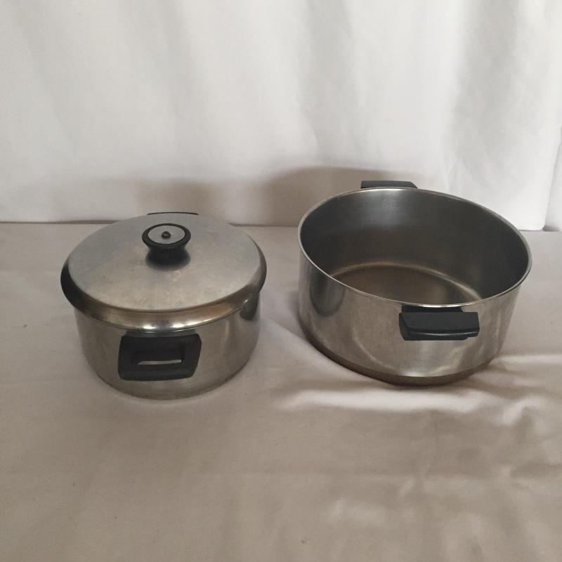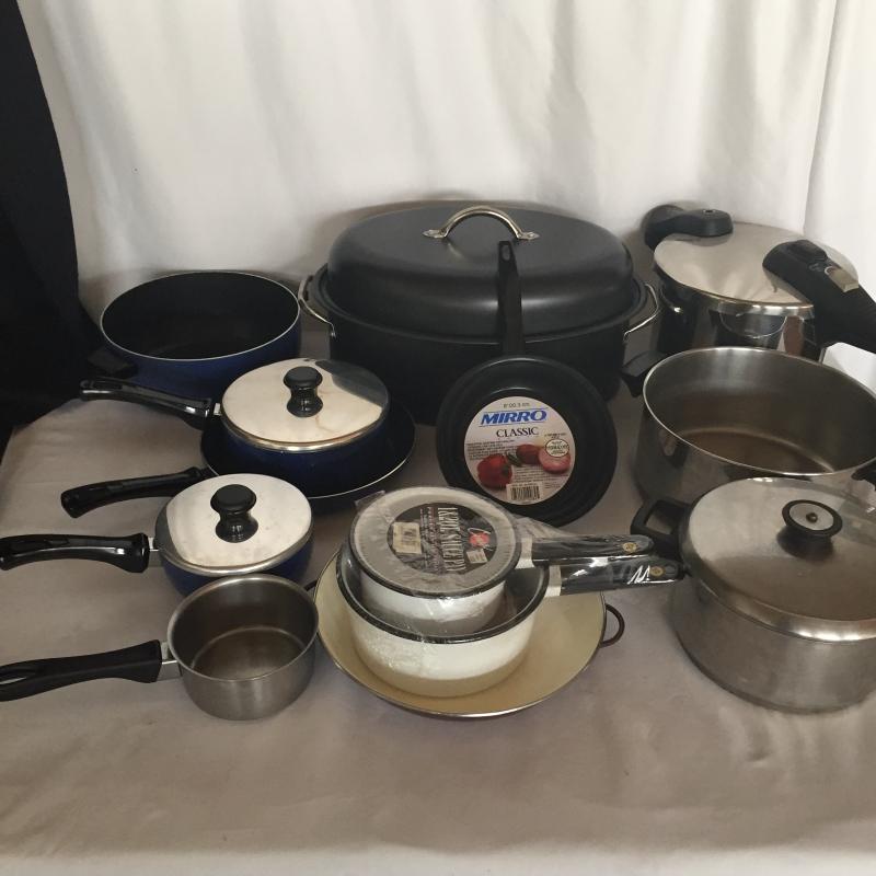 Crouton Pressure Cooker,Roasting Pan, Mirro Frying Pans, Revere Sauce Pans and More. Pressure Cooker Measures 9”D. Roasting Pan Measures 12” x 16” x 5.5”.