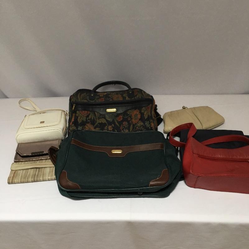 Purses and more includes Liz Claiborne purse, Jones New York wallet, two unbranded purses, two Jaguar bags and suit bag.