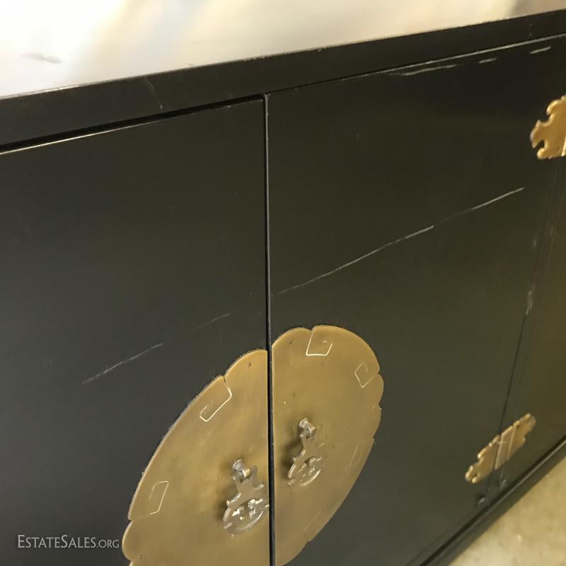 Cabinet with an internal drawer on one side and two shelves in each. Brass fixtures. Scratches on top and front. Made by Sanfor Furniture Company. Piece measures 6" x15.5" x 30". This lot is avaiable for local pick up in Waynesville, NC only.