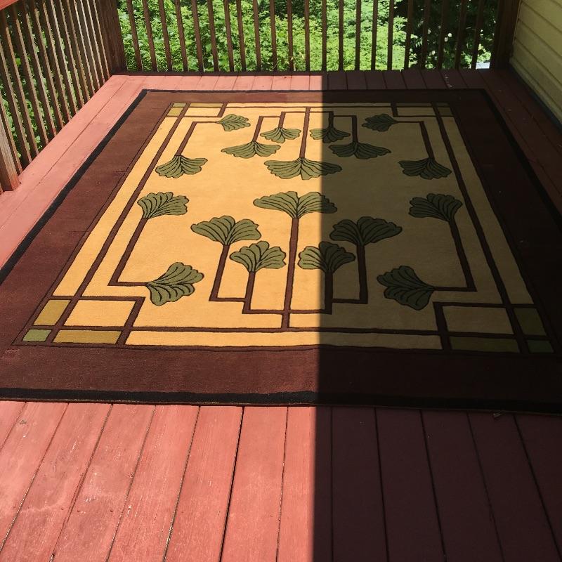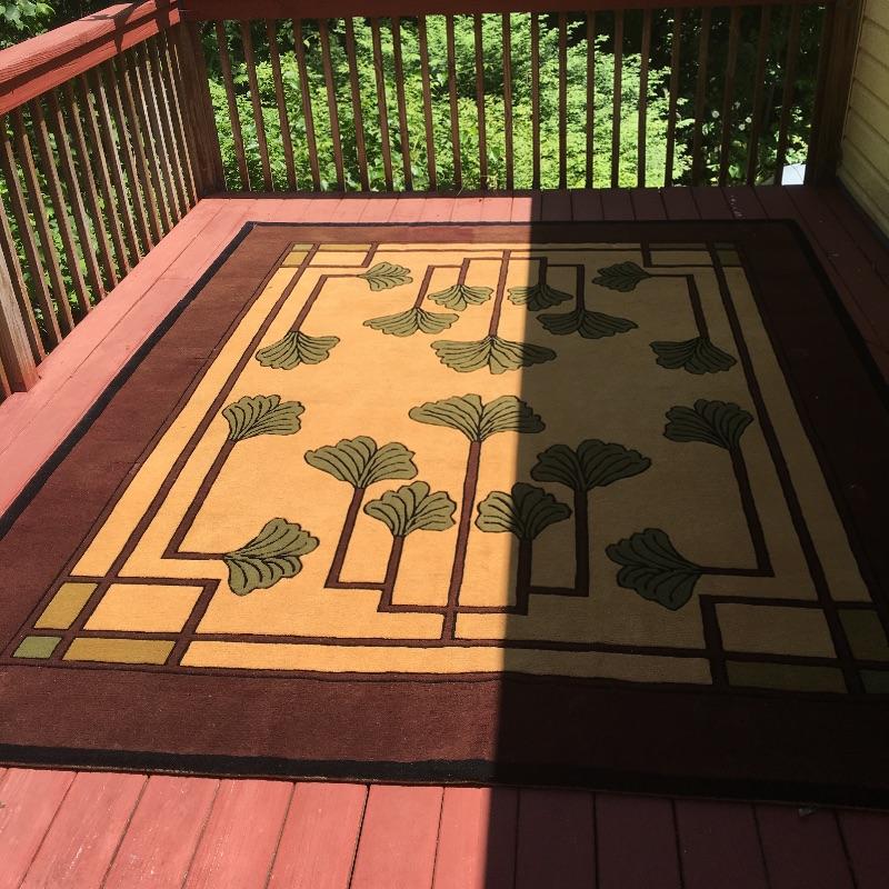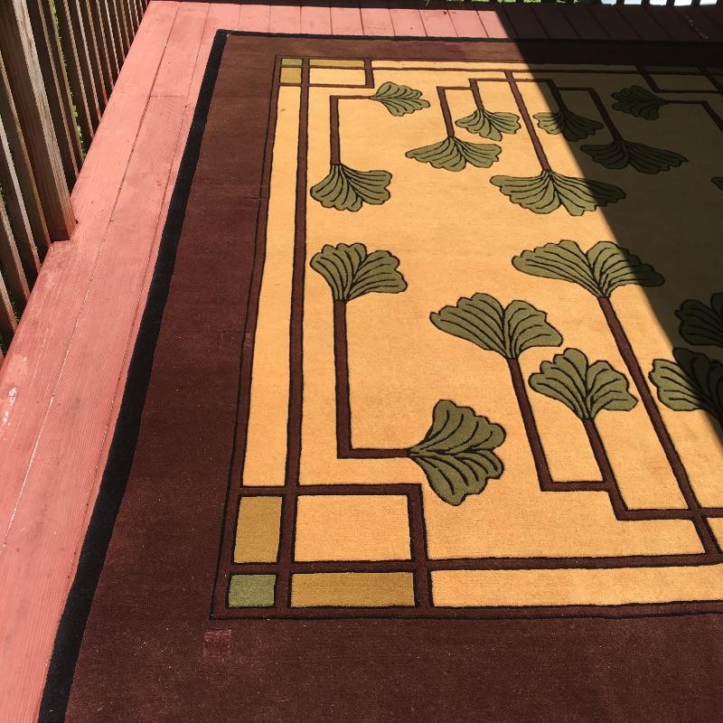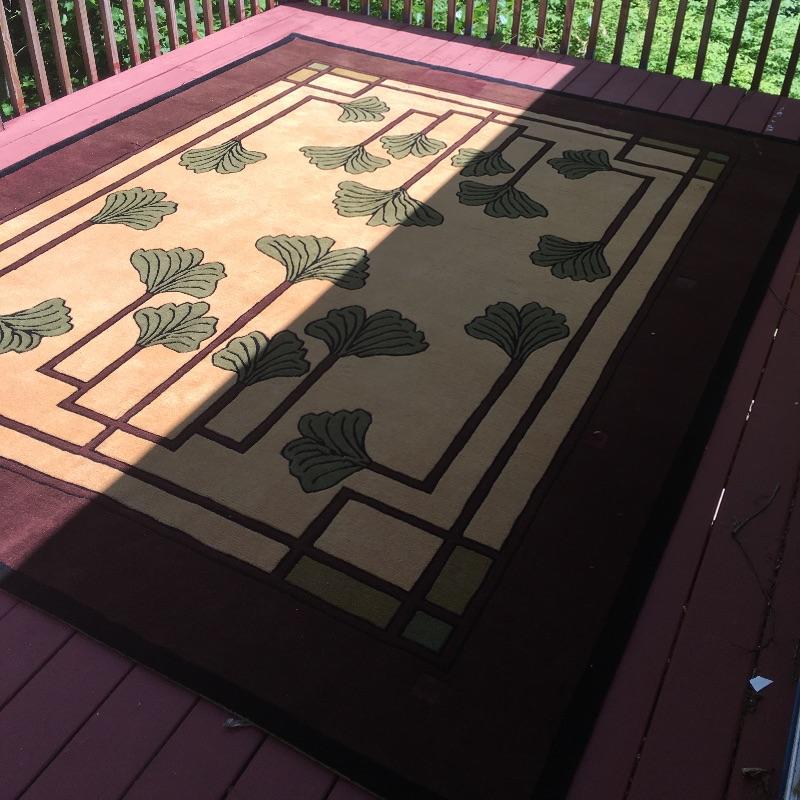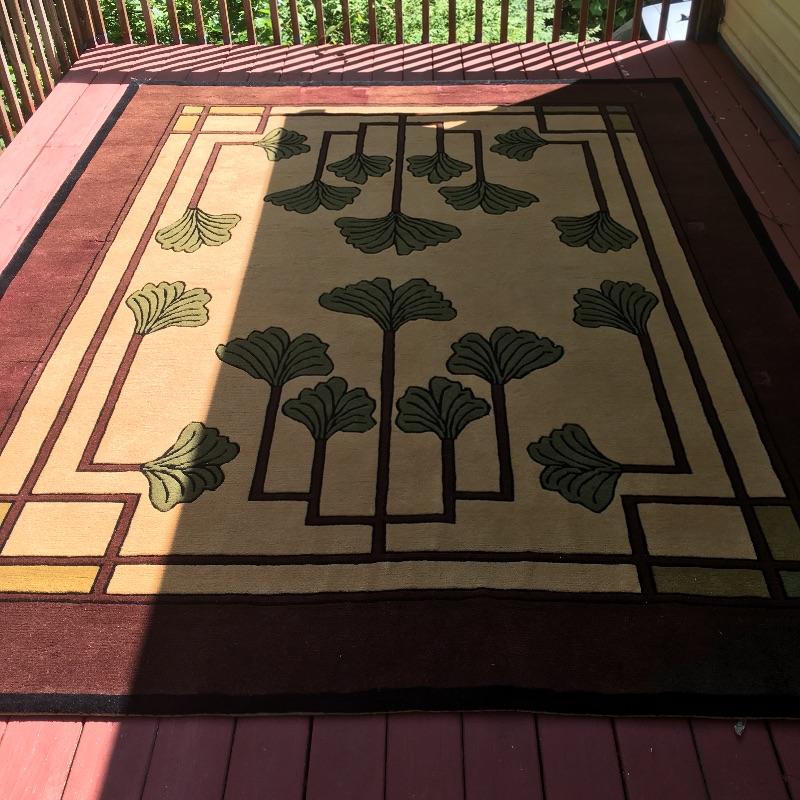 Stickley Ginko Tree rug is hand woven and in excellent condition. Pictures don’t do this rug justice as the sun shadows didn't help us. it is absolutely stunning, a work of art. You will regret it if you don’t buy this beauty. Rug measures 96” x 120”. Bring help item is substantial. Rug is in great shape with no stains or smells, but pictures are half in shade.