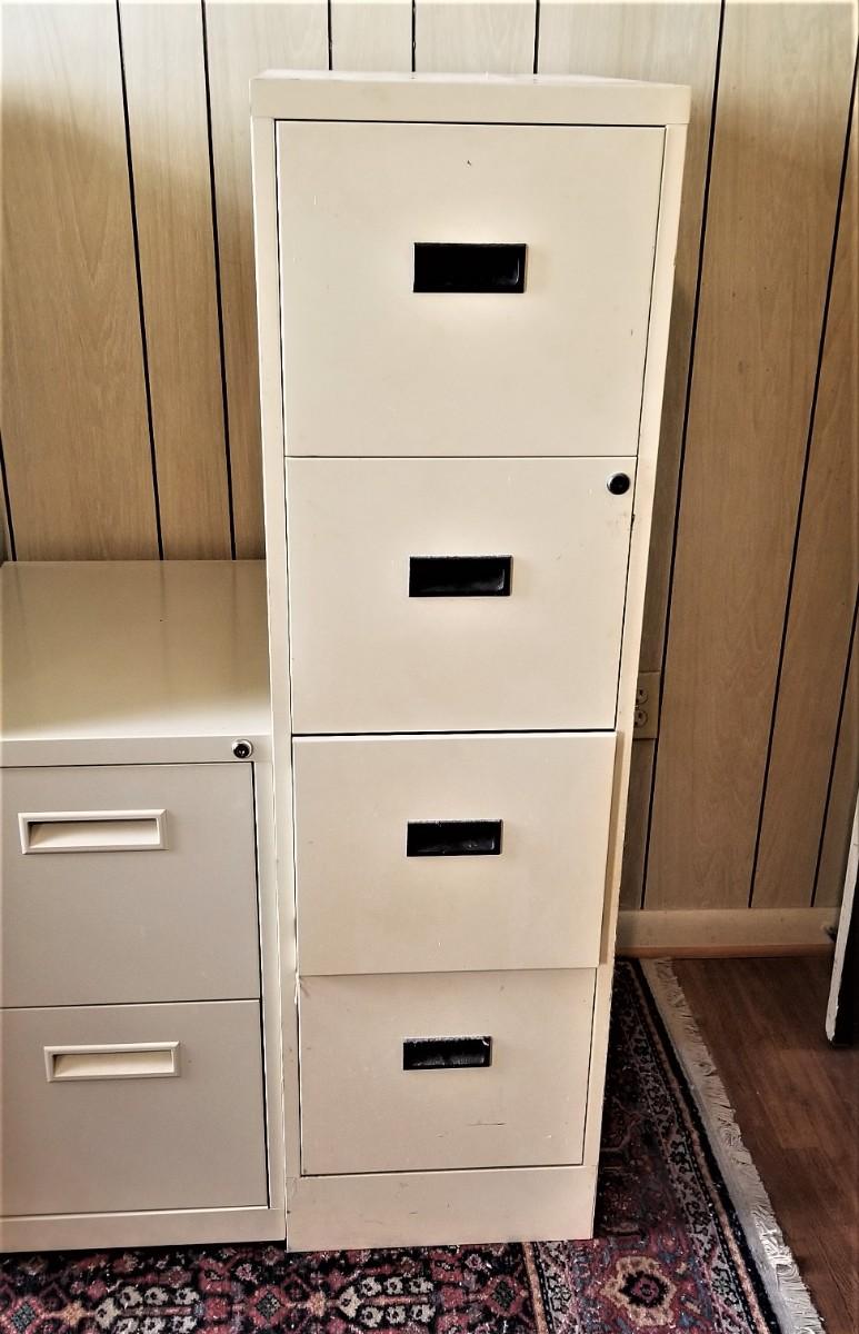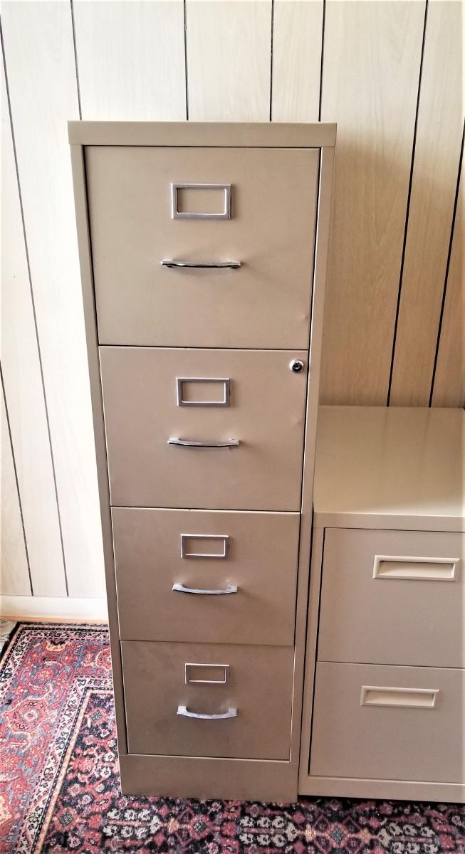 Group of three metal file cabinets - two large and one small - all letter-sized. The two drawer cabinet locks and has the key. Large ones are 52" tall, 22" Deep, and 15 "across. The smaller one is 27.5" tall. Good used condition.